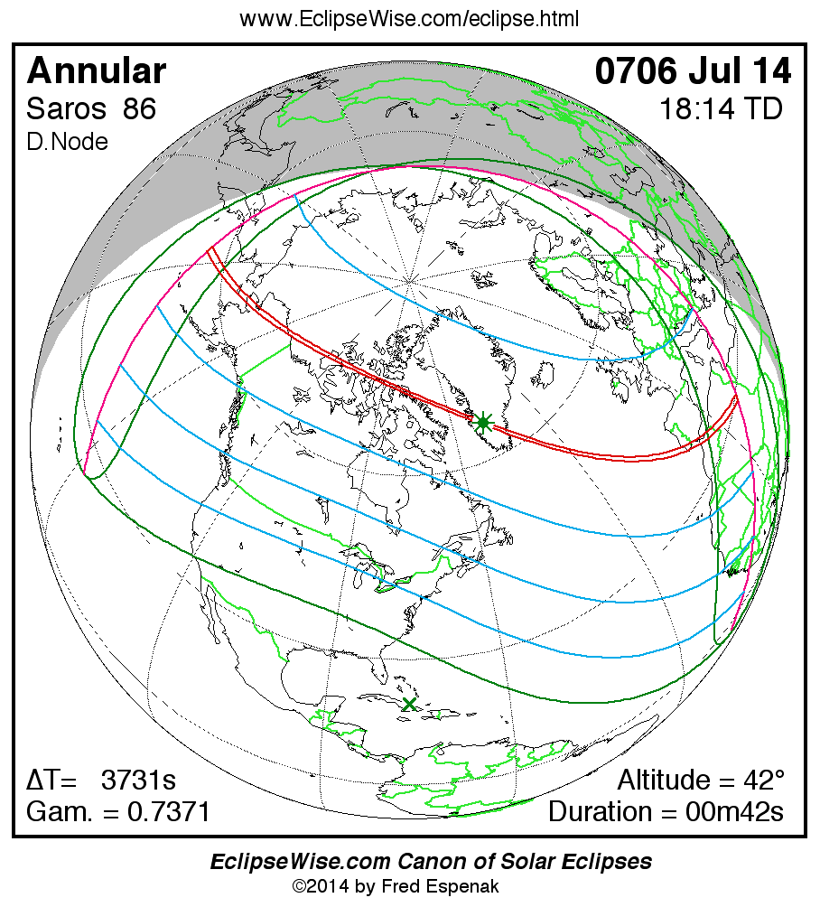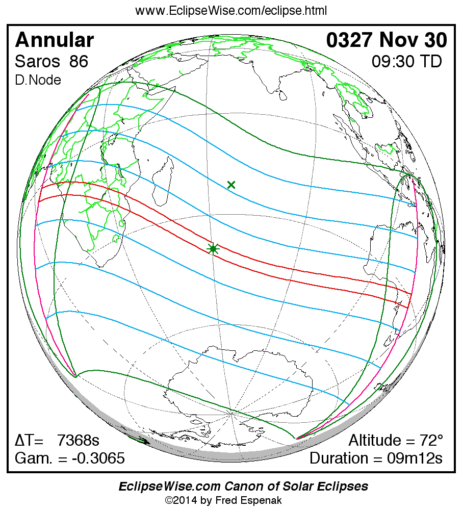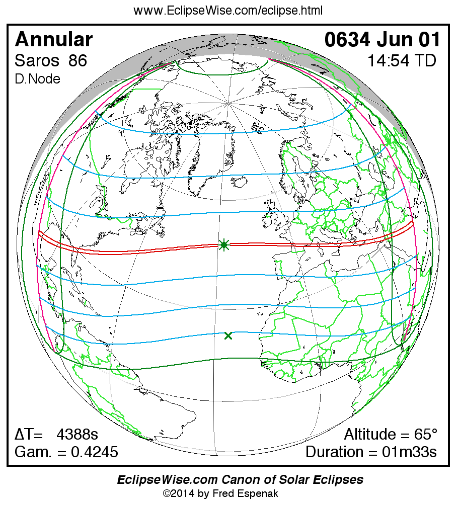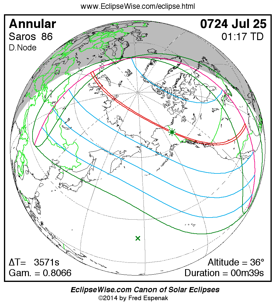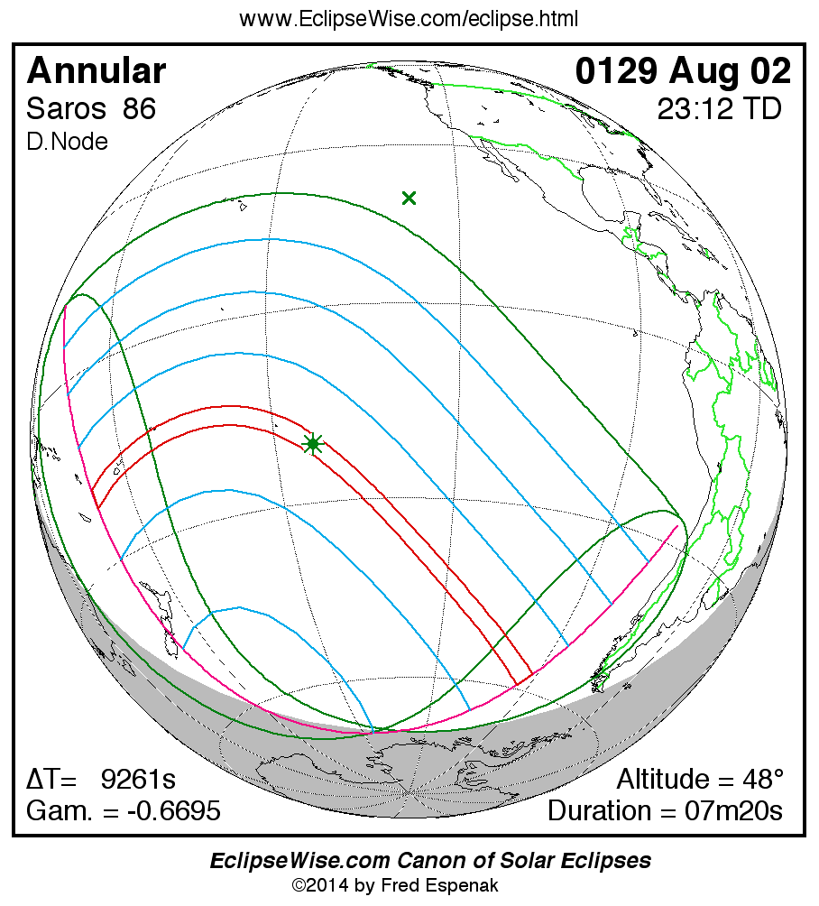 A panorama of all solar eclipses belonging to Saros 86 is presented here. Each map depicts the geographic region of visibility for a single eclipse. For central eclipses, the total or annular path is plotted in either blue (total) or red (annular). The date and time is given for the instant of Greatest Eclipse. Every map serves as a hyperlink to the EclipseWise Prime page for that eclipse where a larger map and complete details for the eclipse can be found. Visit the Key to Solar Eclipse Maps for a detailed explanation of these maps. Near the bottom of the page are a series of hyperlinks for more on solar eclipses.
