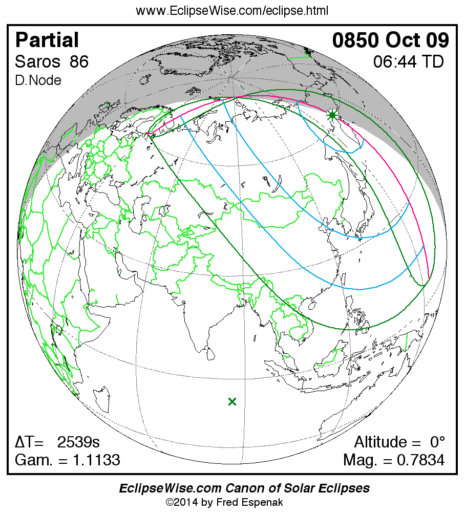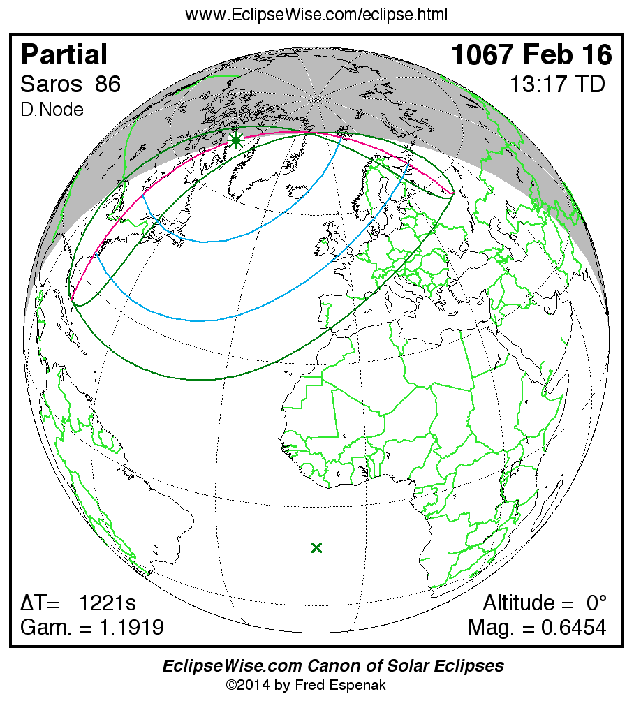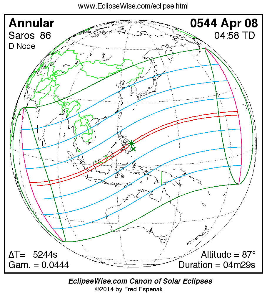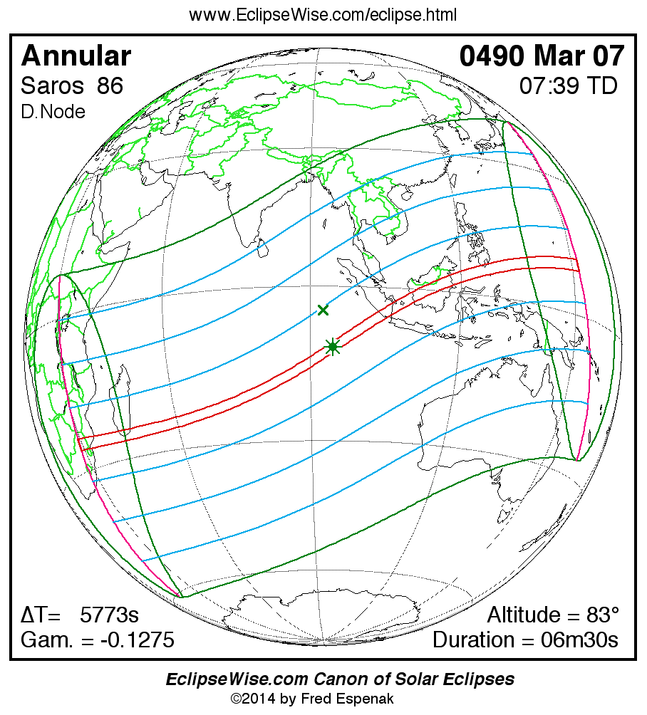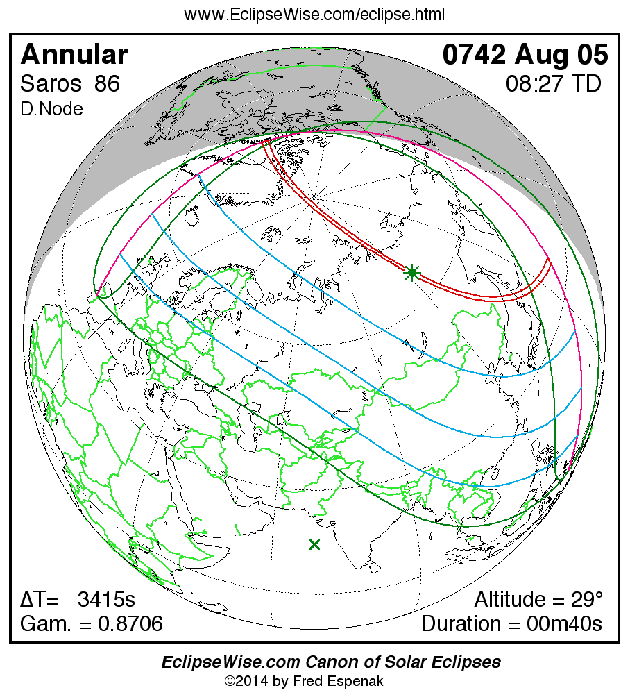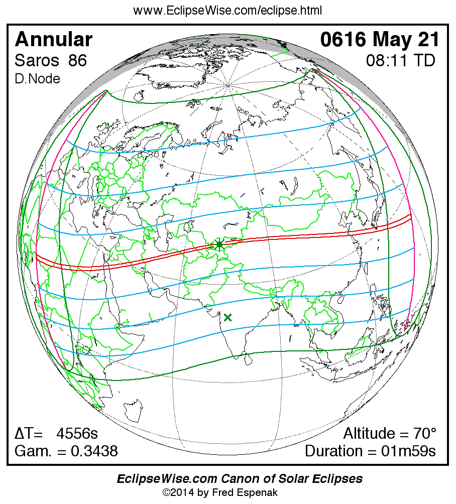 A panorama of all solar eclipses belonging to Saros 86 is presented here. Each map depicts the geographic region of visibility for a single eclipse. For central eclipses, the total or annular path is plotted in either blue (total) or red (annular). The date and time is given for the instant of Greatest Eclipse. Every map serves as a hyperlink to the EclipseWise Prime page for that eclipse where a larger map and complete details for the eclipse can be found. Visit the Key to Solar Eclipse Maps for a detailed explanation of these maps. Near the bottom of the page are a series of hyperlinks for more on solar eclipses.