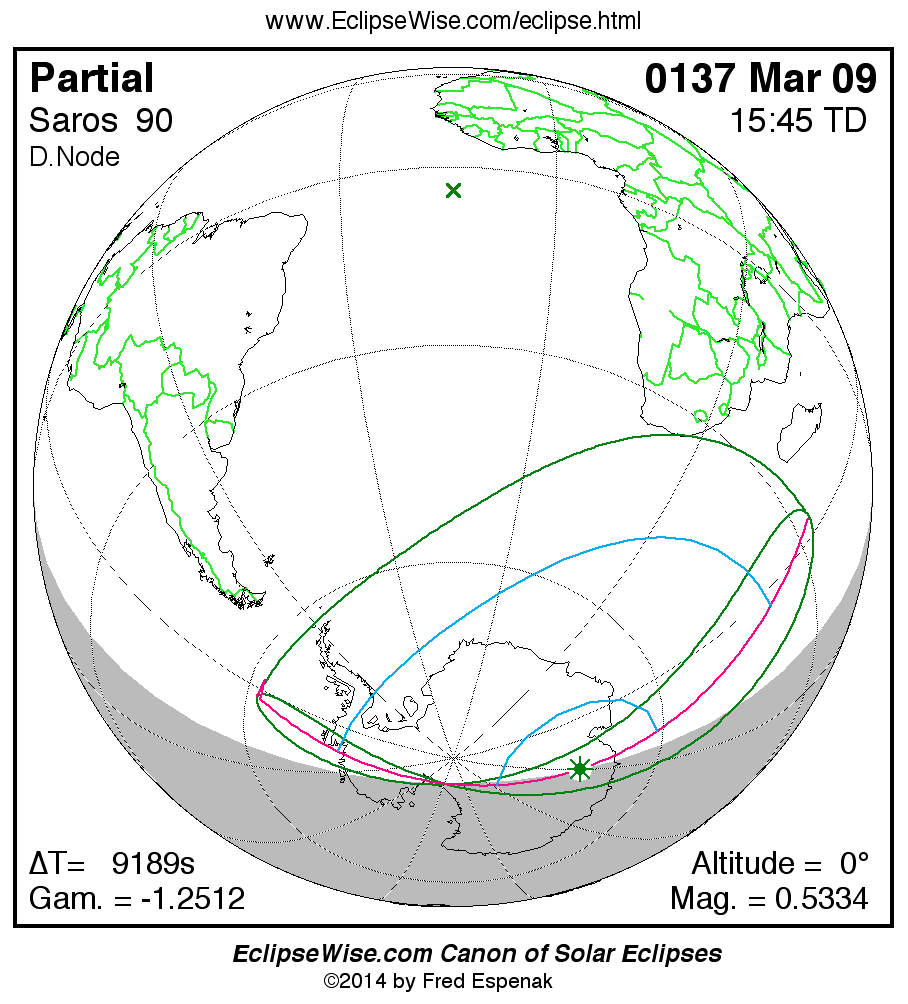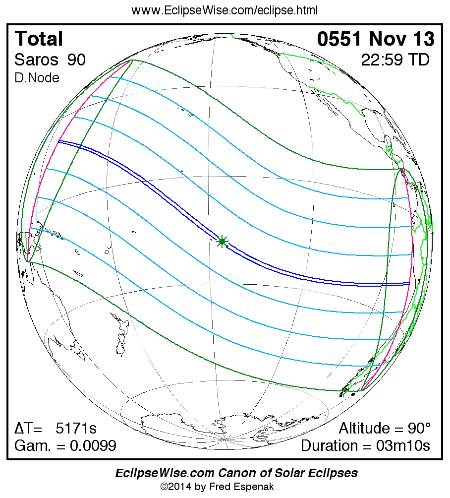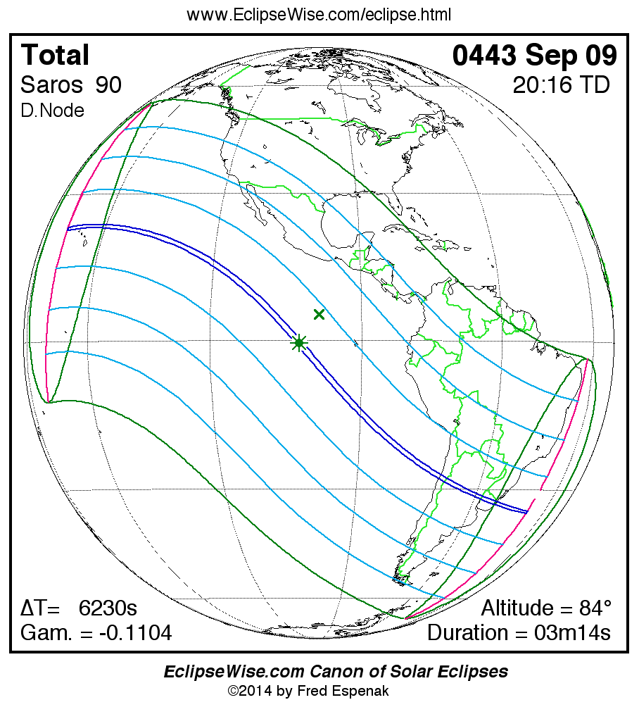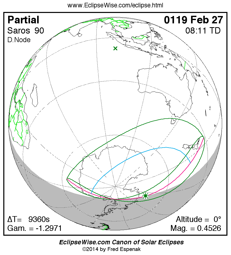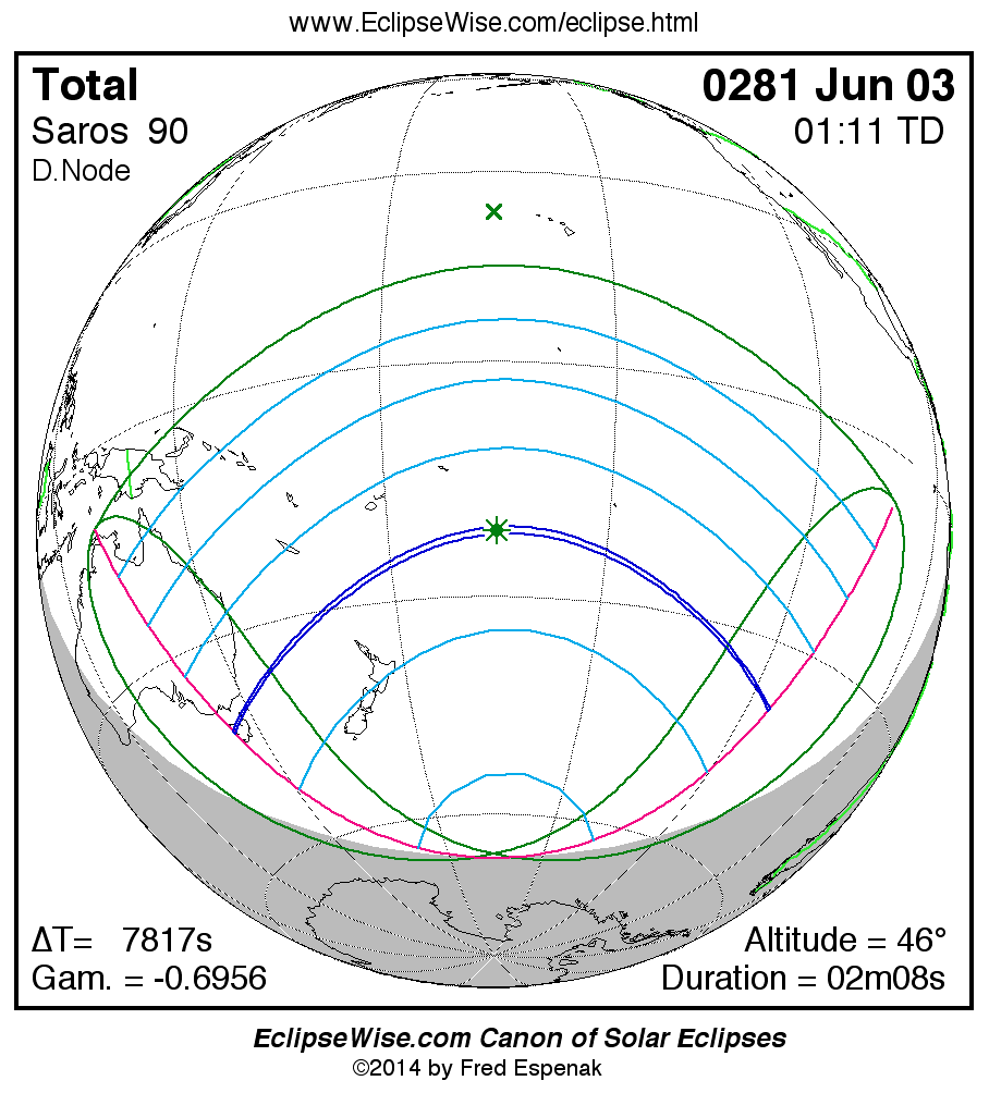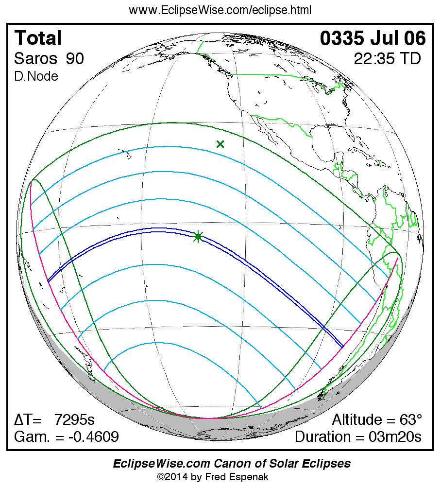 A panorama of all solar eclipses belonging to Saros 90 is presented here. Each map depicts the geographic region of visibility for a single eclipse. For central eclipses, the total or annular path is plotted in either blue (total) or red (annular). The date and time is given for the instant of Greatest Eclipse. Every map serves as a hyperlink to the EclipseWise Prime page for that eclipse where a larger map and complete details for the eclipse can be found. Visit the Key to Solar Eclipse Maps for a detailed explanation of these maps. Near the bottom of the page are a series of hyperlinks for more on solar eclipses.