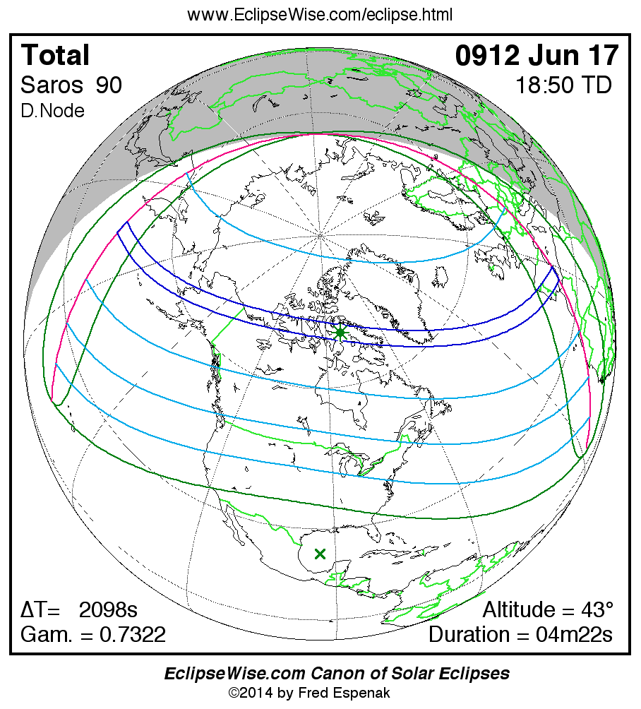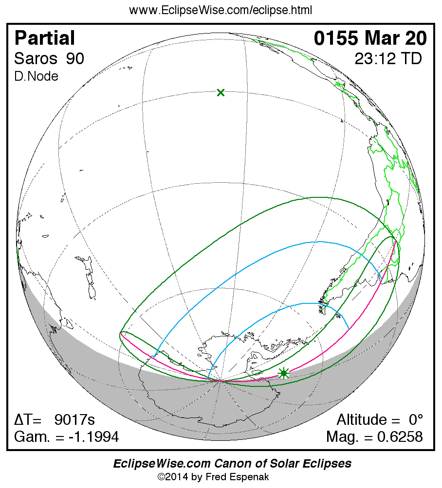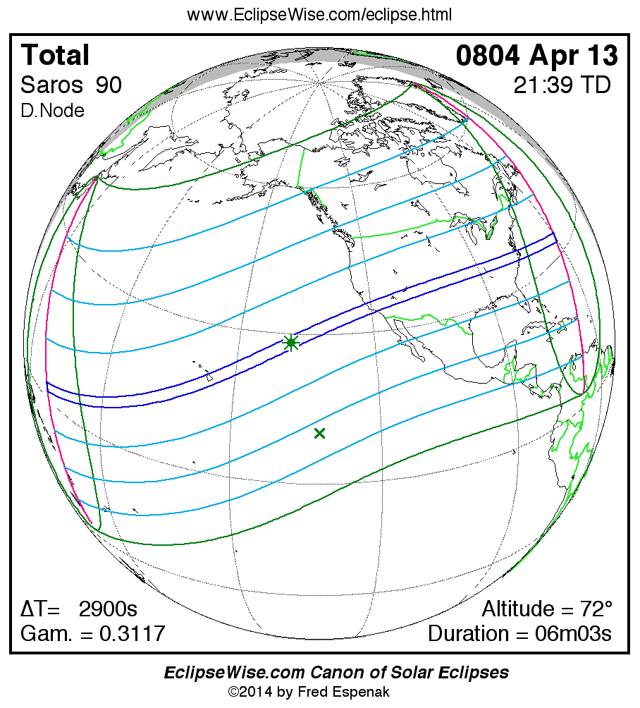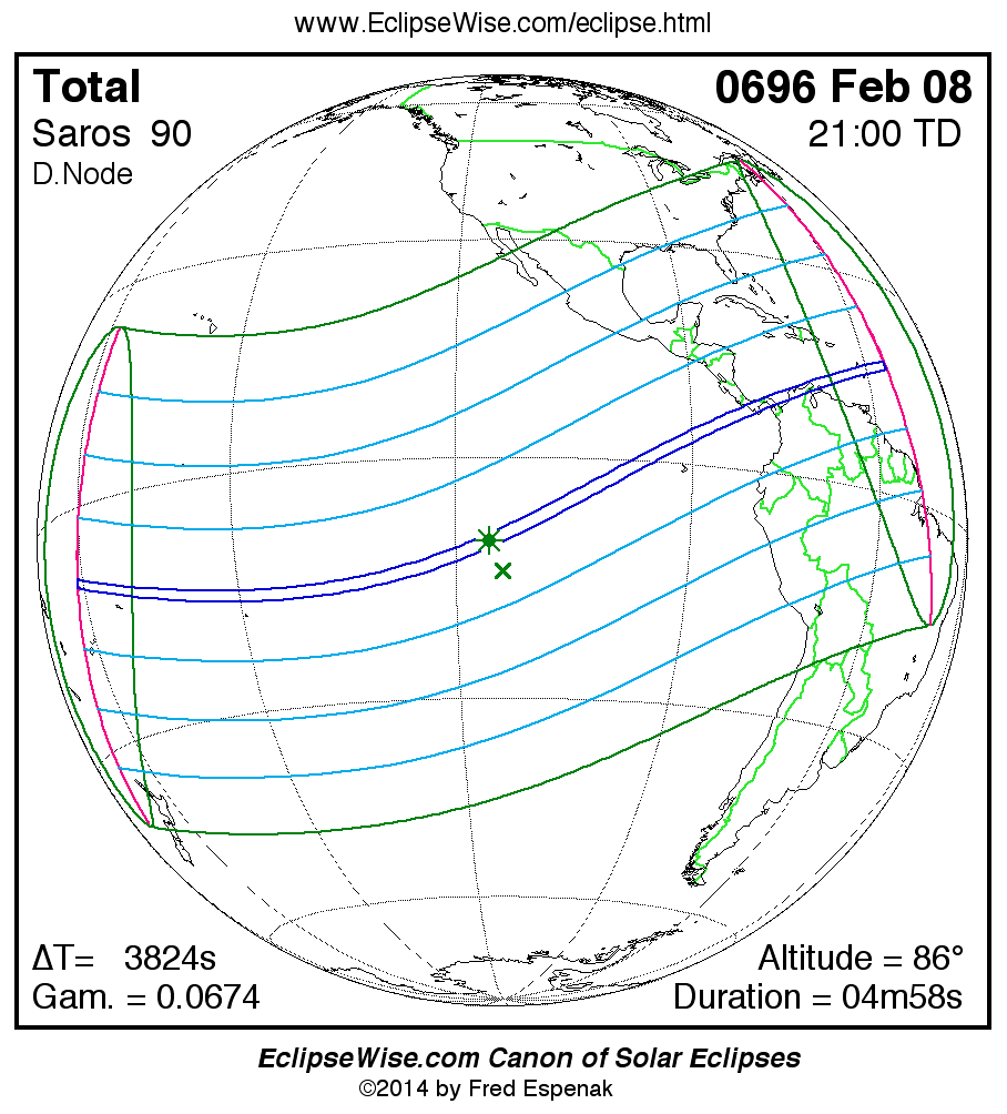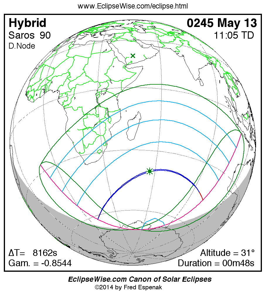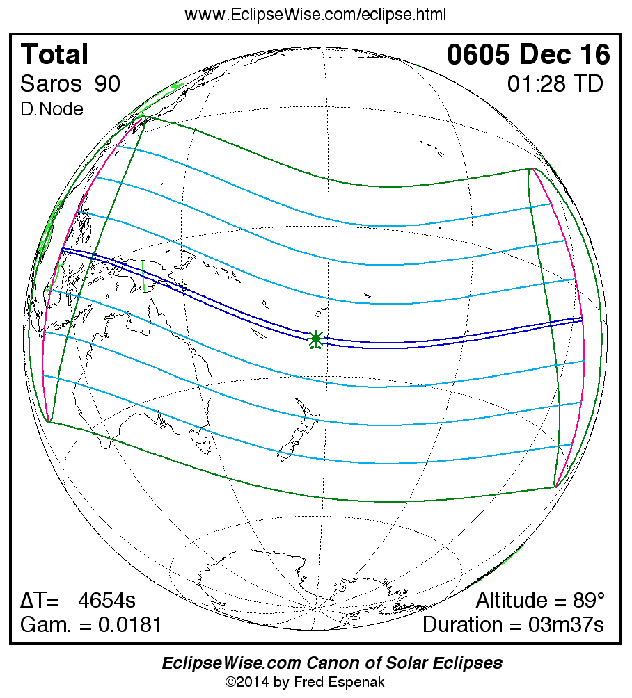 A panorama of all solar eclipses belonging to Saros 90 is presented here. Each map depicts the geographic region of visibility for a single eclipse. For central eclipses, the total or annular path is plotted in either blue (total) or red (annular). The date and time is given for the instant of Greatest Eclipse. Every map serves as a hyperlink to the EclipseWise Prime page for that eclipse where a larger map and complete details for the eclipse can be found. Visit the Key to Solar Eclipse Maps for a detailed explanation of these maps. Near the bottom of the page are a series of hyperlinks for more on solar eclipses.