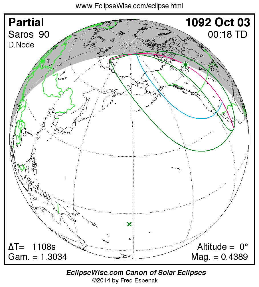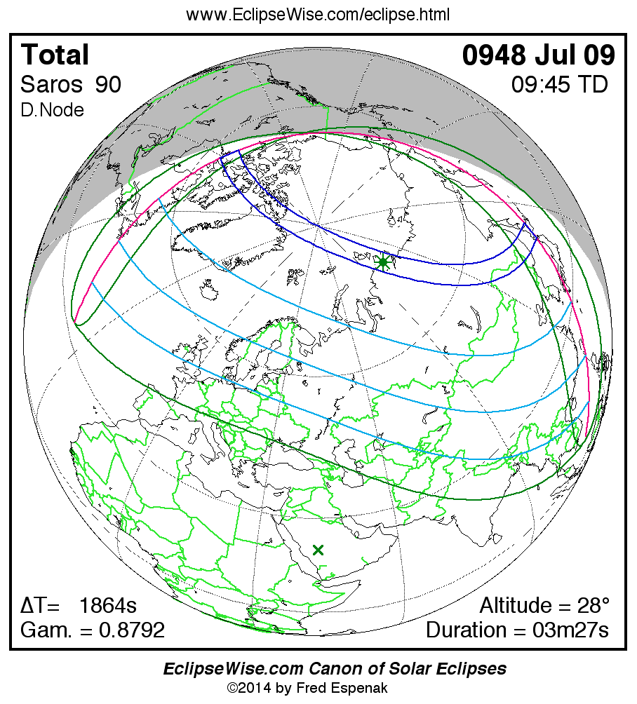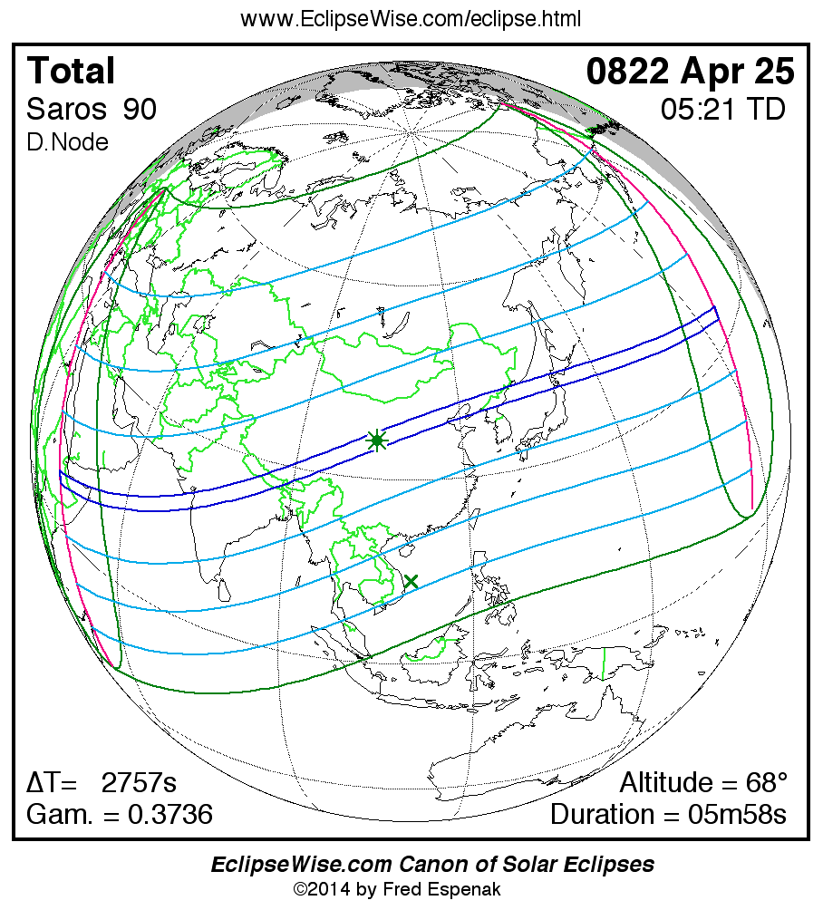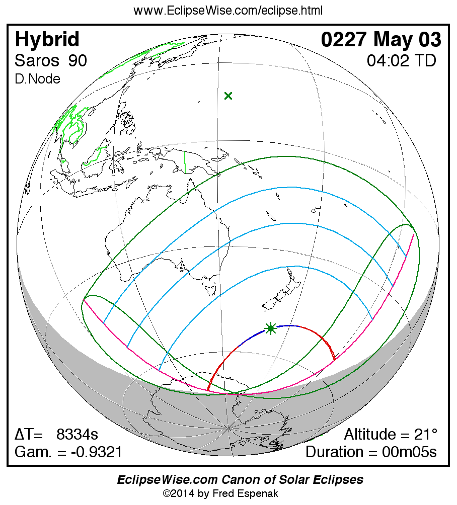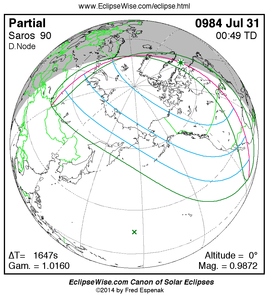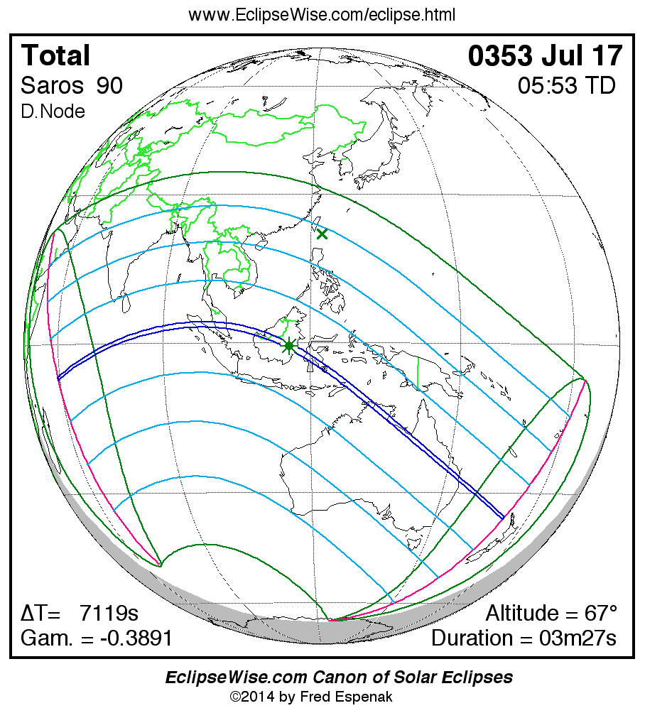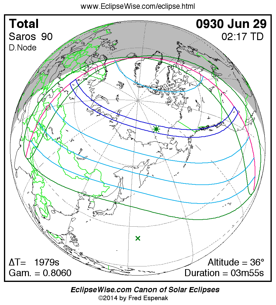 A panorama of all solar eclipses belonging to Saros 90 is presented here. Each map depicts the geographic region of visibility for a single eclipse. For central eclipses, the total or annular path is plotted in either blue (total) or red (annular). The date and time is given for the instant of Greatest Eclipse. Every map serves as a hyperlink to the EclipseWise Prime page for that eclipse where a larger map and complete details for the eclipse can be found. Visit the Key to Solar Eclipse Maps for a detailed explanation of these maps. Near the bottom of the page are a series of hyperlinks for more on solar eclipses.