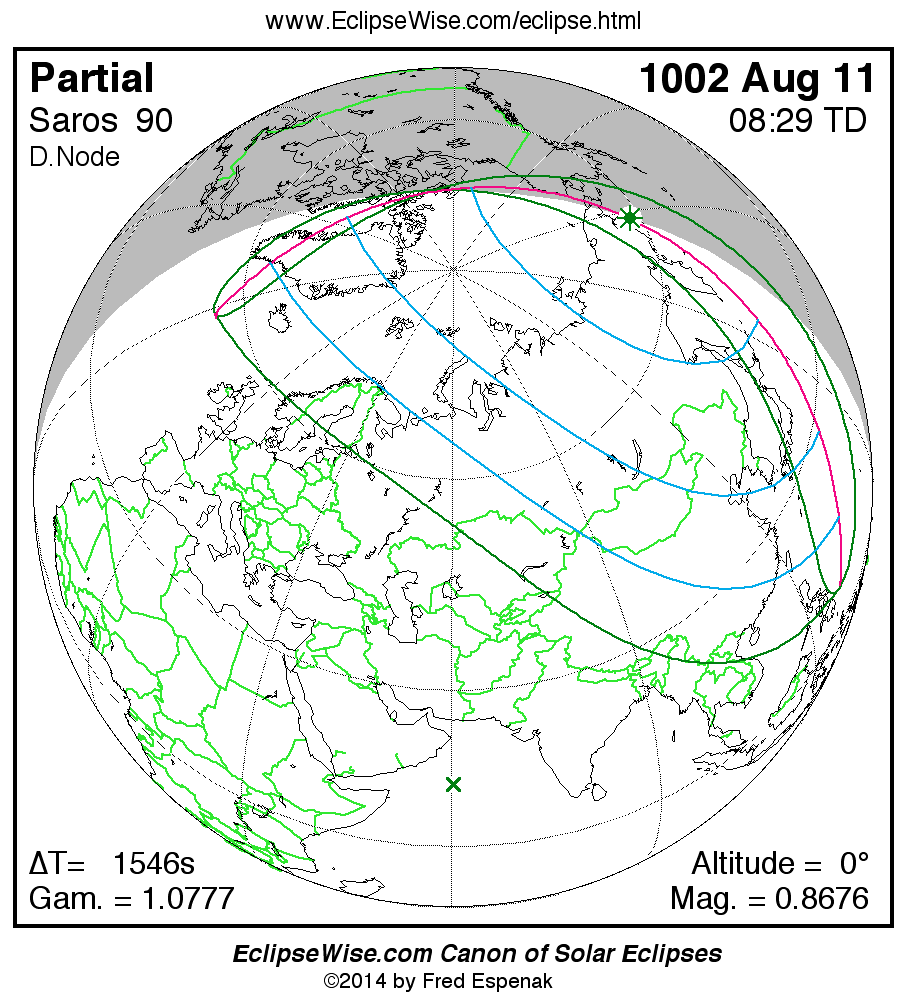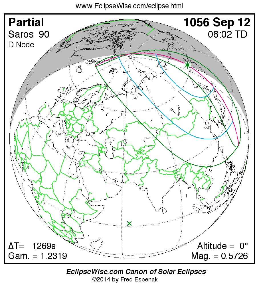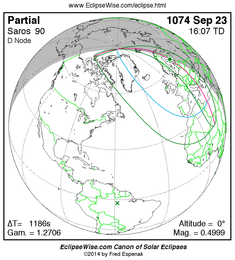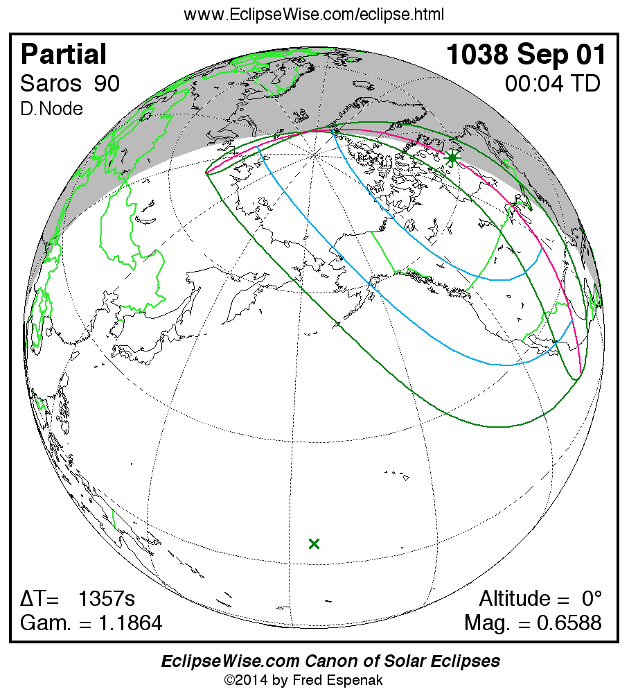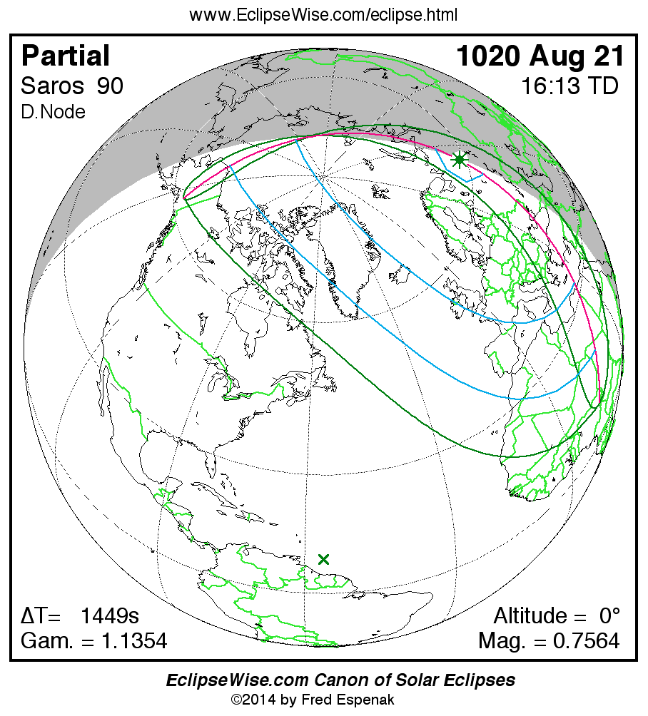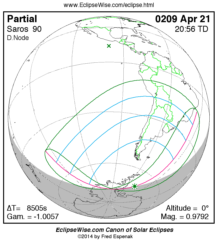 A panorama of all solar eclipses belonging to Saros 90 is presented here. Each map depicts the geographic region of visibility for a single eclipse. For central eclipses, the total or annular path is plotted in either blue (total) or red (annular). The date and time is given for the instant of Greatest Eclipse. Every map serves as a hyperlink to the EclipseWise Prime page for that eclipse where a larger map and complete details for the eclipse can be found. Visit the Key to Solar Eclipse Maps for a detailed explanation of these maps. Near the bottom of the page are a series of hyperlinks for more on solar eclipses.