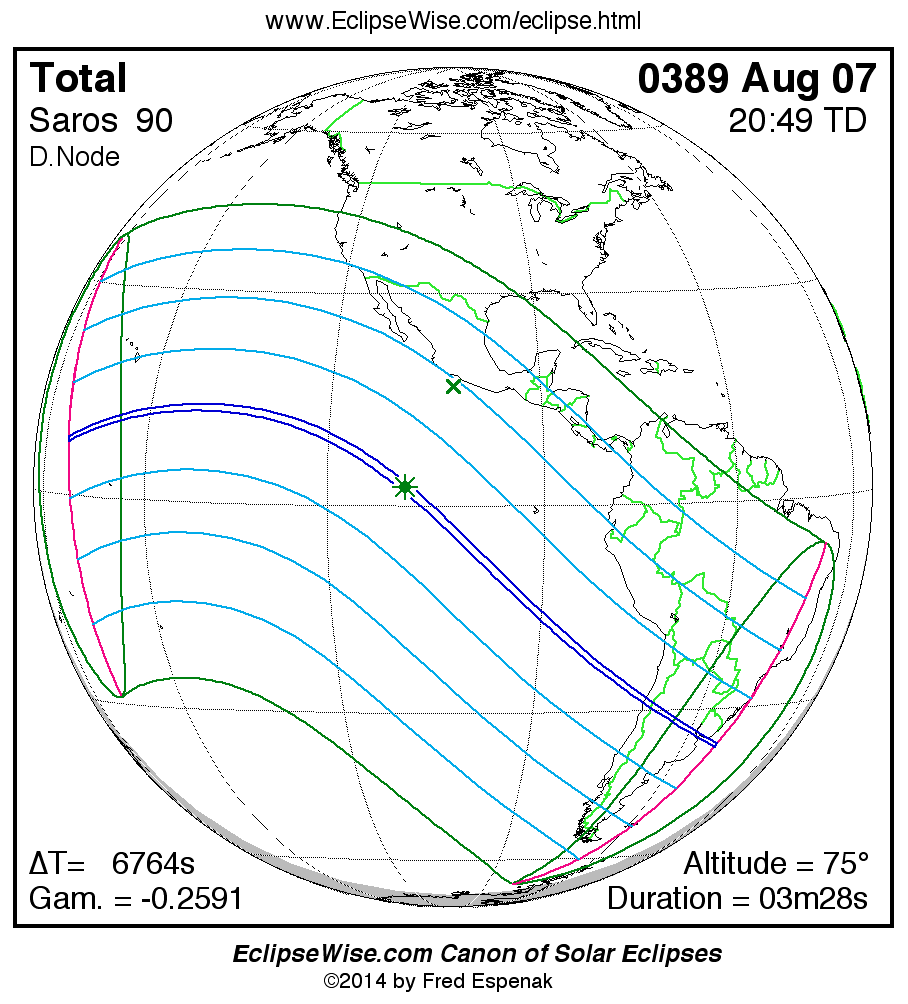 The Saros panorama below is arranged in horizontal rows of 3 eclipses. So one eclipse to the left or right is a difference of 1 Saros cycle, and one eclipse above or below is a difference of 1 exeligmos. By scanning a column of the table, it reveals how the geographic visibility of eclipses separated by an exeligmos slowly changes.