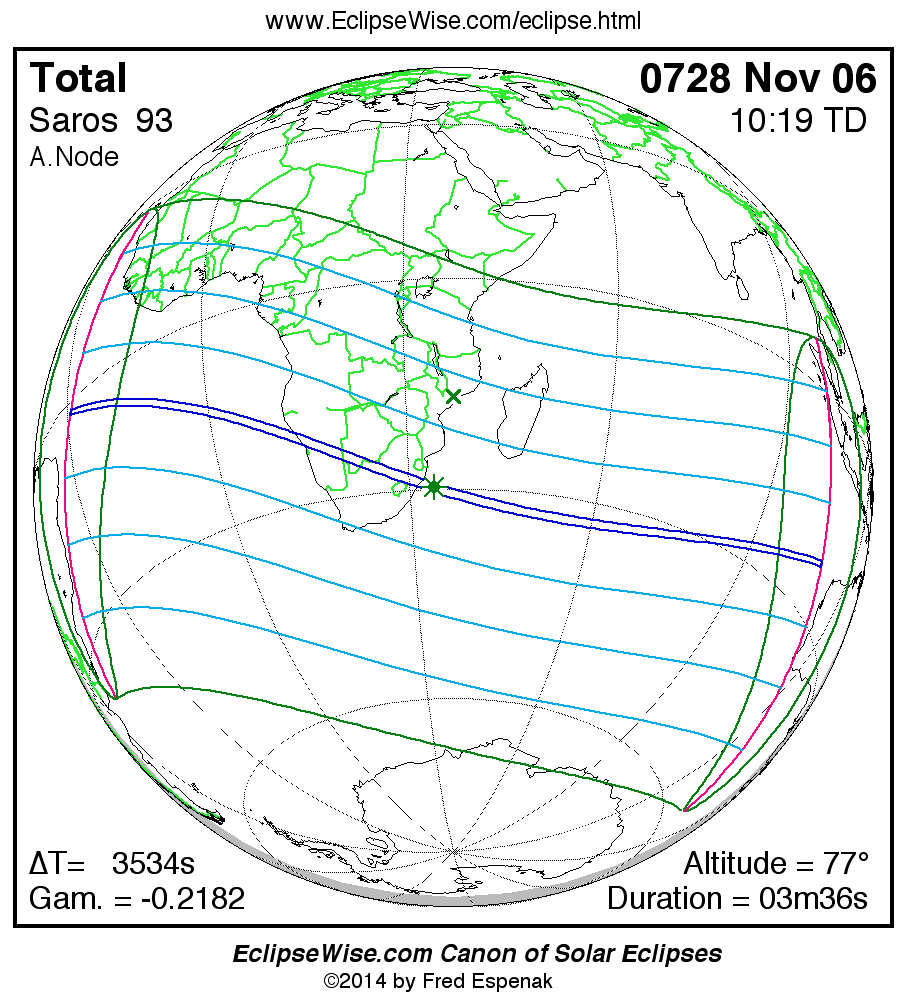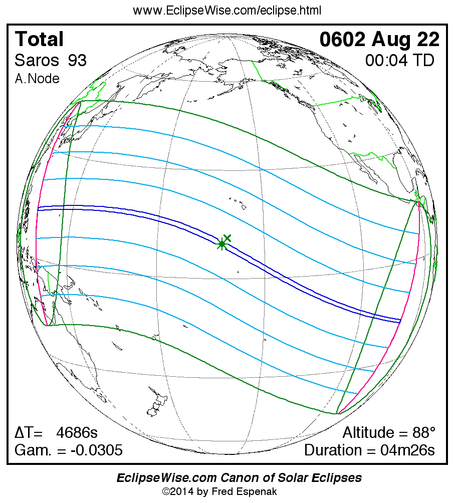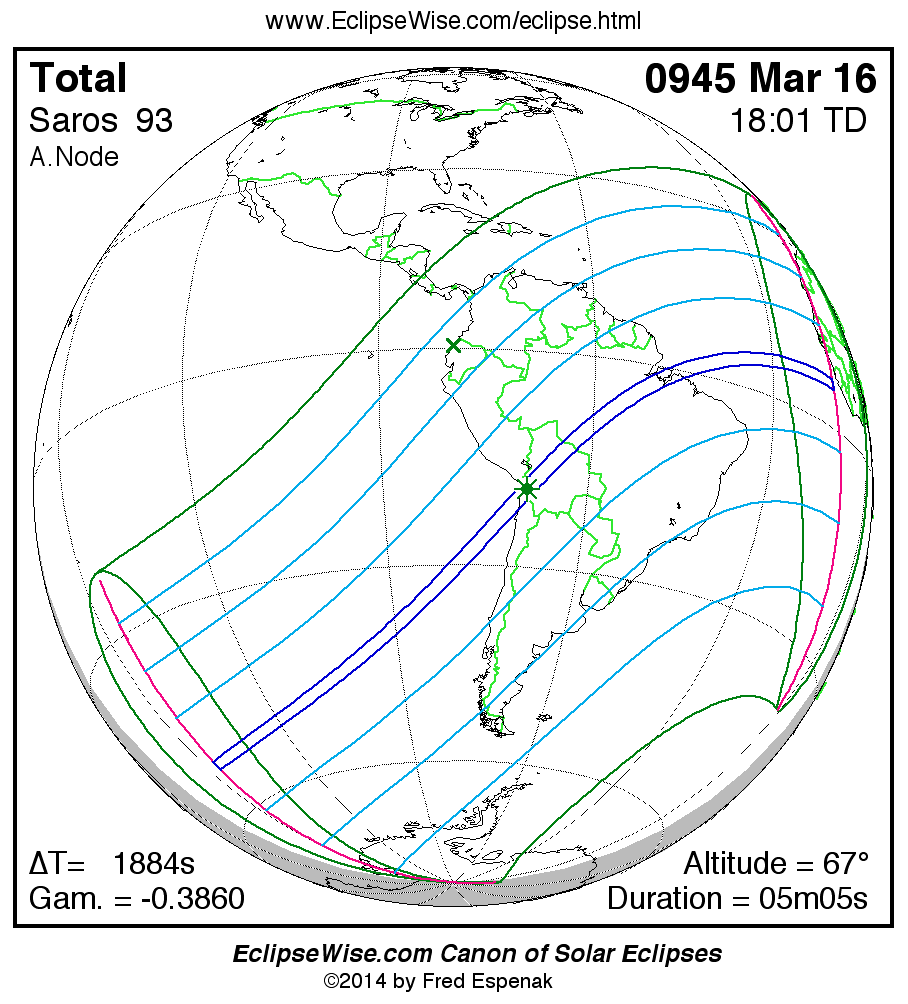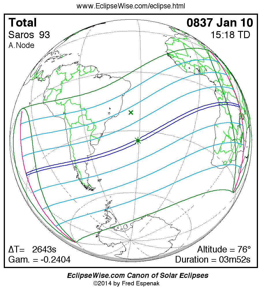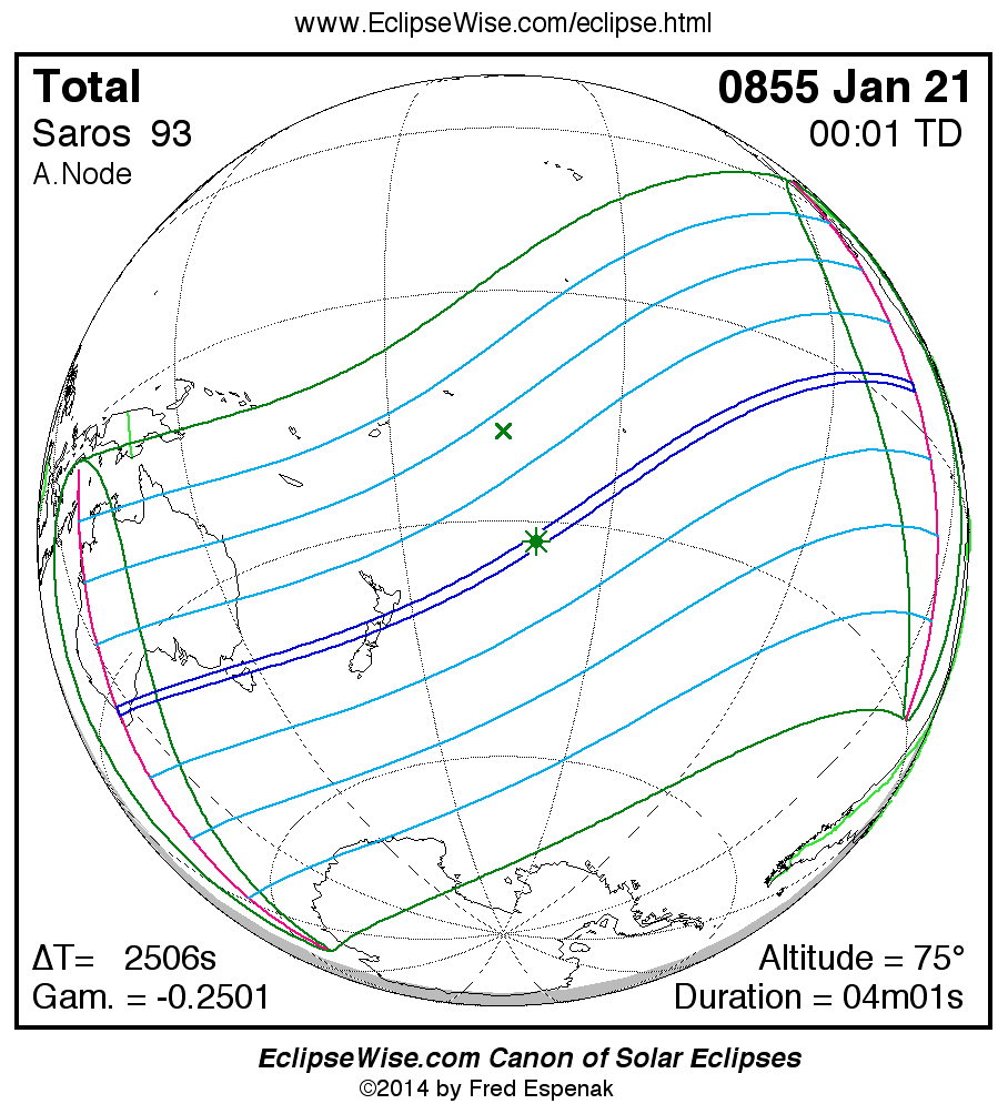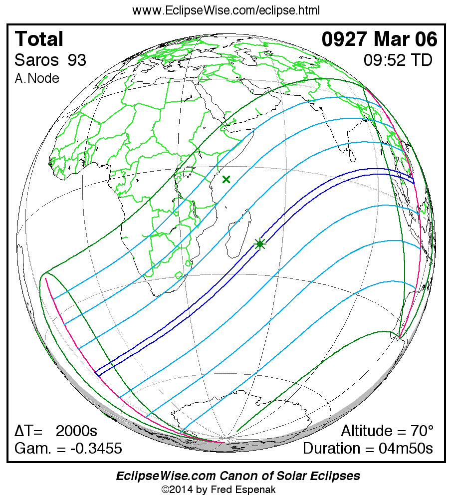 A panorama of all solar eclipses belonging to Saros 93 is presented here. Each map depicts the geographic region of visibility for a single eclipse. For central eclipses, the total or annular path is plotted in either blue (total) or red (annular). The date and time is given for the instant of Greatest Eclipse. Every map serves as a hyperlink to the EclipseWise Prime page for that eclipse where a larger map and complete details for the eclipse can be found. Visit the Key to Solar Eclipse Maps for a detailed explanation of these maps. Near the bottom of the page are a series of hyperlinks for more on solar eclipses.