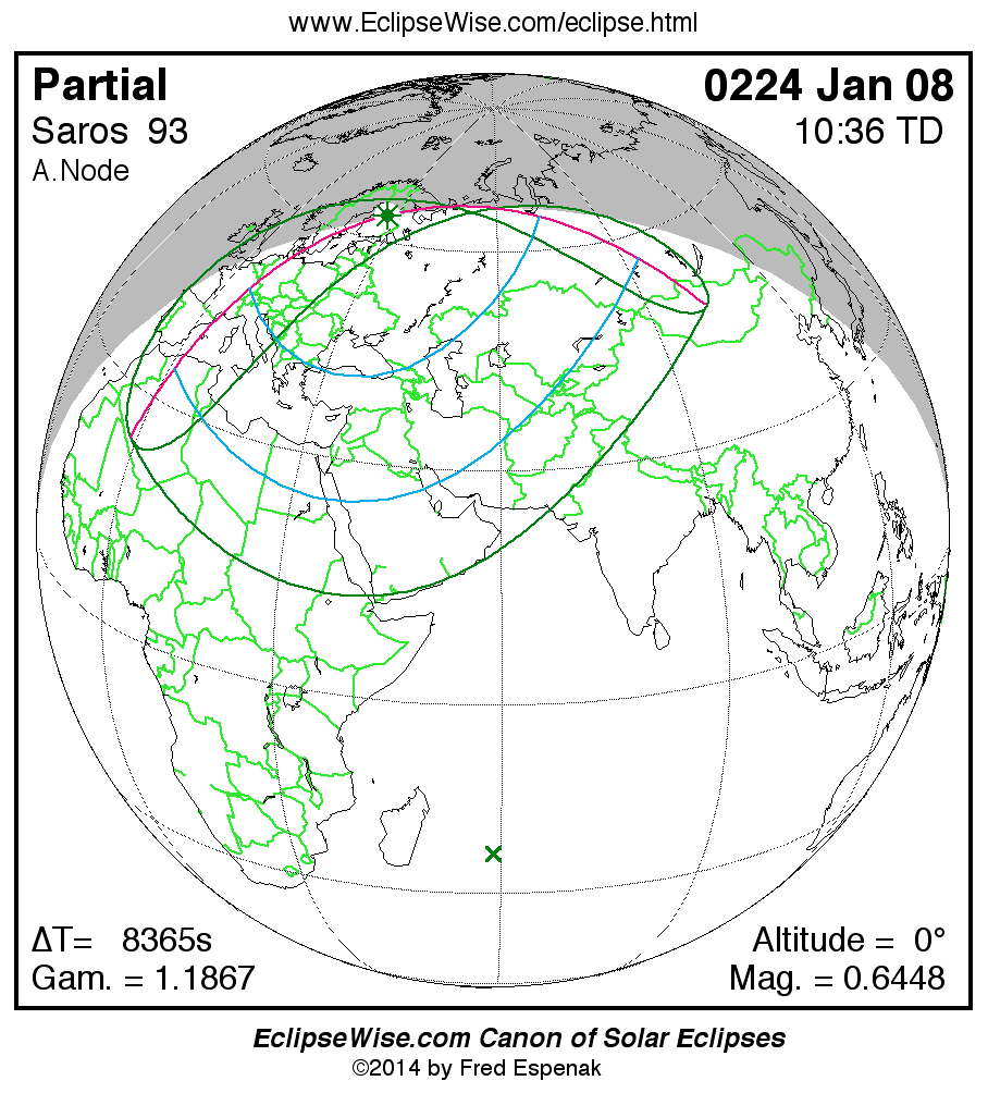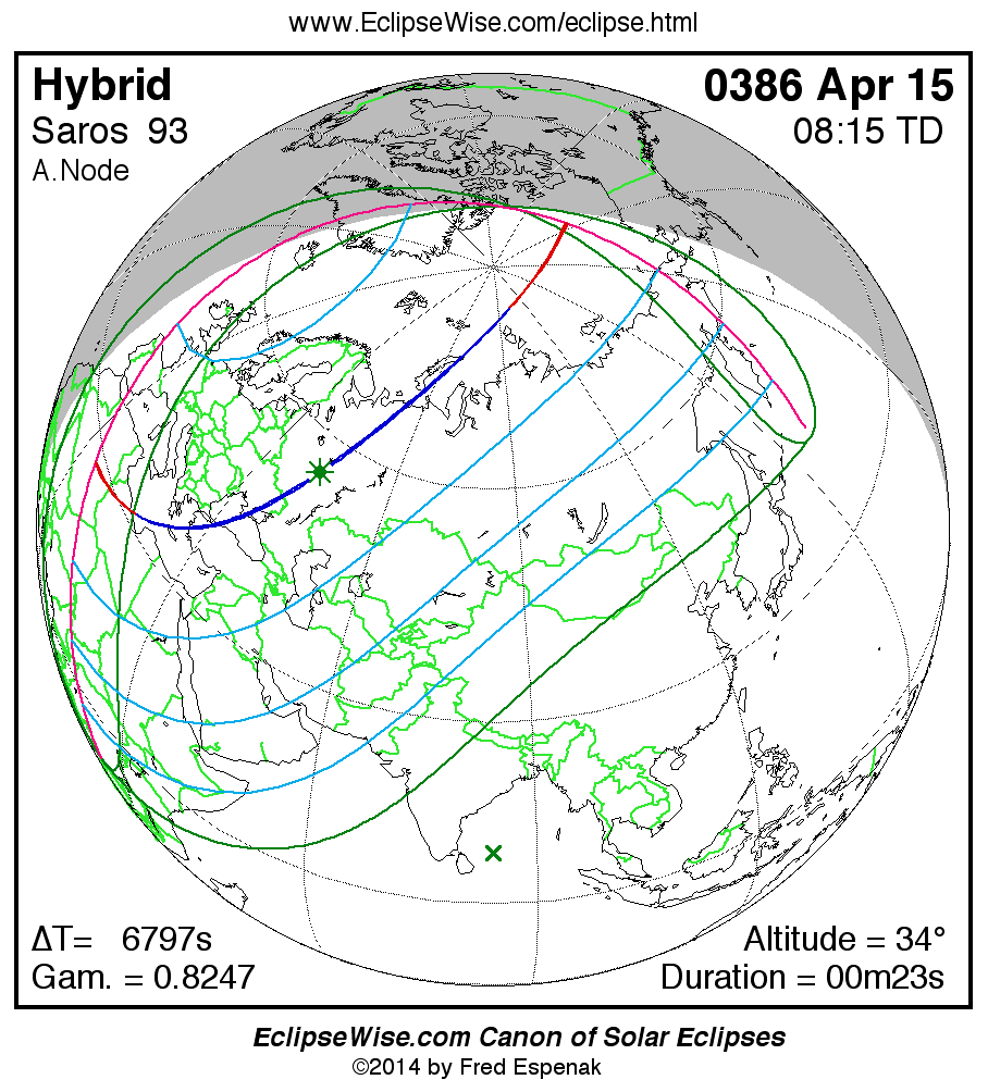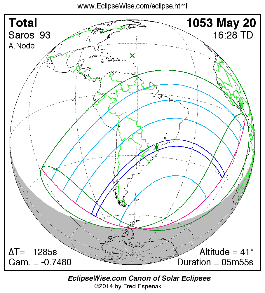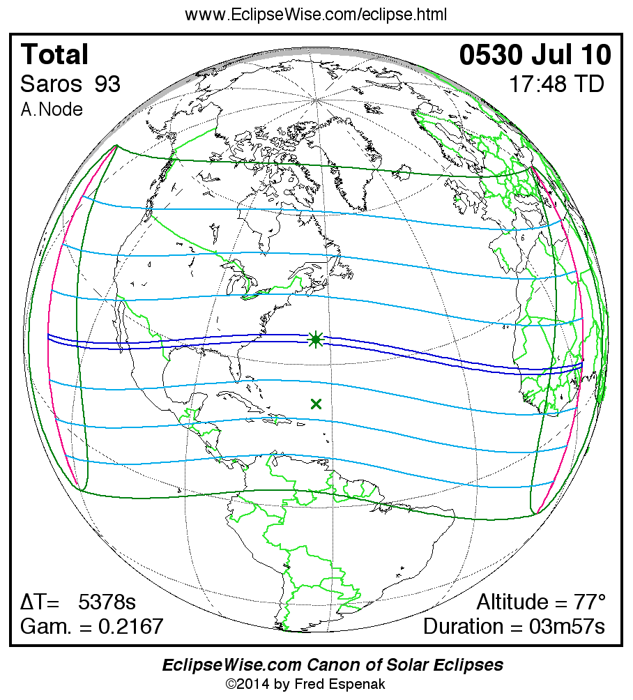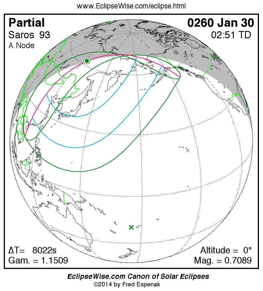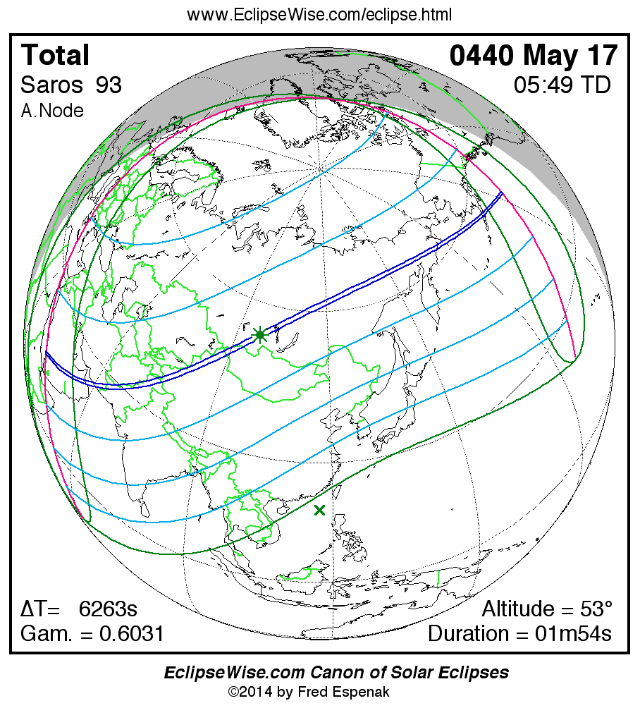 A panorama of all solar eclipses belonging to Saros 93 is presented here. Each map depicts the geographic region of visibility for a single eclipse. For central eclipses, the total or annular path is plotted in either blue (total) or red (annular). The date and time is given for the instant of Greatest Eclipse. Every map serves as a hyperlink to the EclipseWise Prime page for that eclipse where a larger map and complete details for the eclipse can be found. Visit the Key to Solar Eclipse Maps for a detailed explanation of these maps. Near the bottom of the page are a series of hyperlinks for more on solar eclipses.
