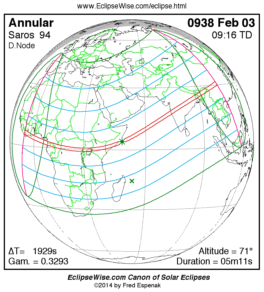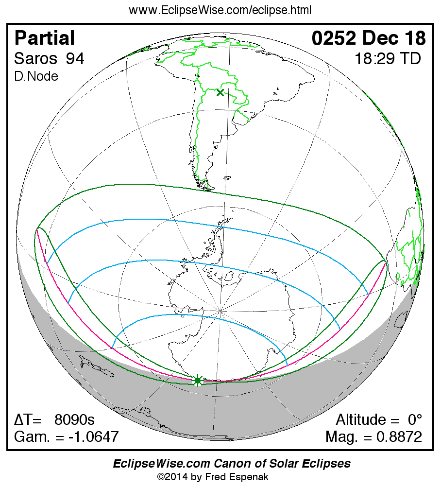 A panorama of all solar eclipses belonging to Saros 94 is presented here. Each map depicts the geographic region of visibility for a single eclipse. For central eclipses, the total or annular path is plotted in either blue (total) or red (annular). The date and time is given for the instant of Greatest Eclipse. Every map serves as a hyperlink to the EclipseWise Prime page for that eclipse where a larger map and complete details for the eclipse can be found. Visit the Key to Solar Eclipse Maps for a detailed explanation of these maps. Near the bottom of the page are a series of hyperlinks for more on solar eclipses.