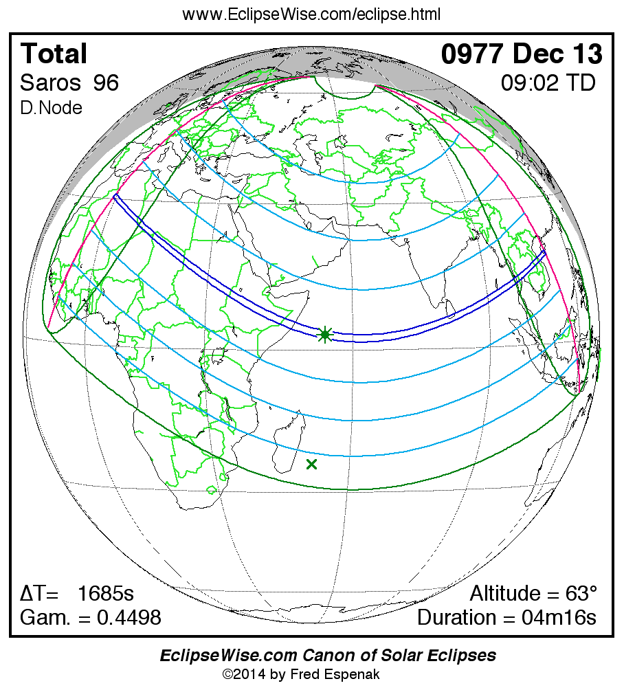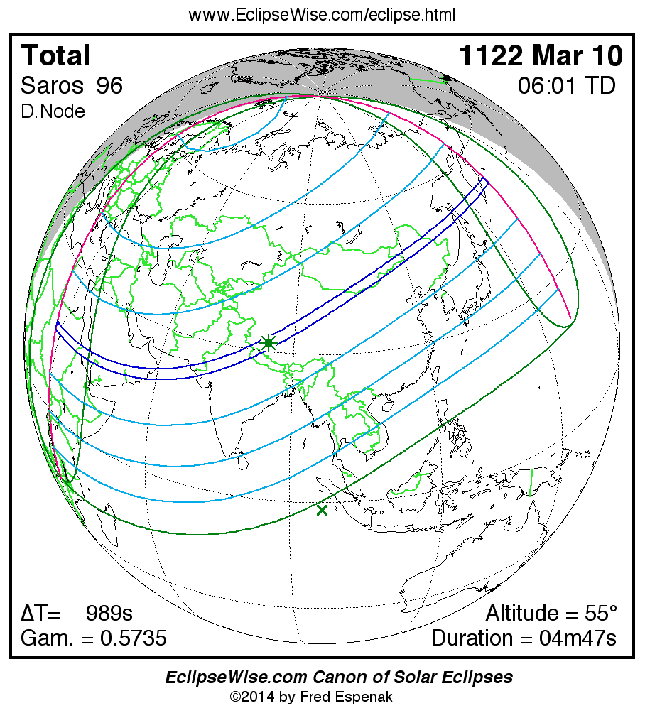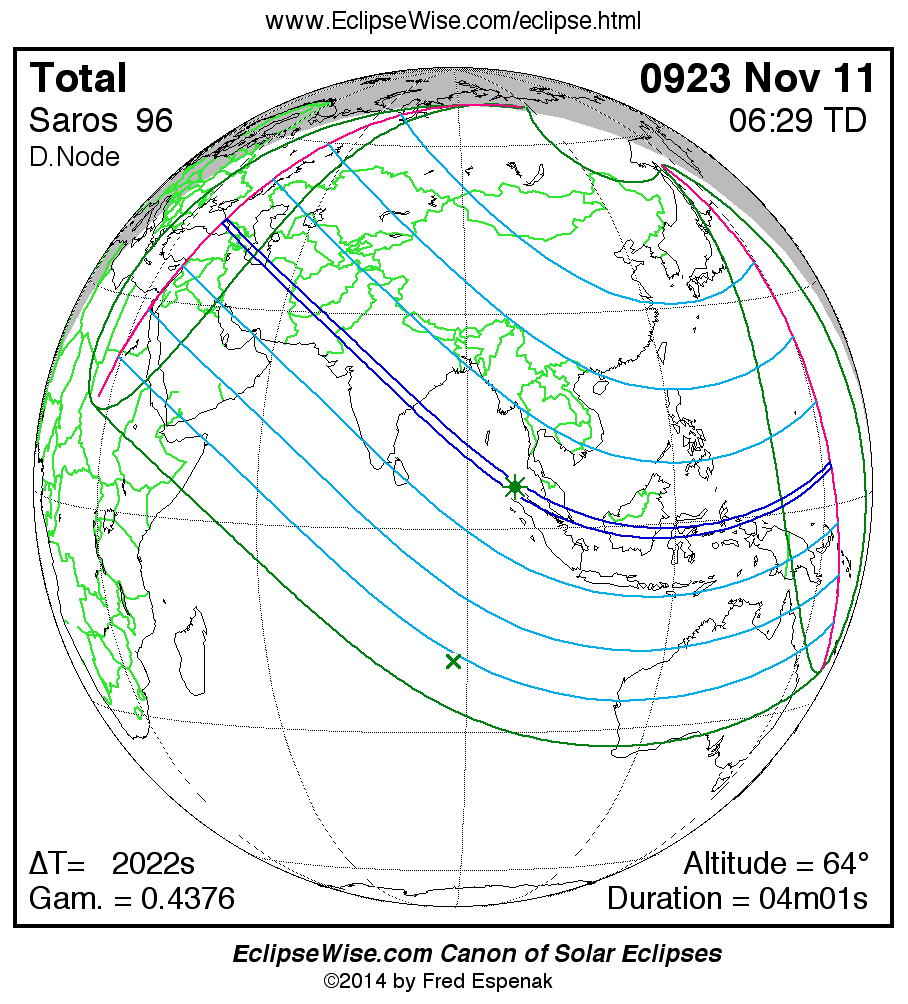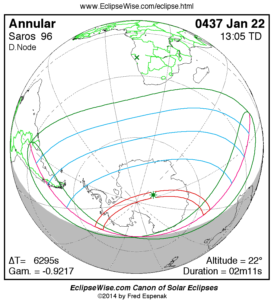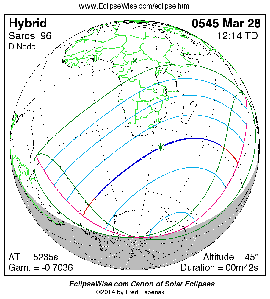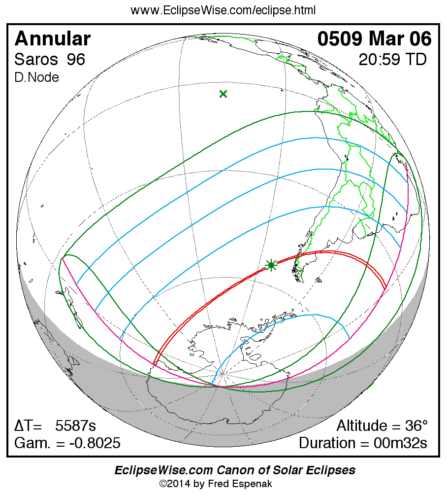 A panorama of all solar eclipses belonging to Saros 96 is presented here. Each map depicts the geographic region of visibility for a single eclipse. For central eclipses, the total or annular path is plotted in either blue (total) or red (annular). The date and time is given for the instant of Greatest Eclipse. Every map serves as a hyperlink to the EclipseWise Prime page for that eclipse where a larger map and complete details for the eclipse can be found. Visit the Key to Solar Eclipse Maps for a detailed explanation of these maps. Near the bottom of the page are a series of hyperlinks for more on solar eclipses.