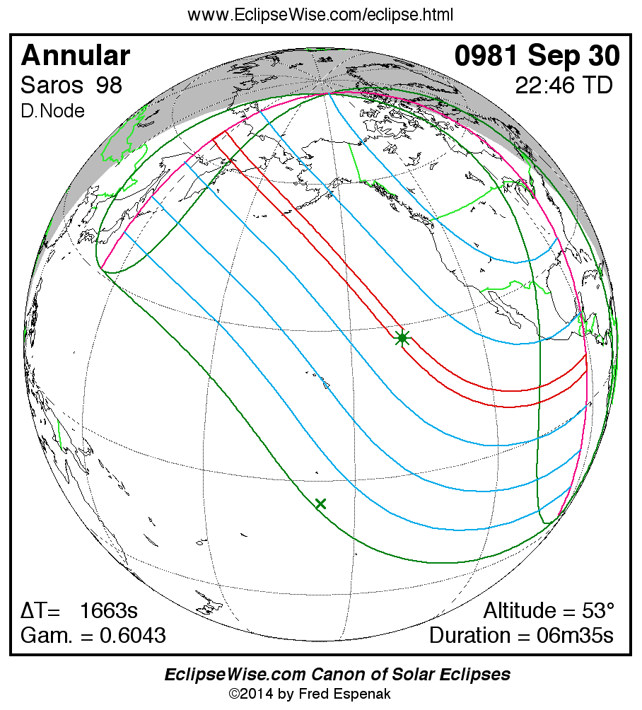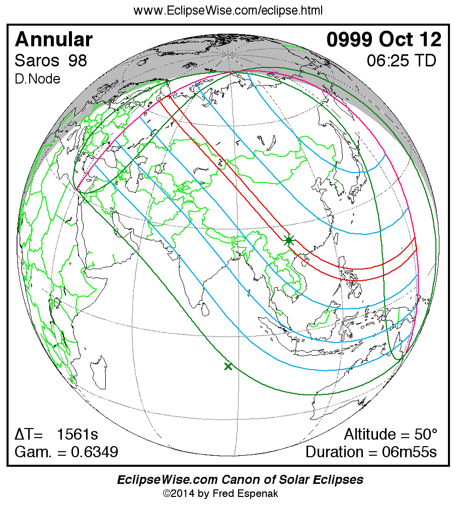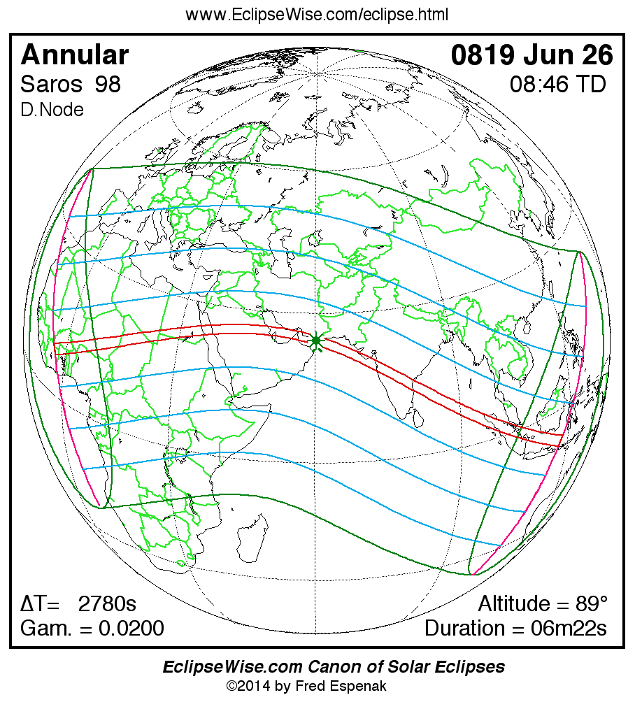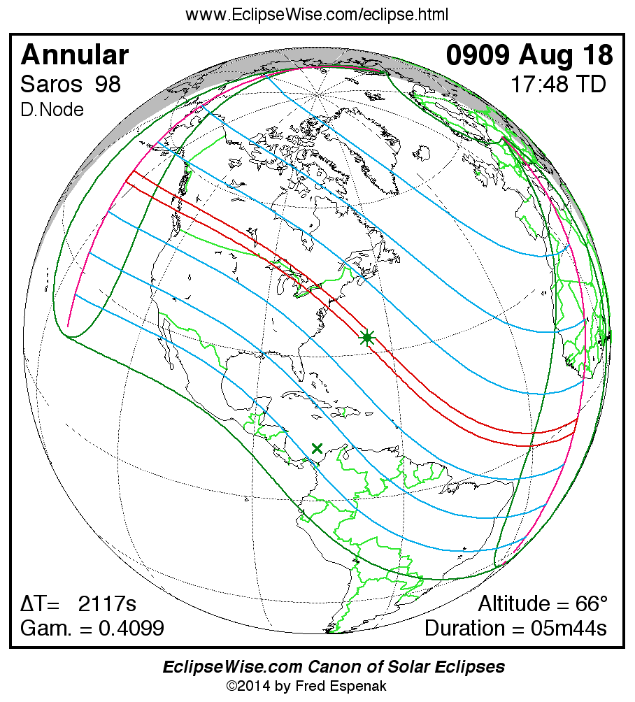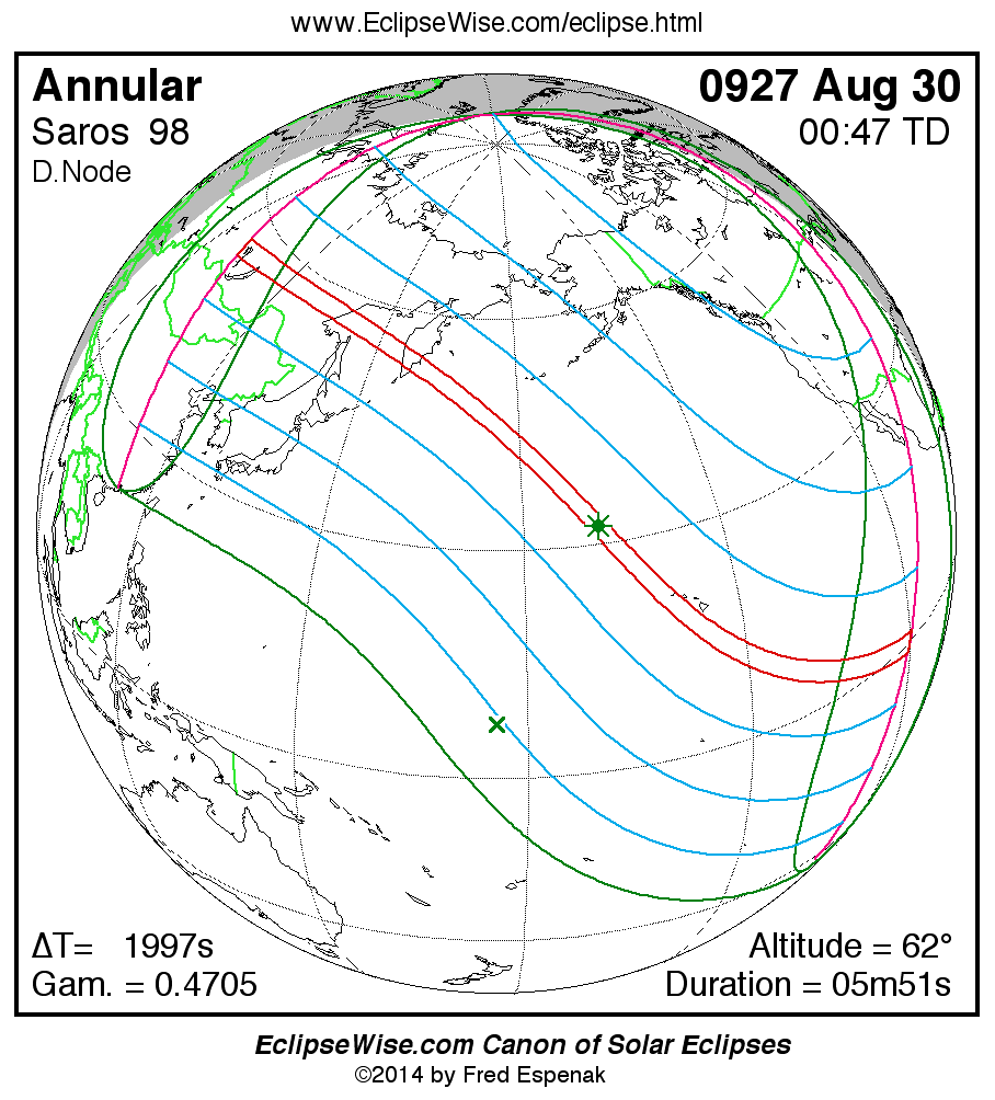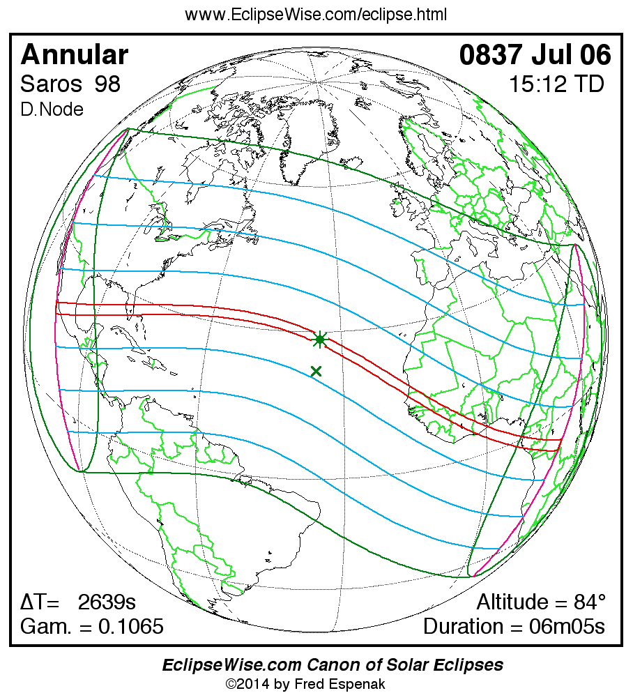 A panorama of all solar eclipses belonging to Saros 98 is presented here. Each map depicts the geographic region of visibility for a single eclipse. For central eclipses, the total or annular path is plotted in either blue (total) or red (annular). The date and time is given for the instant of Greatest Eclipse. Every map serves as a hyperlink to the EclipseWise Prime page for that eclipse where a larger map and complete details for the eclipse can be found. Visit the Key to Solar Eclipse Maps for a detailed explanation of these maps. Near the bottom of the page are a series of hyperlinks for more on solar eclipses.