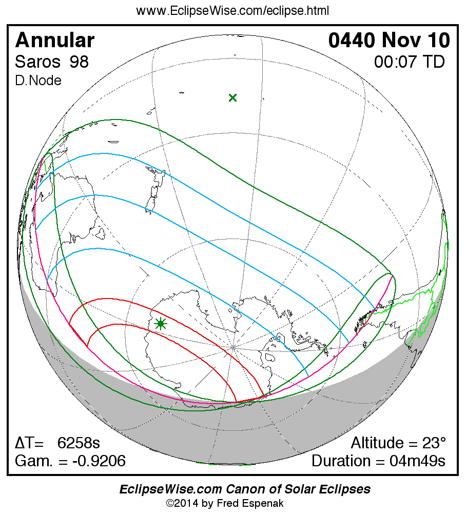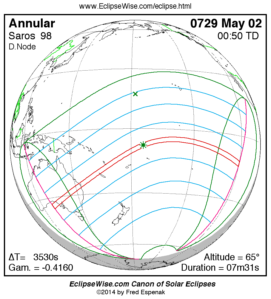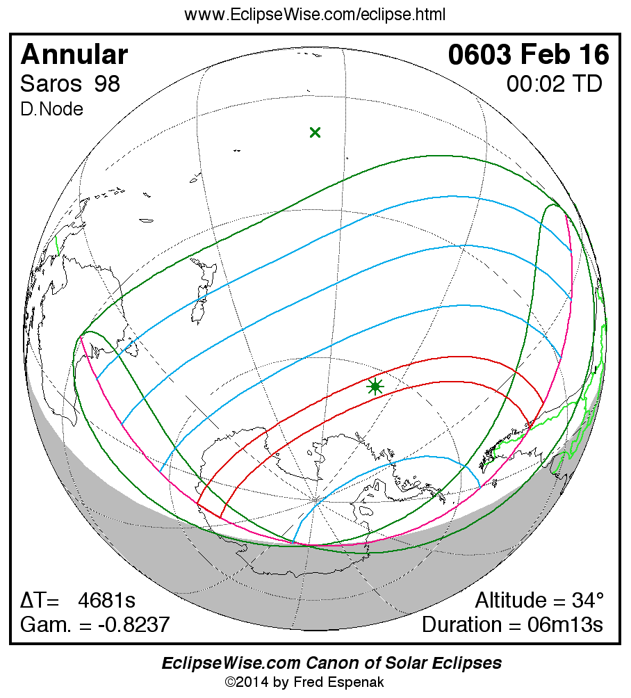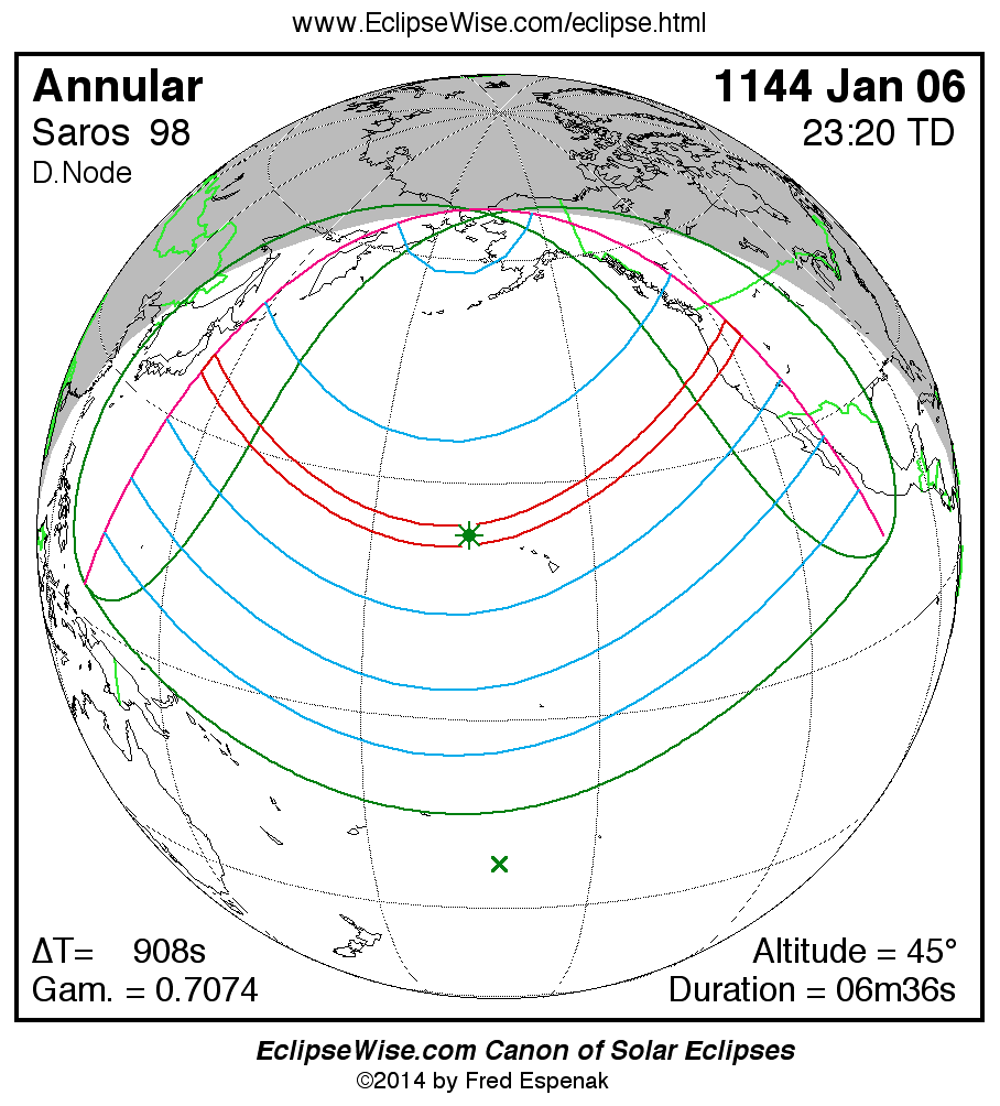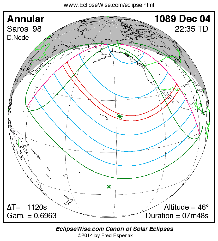 A panorama of all solar eclipses belonging to Saros 98 is presented here. Each map depicts the geographic region of visibility for a single eclipse. For central eclipses, the total or annular path is plotted in either blue (total) or red (annular). The date and time is given for the instant of Greatest Eclipse. Every map serves as a hyperlink to the EclipseWise Prime page for that eclipse where a larger map and complete details for the eclipse can be found. Visit the Key to Solar Eclipse Maps for a detailed explanation of these maps. Near the bottom of the page are a series of hyperlinks for more on solar eclipses.