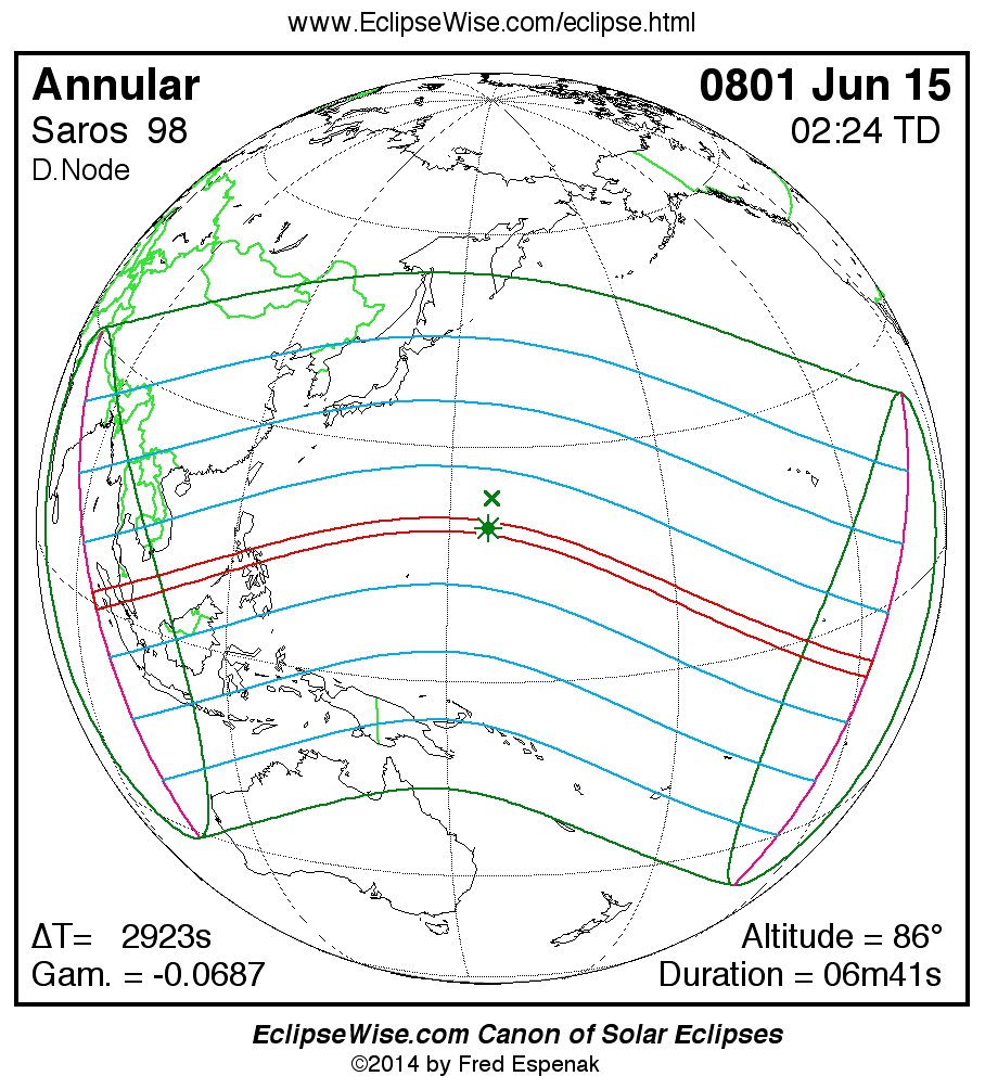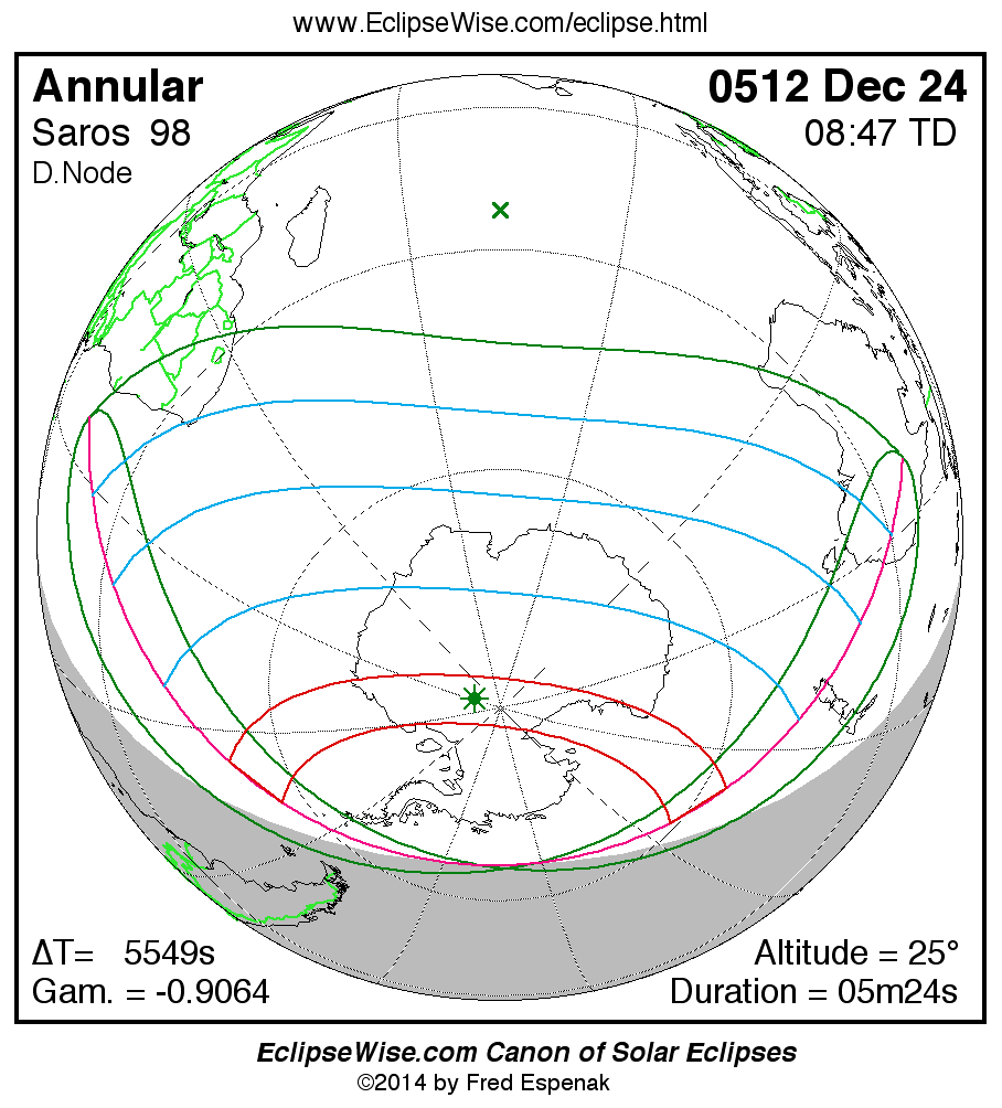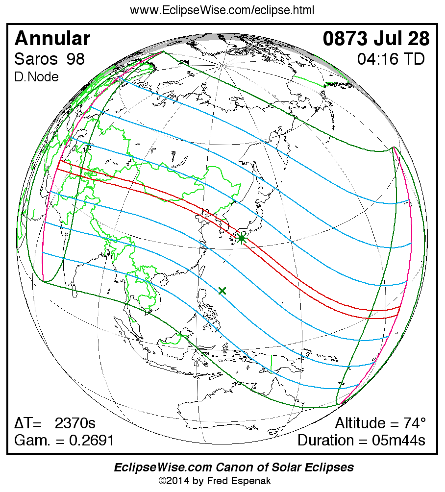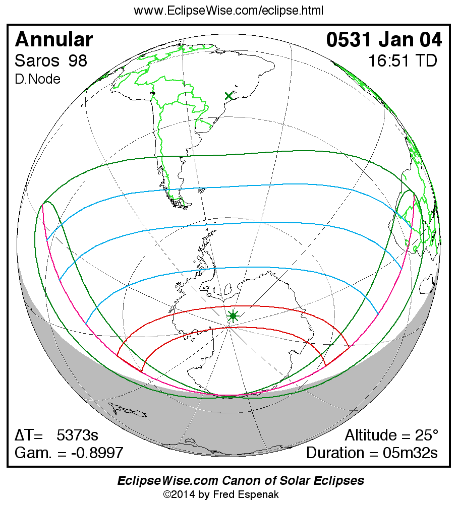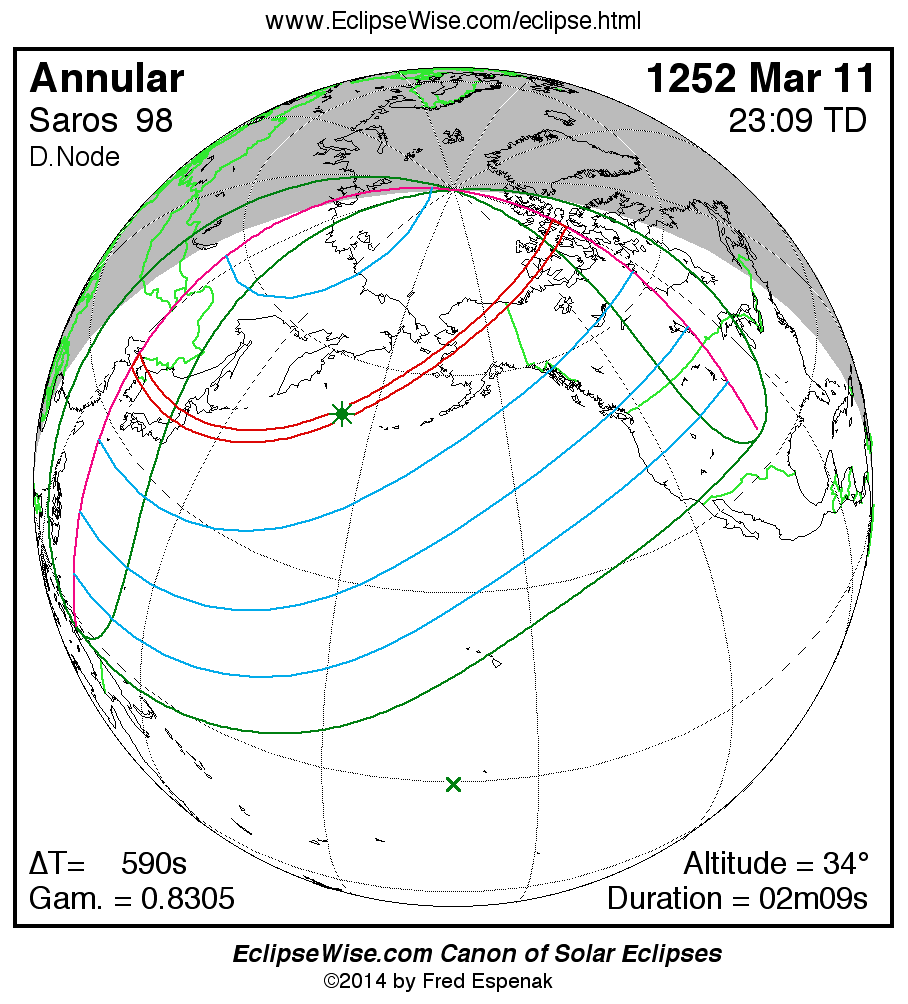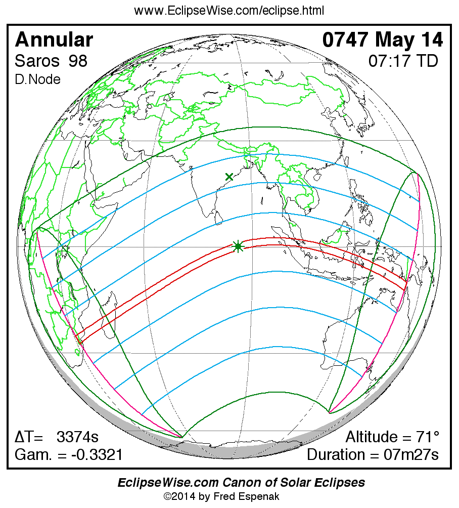 A panorama of all solar eclipses belonging to Saros 98 is presented here. Each map depicts the geographic region of visibility for a single eclipse. For central eclipses, the total or annular path is plotted in either blue (total) or red (annular). The date and time is given for the instant of Greatest Eclipse. Every map serves as a hyperlink to the EclipseWise Prime page for that eclipse where a larger map and complete details for the eclipse can be found. Visit the Key to Solar Eclipse Maps for a detailed explanation of these maps. Near the bottom of the page are a series of hyperlinks for more on solar eclipses.