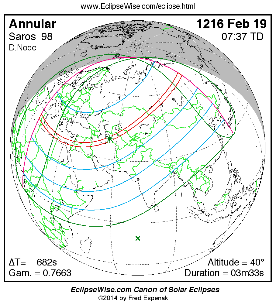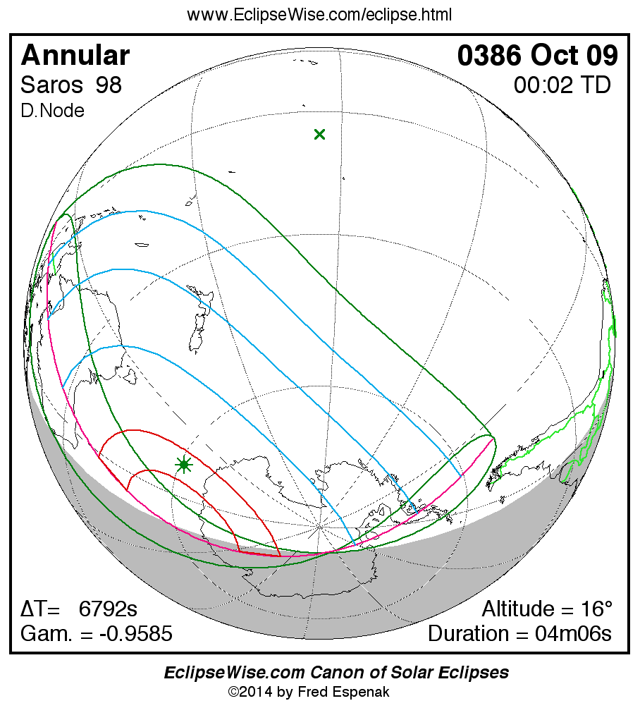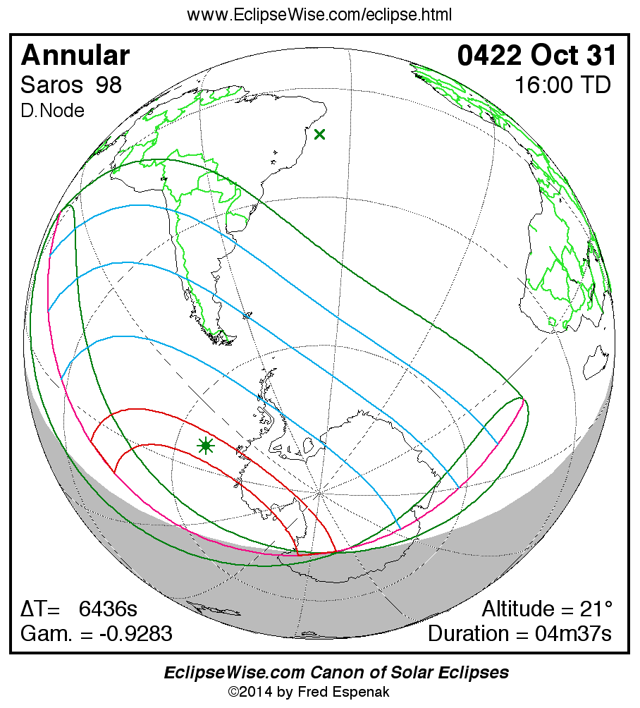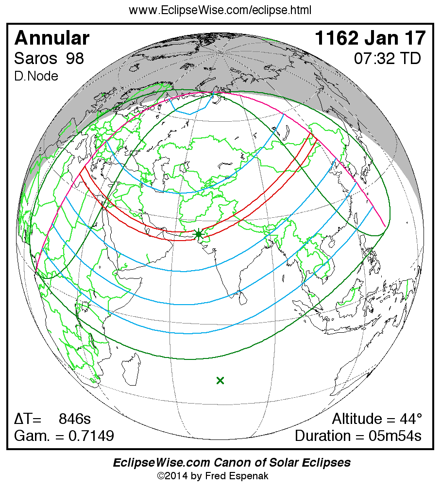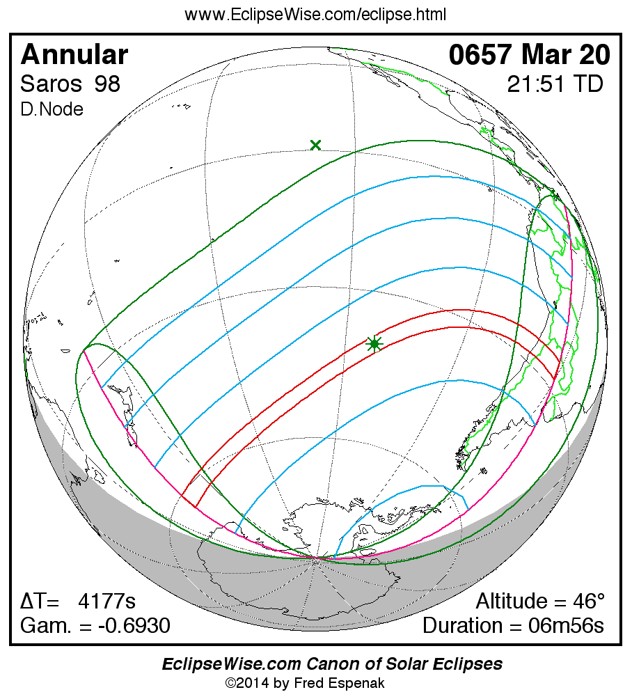 A panorama of all solar eclipses belonging to Saros 98 is presented here. Each map depicts the geographic region of visibility for a single eclipse. For central eclipses, the total or annular path is plotted in either blue (total) or red (annular). The date and time is given for the instant of Greatest Eclipse. Every map serves as a hyperlink to the EclipseWise Prime page for that eclipse where a larger map and complete details for the eclipse can be found. Visit the Key to Solar Eclipse Maps for a detailed explanation of these maps. Near the bottom of the page are a series of hyperlinks for more on solar eclipses.