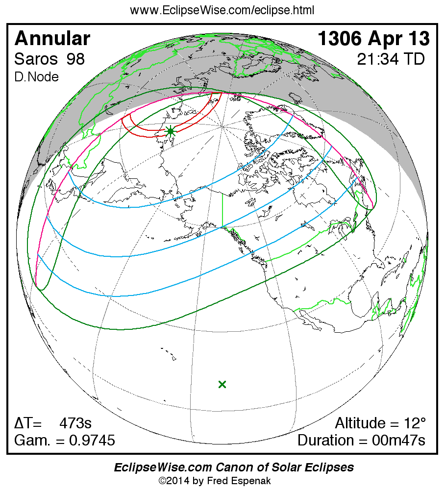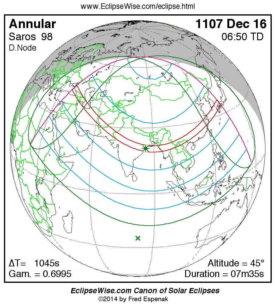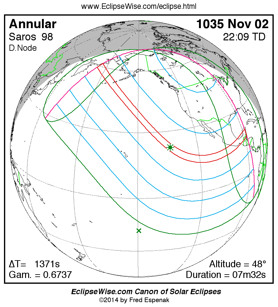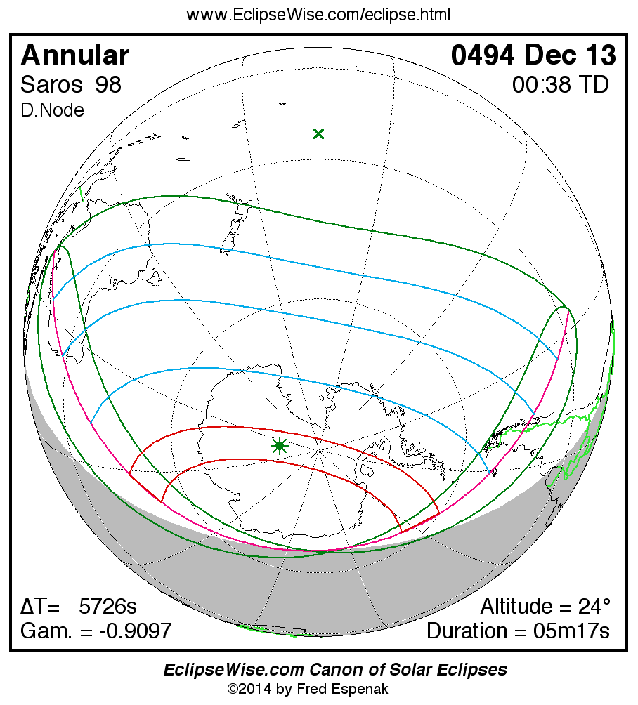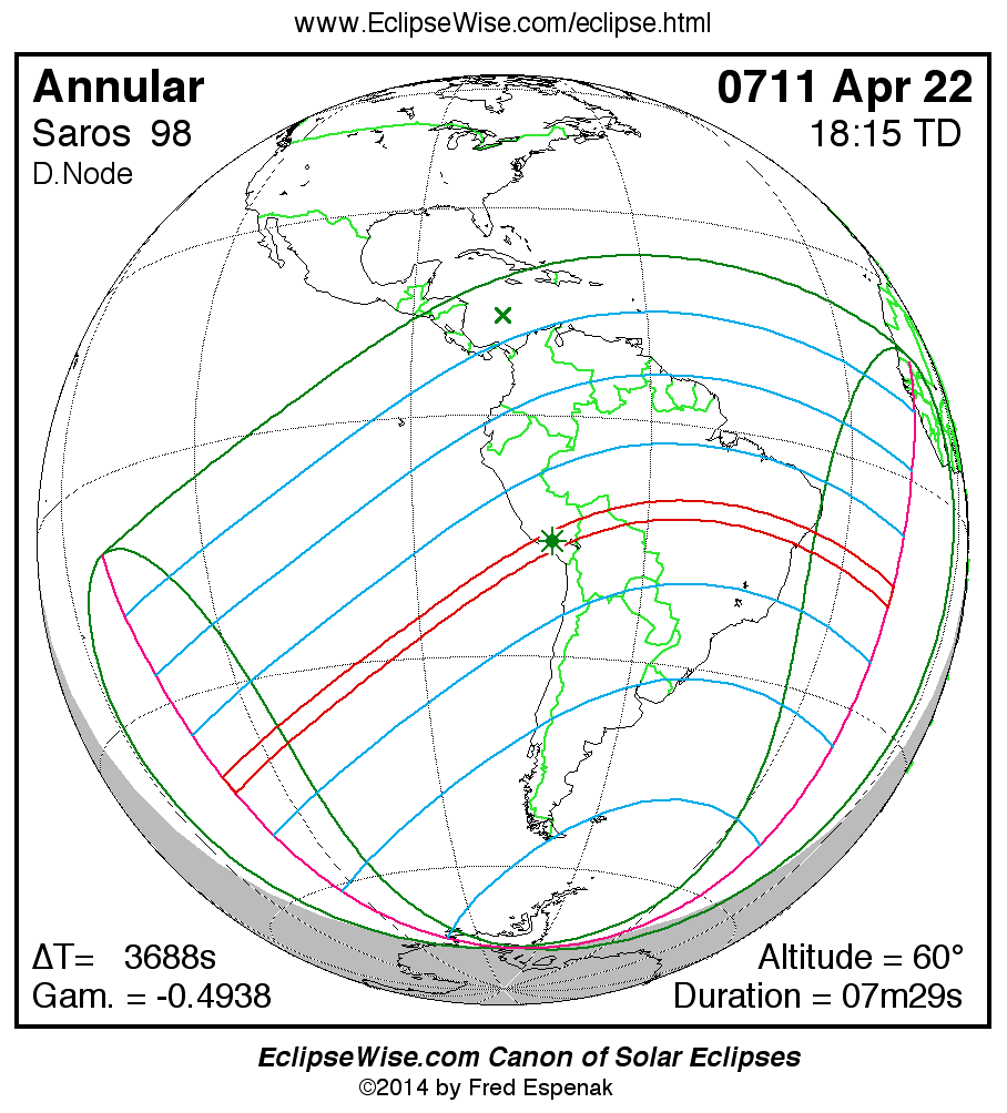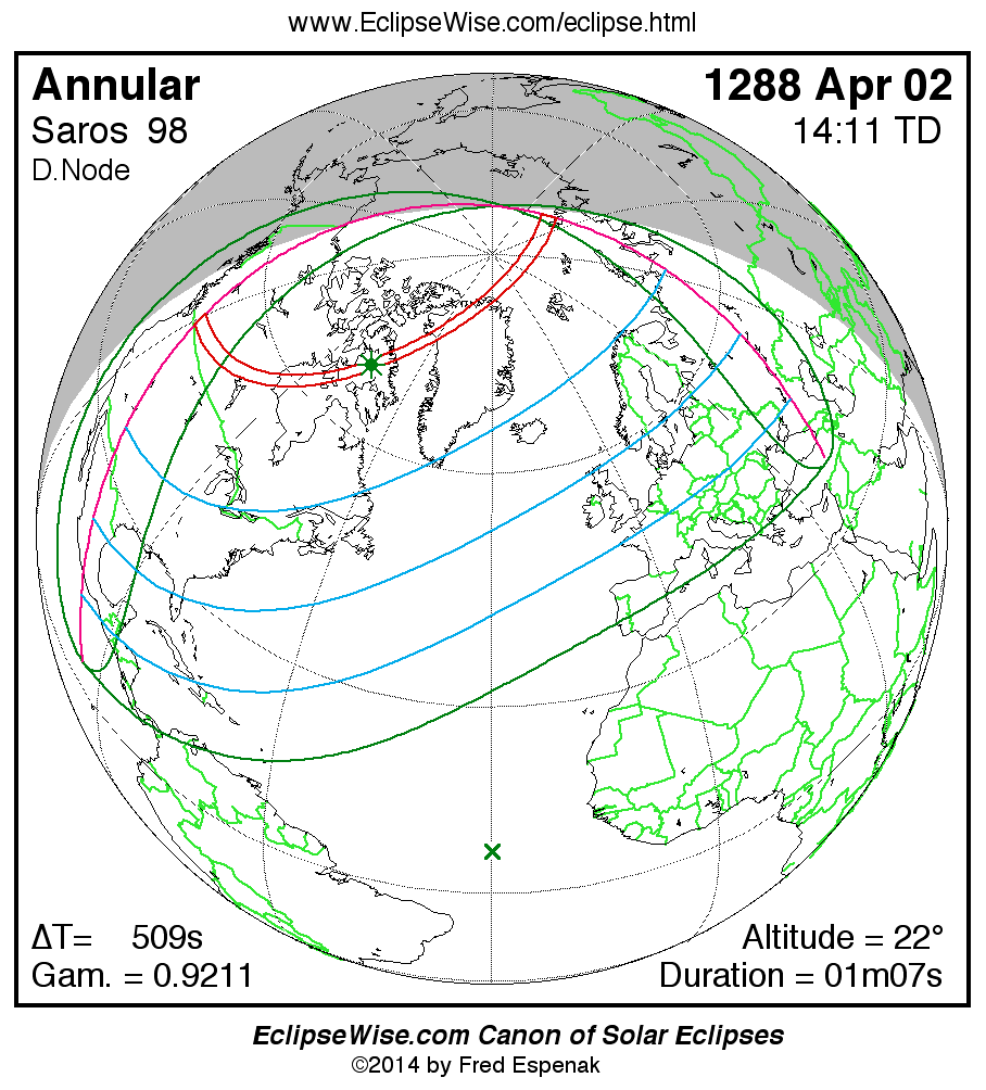 A panorama of all solar eclipses belonging to Saros 98 is presented here. Each map depicts the geographic region of visibility for a single eclipse. For central eclipses, the total or annular path is plotted in either blue (total) or red (annular). The date and time is given for the instant of Greatest Eclipse. Every map serves as a hyperlink to the EclipseWise Prime page for that eclipse where a larger map and complete details for the eclipse can be found. Visit the Key to Solar Eclipse Maps for a detailed explanation of these maps. Near the bottom of the page are a series of hyperlinks for more on solar eclipses.