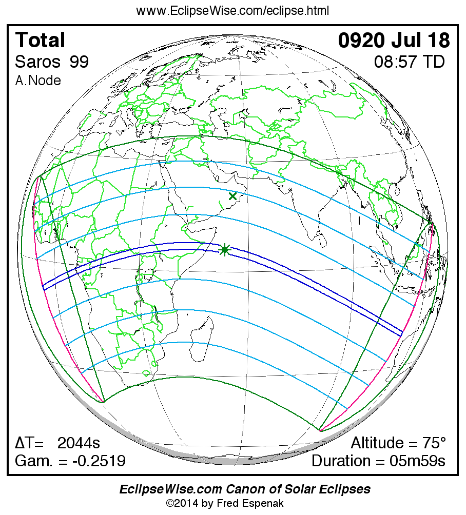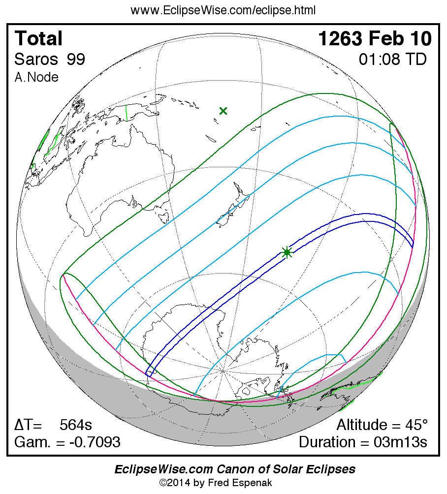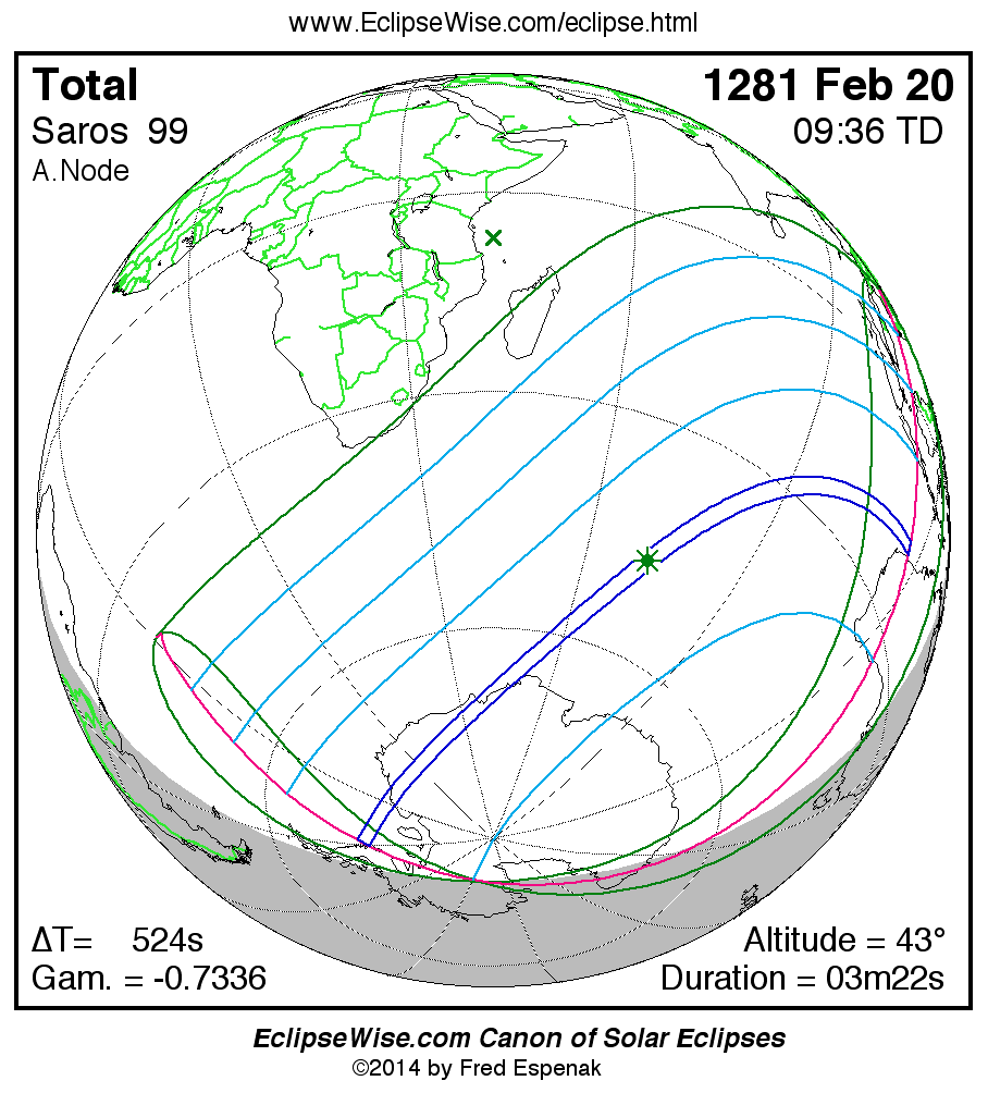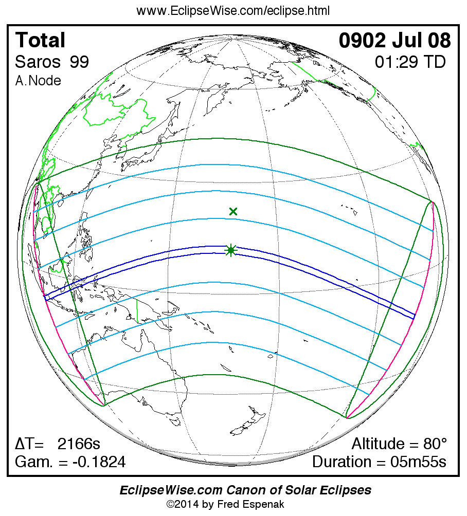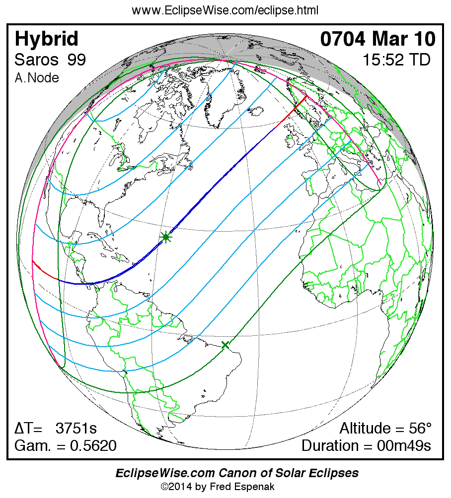 A panorama of all solar eclipses belonging to Saros 99 is presented here. Each map depicts the geographic region of visibility for a single eclipse. For central eclipses, the total or annular path is plotted in either blue (total) or red (annular). The date and time is given for the instant of Greatest Eclipse. Every map serves as a hyperlink to the EclipseWise Prime page for that eclipse where a larger map and complete details for the eclipse can be found. Visit the Key to Solar Eclipse Maps for a detailed explanation of these maps. Near the bottom of the page are a series of hyperlinks for more on solar eclipses.