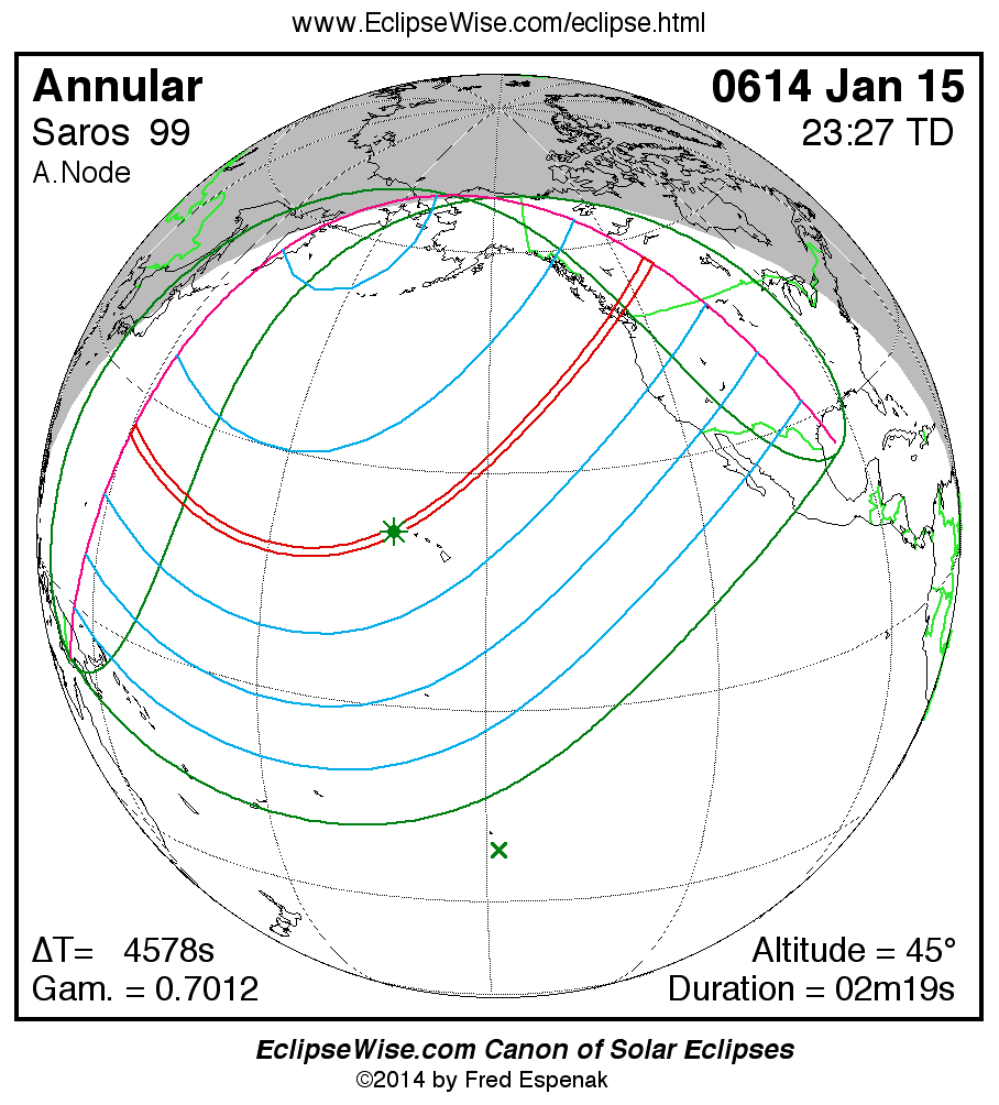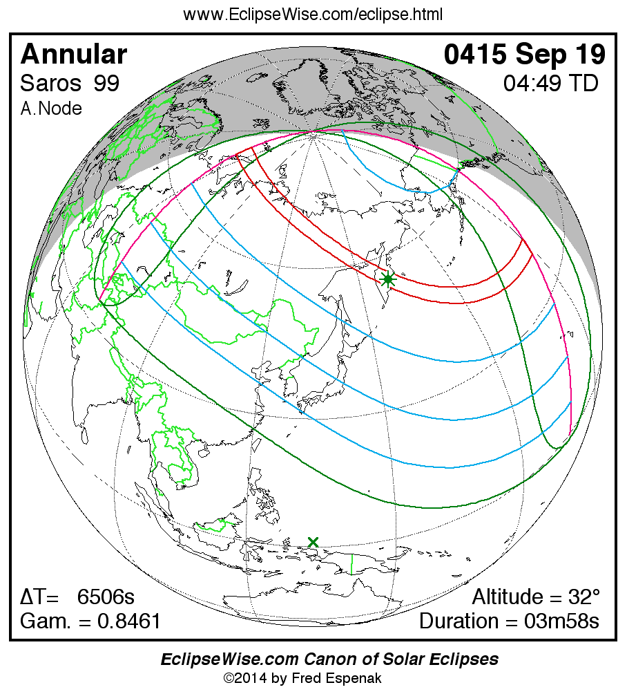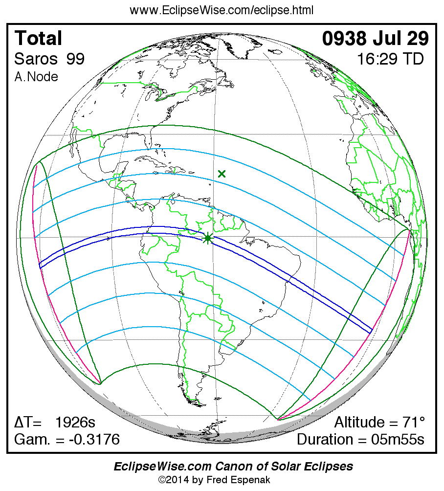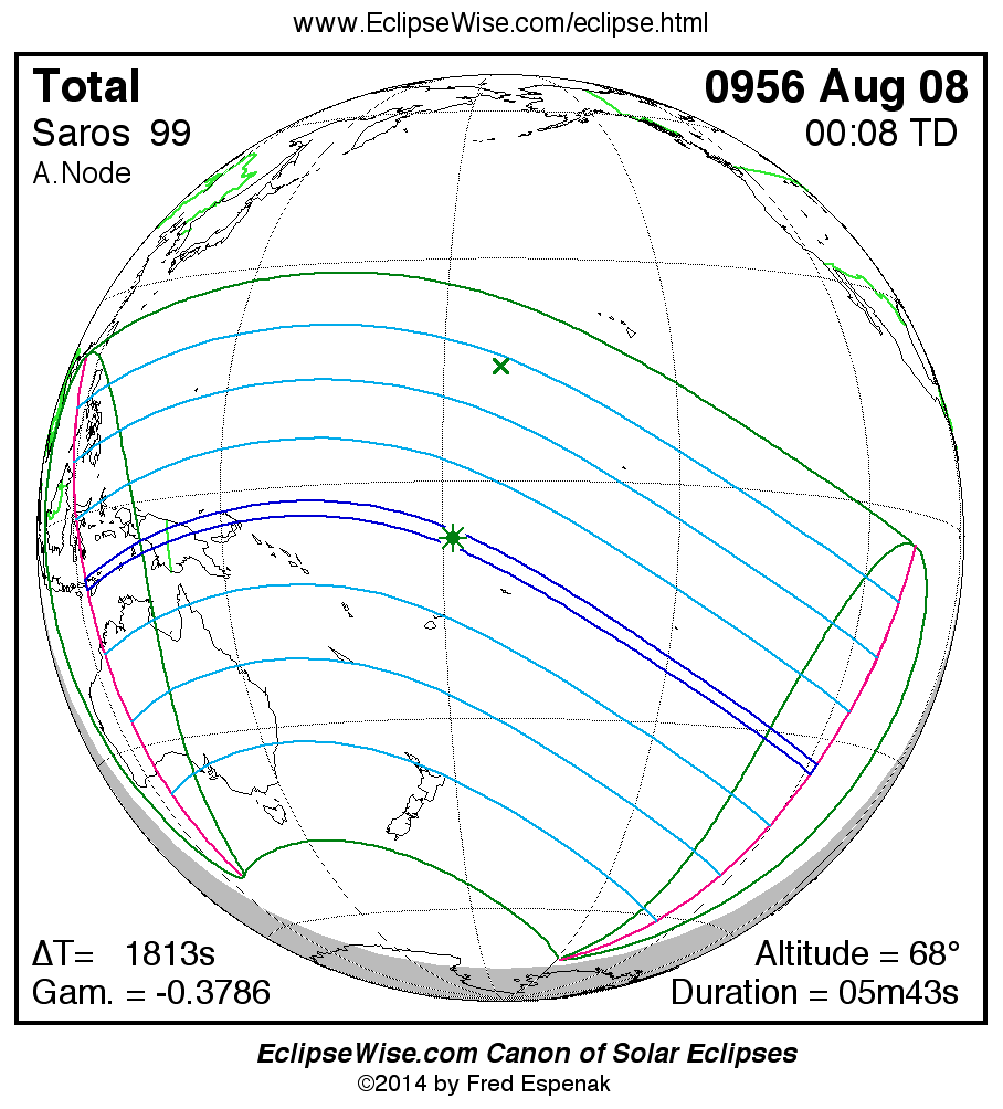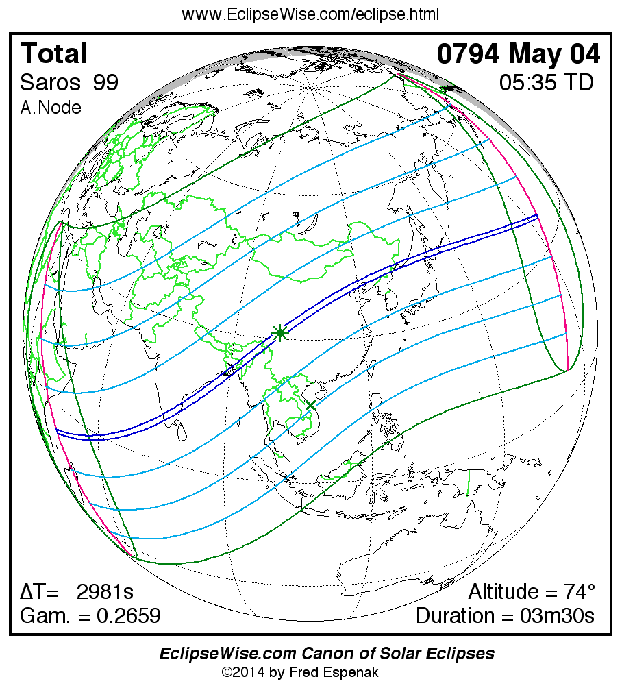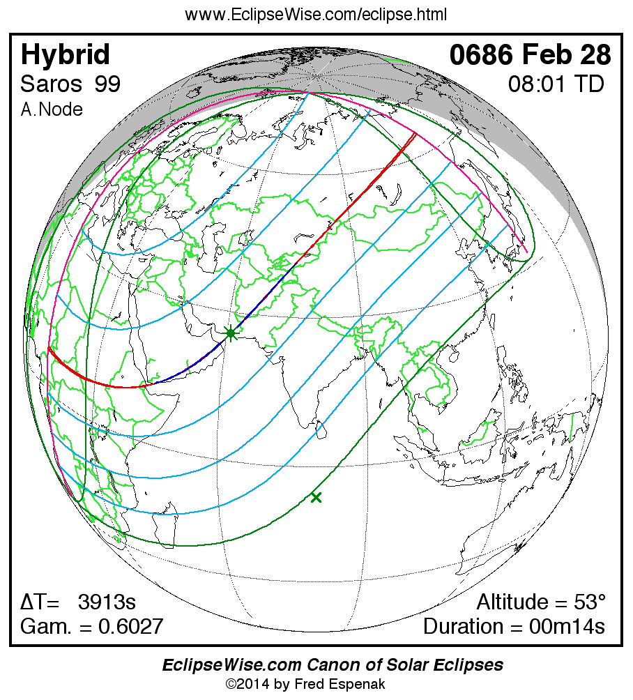 A panorama of all solar eclipses belonging to Saros 99 is presented here. Each map depicts the geographic region of visibility for a single eclipse. For central eclipses, the total or annular path is plotted in either blue (total) or red (annular). The date and time is given for the instant of Greatest Eclipse. Every map serves as a hyperlink to the EclipseWise Prime page for that eclipse where a larger map and complete details for the eclipse can be found. Visit the Key to Solar Eclipse Maps for a detailed explanation of these maps. Near the bottom of the page are a series of hyperlinks for more on solar eclipses.