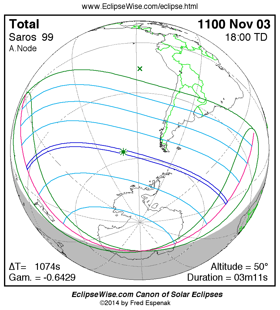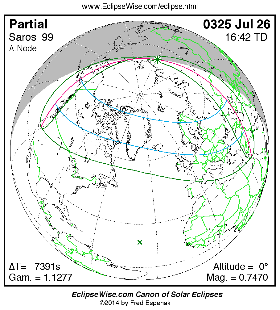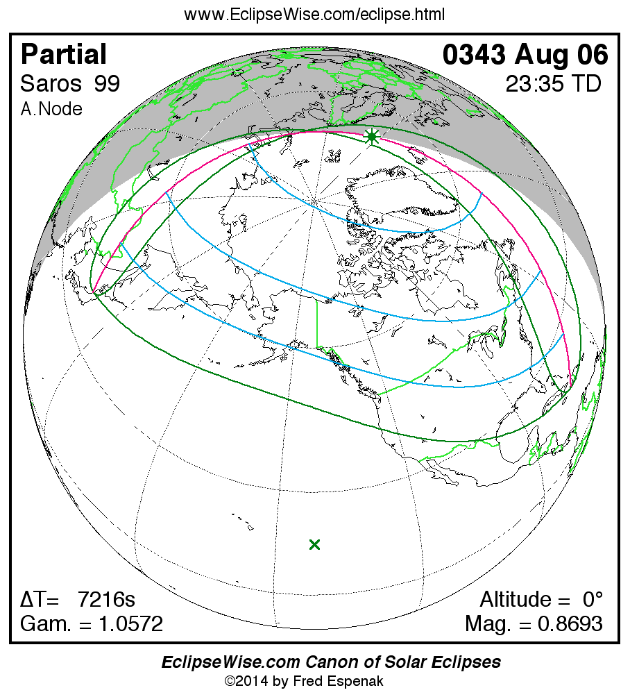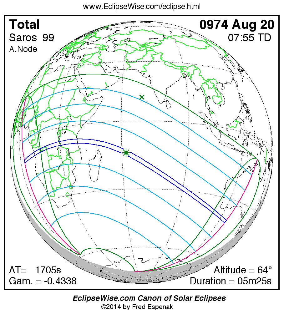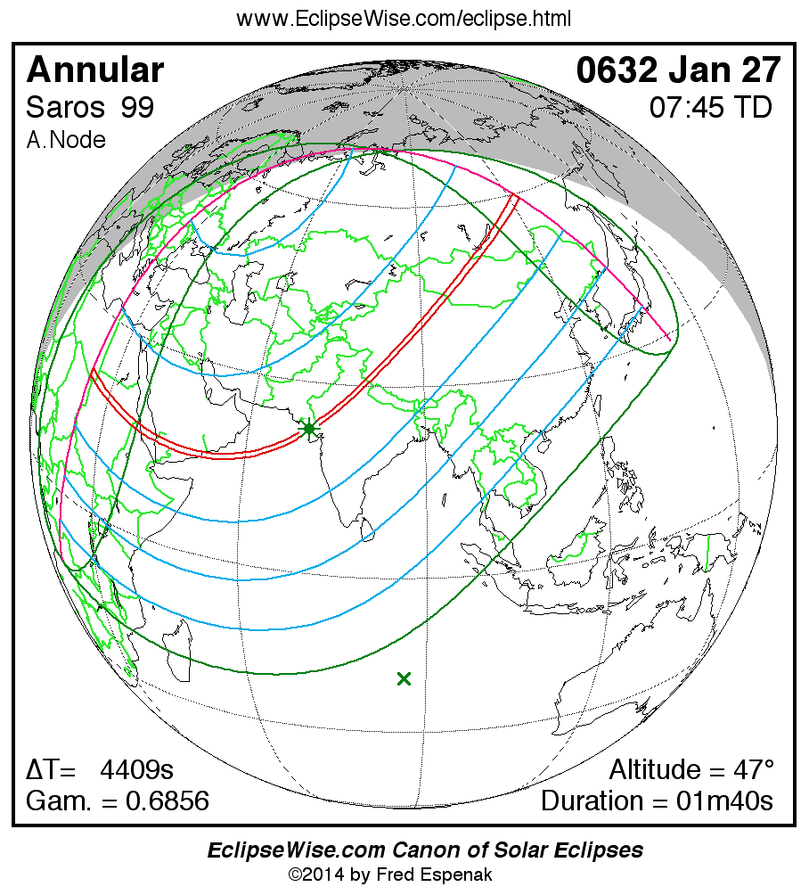 A panorama of all solar eclipses belonging to Saros 99 is presented here. Each map depicts the geographic region of visibility for a single eclipse. For central eclipses, the total or annular path is plotted in either blue (total) or red (annular). The date and time is given for the instant of Greatest Eclipse. Every map serves as a hyperlink to the EclipseWise Prime page for that eclipse where a larger map and complete details for the eclipse can be found. Visit the Key to Solar Eclipse Maps for a detailed explanation of these maps. Near the bottom of the page are a series of hyperlinks for more on solar eclipses.