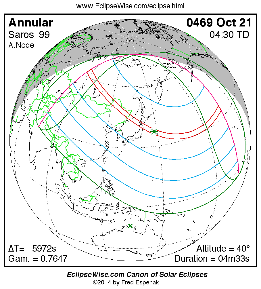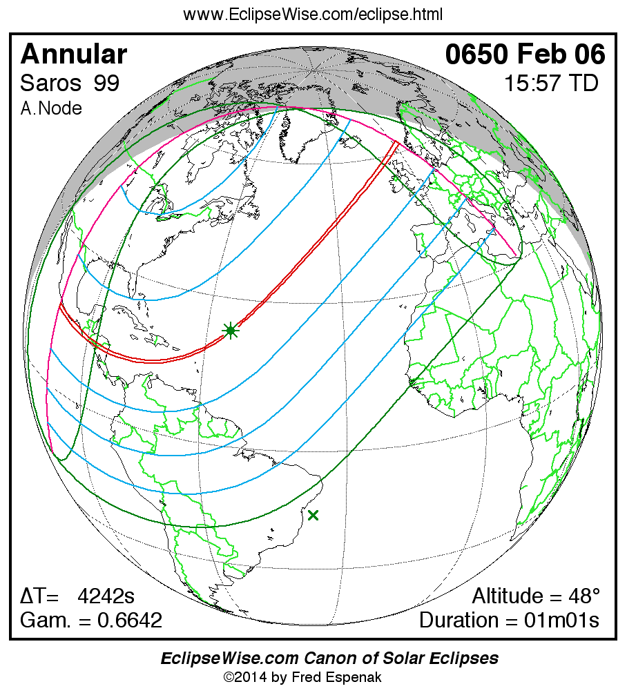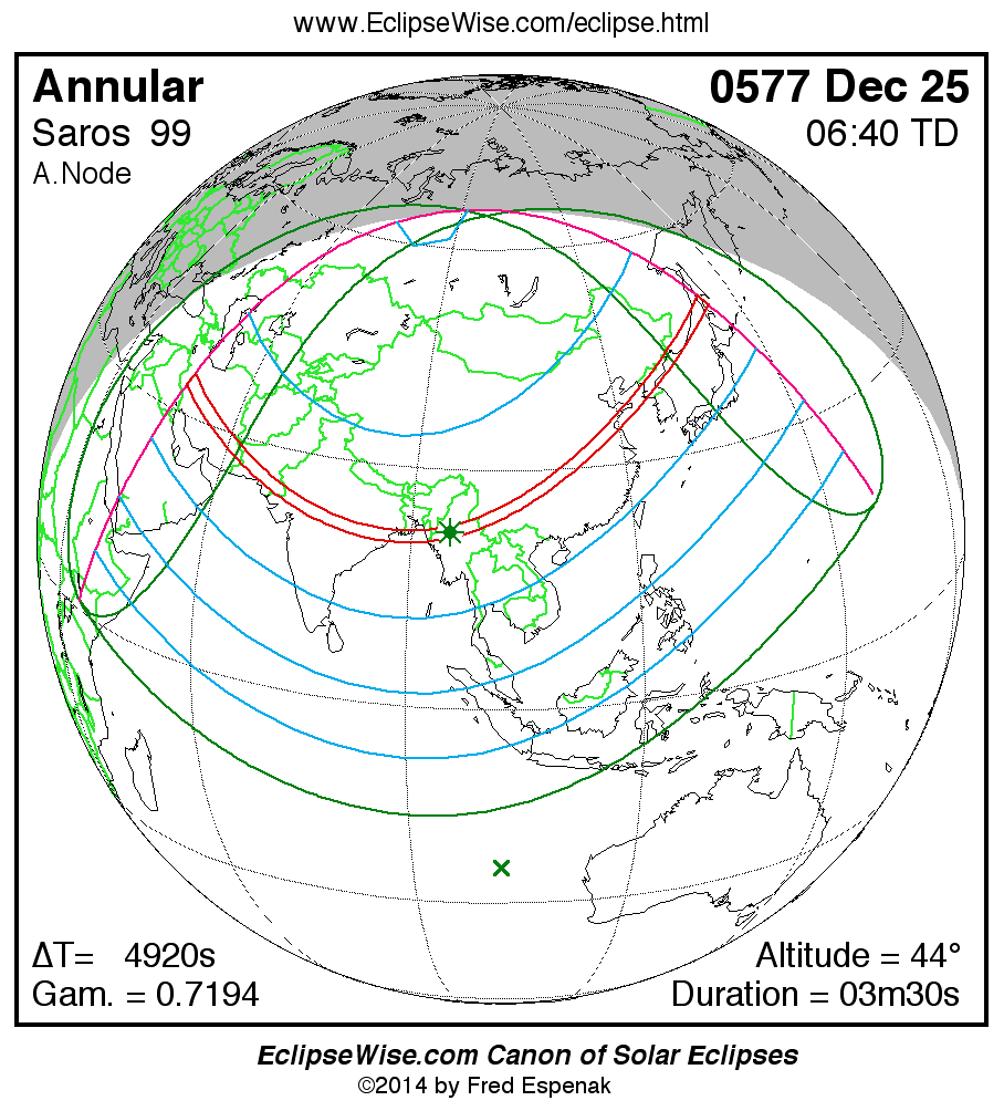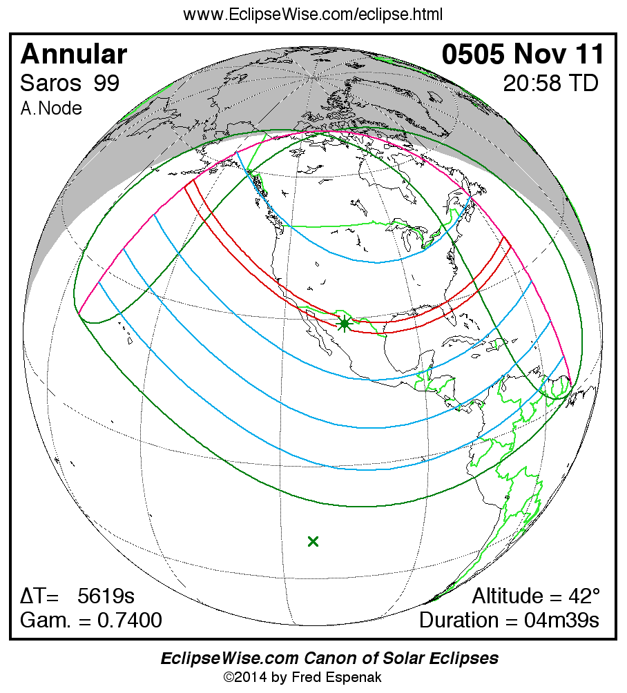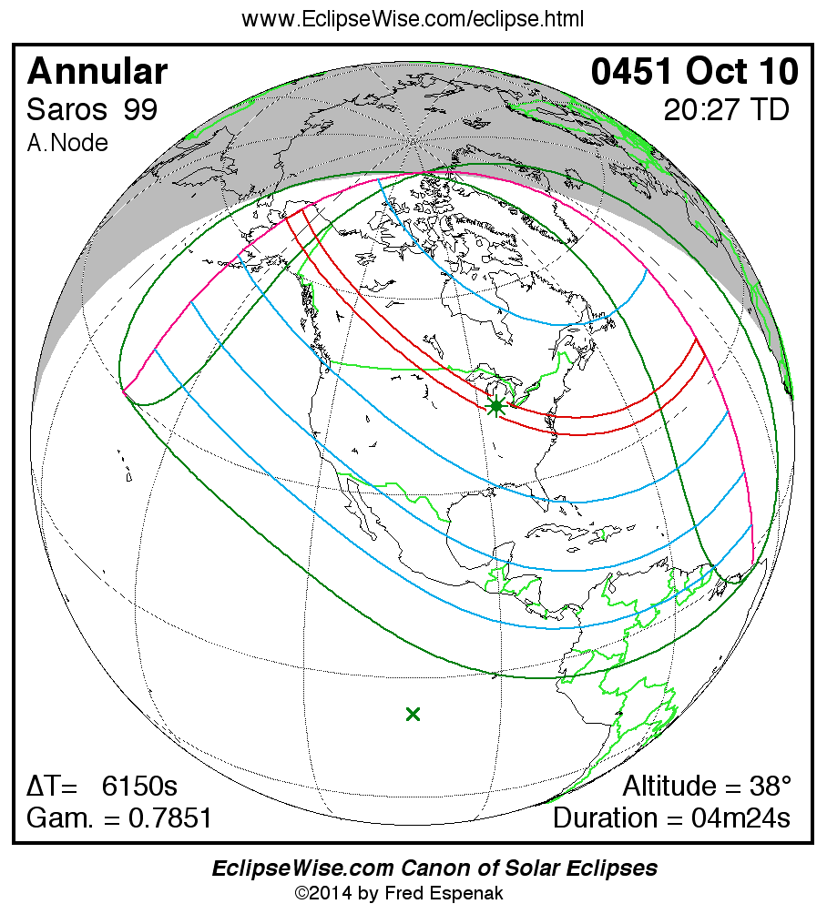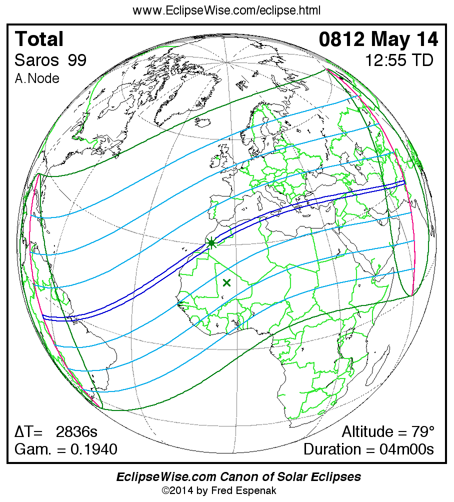 A panorama of all solar eclipses belonging to Saros 99 is presented here. Each map depicts the geographic region of visibility for a single eclipse. For central eclipses, the total or annular path is plotted in either blue (total) or red (annular). The date and time is given for the instant of Greatest Eclipse. Every map serves as a hyperlink to the EclipseWise Prime page for that eclipse where a larger map and complete details for the eclipse can be found. Visit the Key to Solar Eclipse Maps for a detailed explanation of these maps. Near the bottom of the page are a series of hyperlinks for more on solar eclipses.