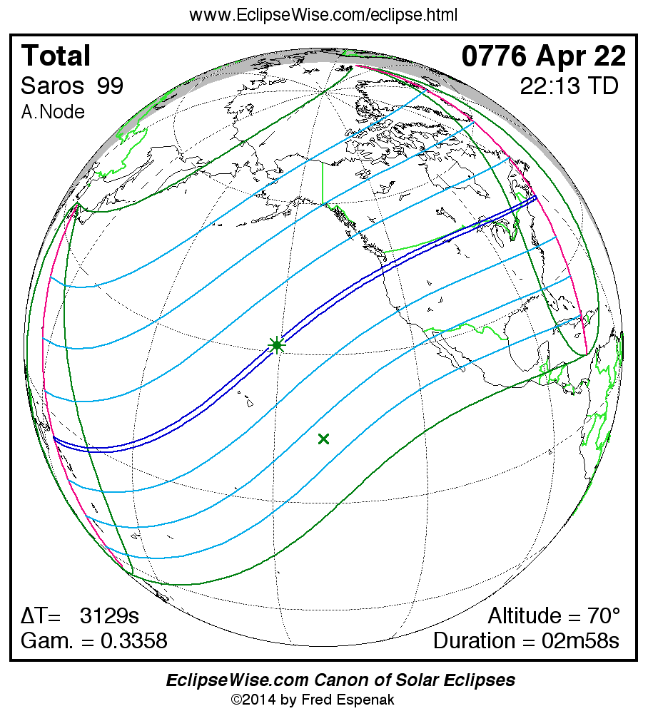 The Saros panorama below is arranged in horizontal rows of 3 eclipses. So one eclipse to the left or right is a difference of 1 Saros cycle, and one eclipse above or below is a difference of 1 exeligmos. By scanning a column of the table, it reveals how the geographic visibility of eclipses separated by an exeligmos slowly changes.