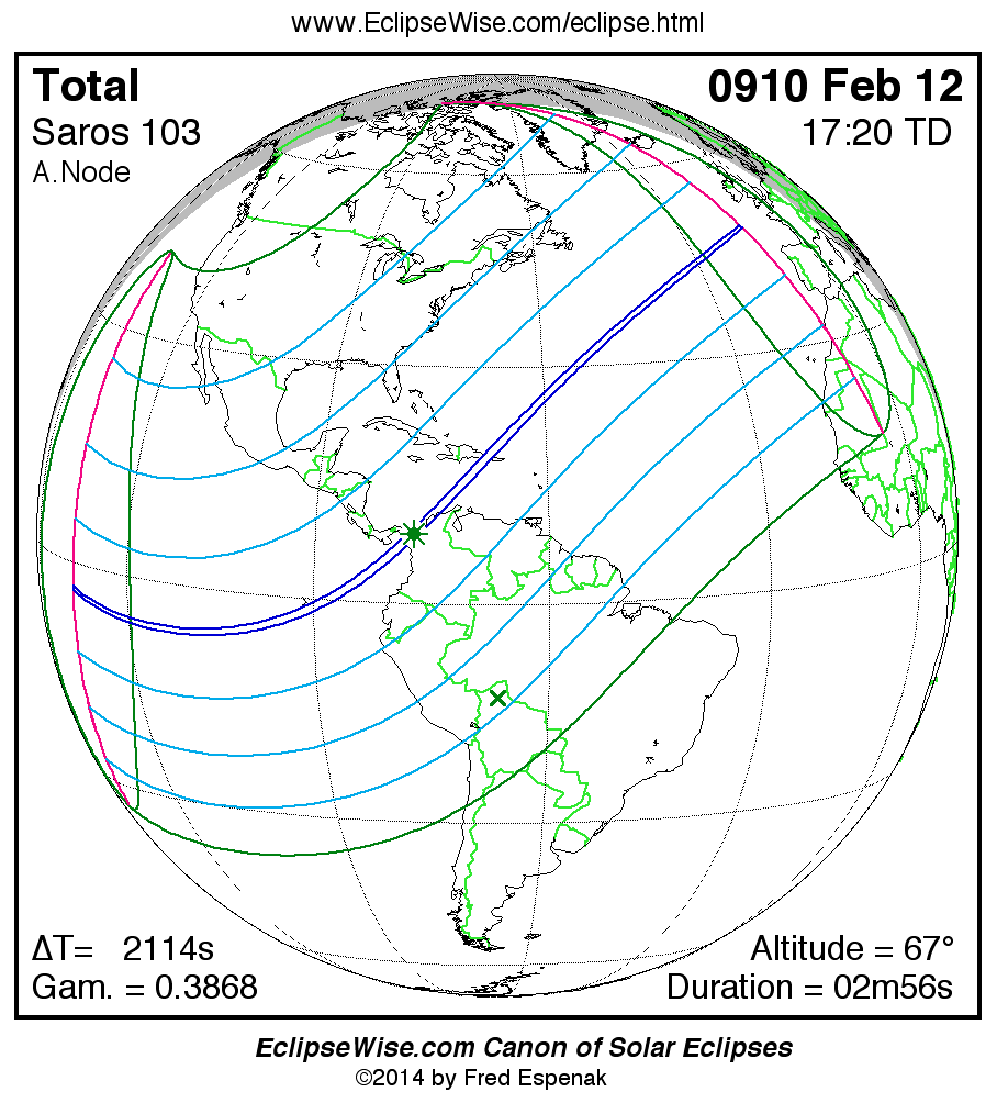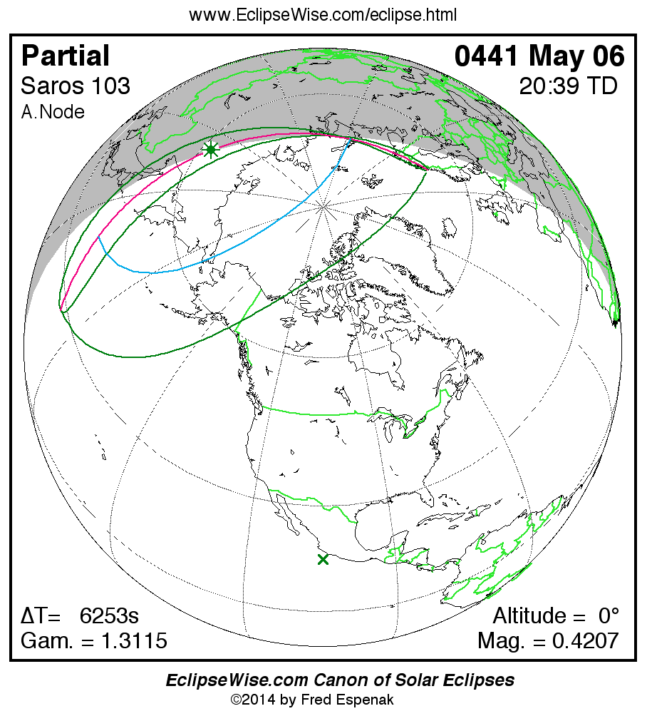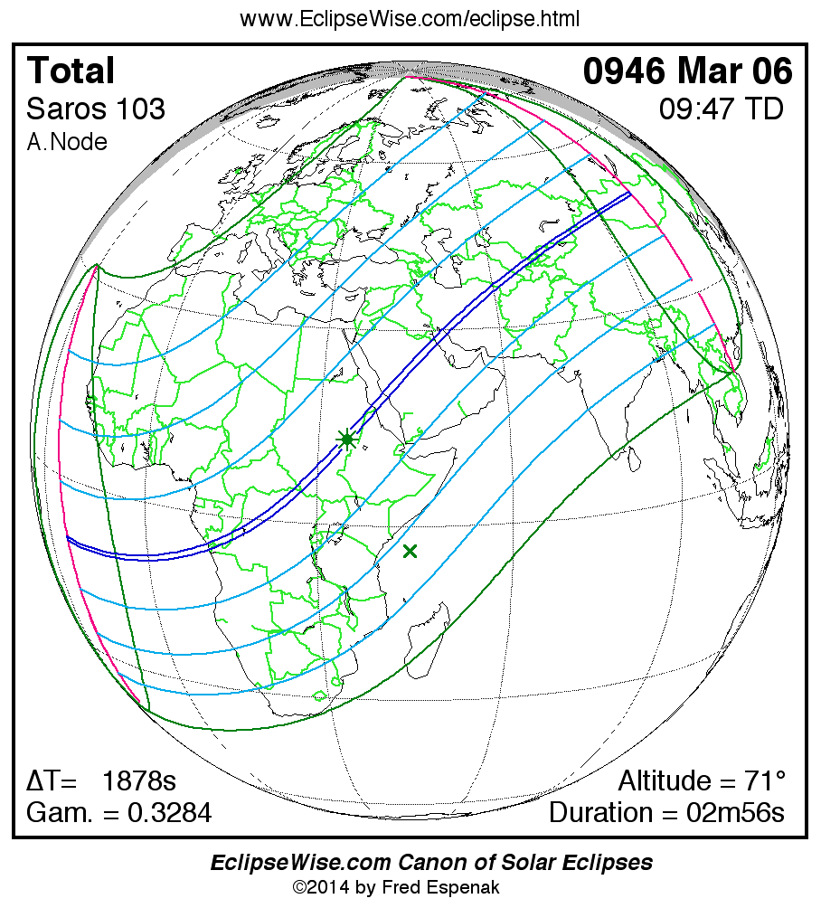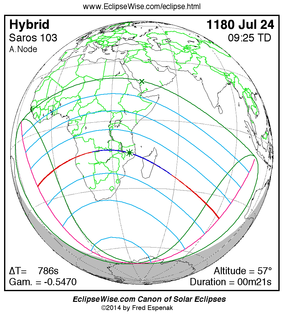 A panorama of all solar eclipses belonging to Saros 103 is presented here. Each map depicts the geographic region of visibility for a single eclipse. For central eclipses, the total or annular path is plotted in either blue (total) or red (annular). The date and time is given for the instant of Greatest Eclipse. Every map serves as a hyperlink to the EclipseWise Prime page for that eclipse where a larger map and complete details for the eclipse can be found. Visit the Key to Solar Eclipse Maps for a detailed explanation of these maps. Near the bottom of the page are a series of hyperlinks for more on solar eclipses.