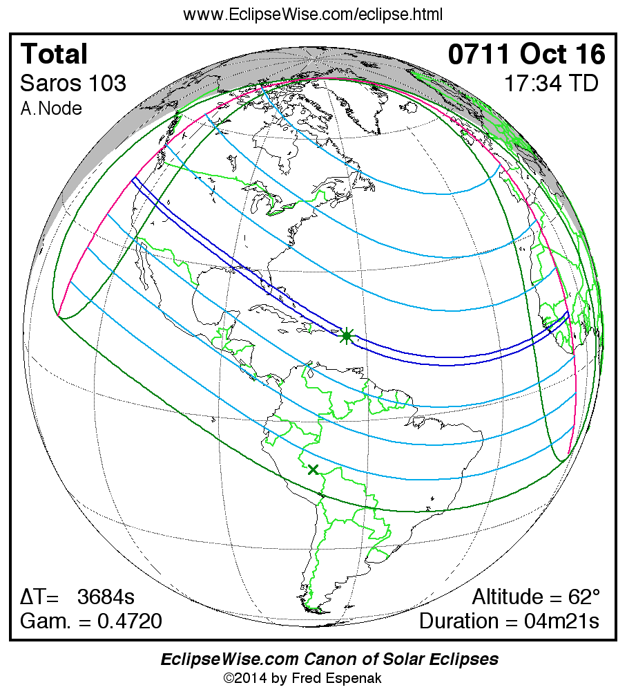 The Saros panorama below is arranged in horizontal rows of 3 eclipses. So one eclipse to the left or right is a difference of 1 Saros cycle, and one eclipse above or below is a difference of 1 exeligmos. By scanning a column of the table, it reveals how the geographic visibility of eclipses separated by an exeligmos slowly changes.