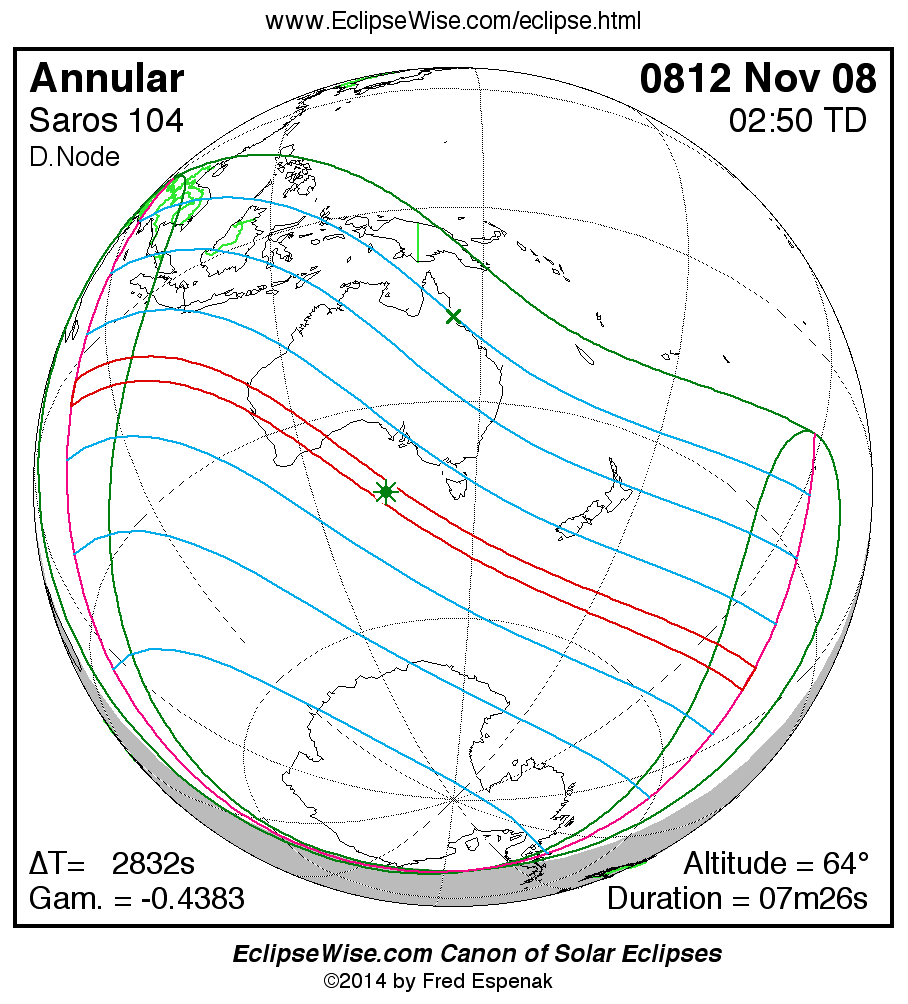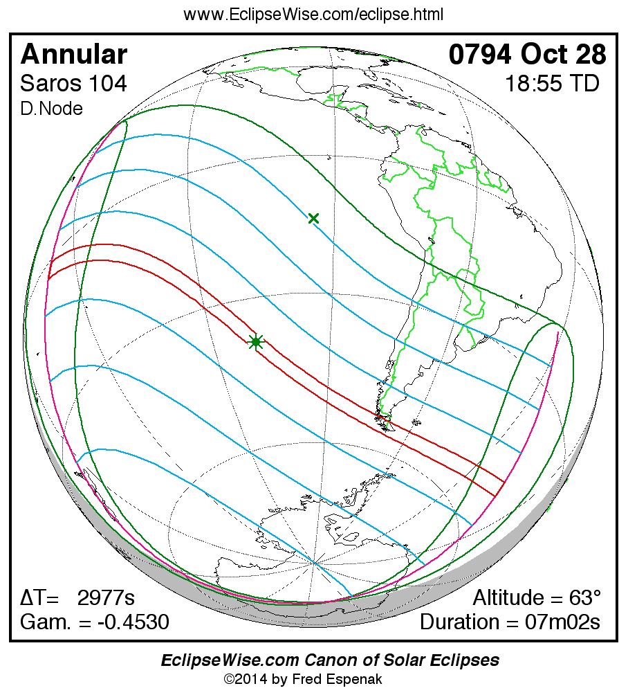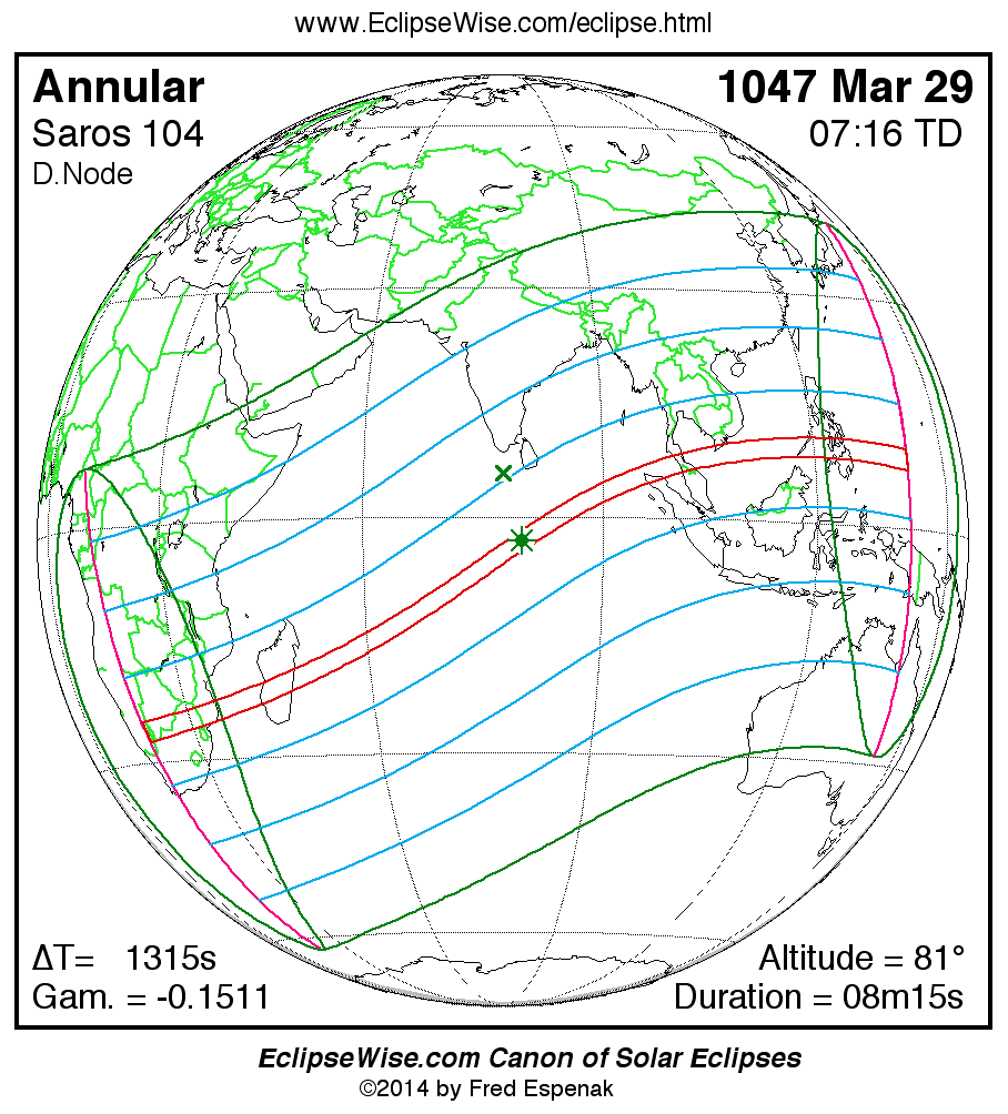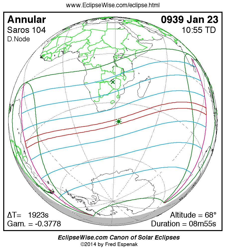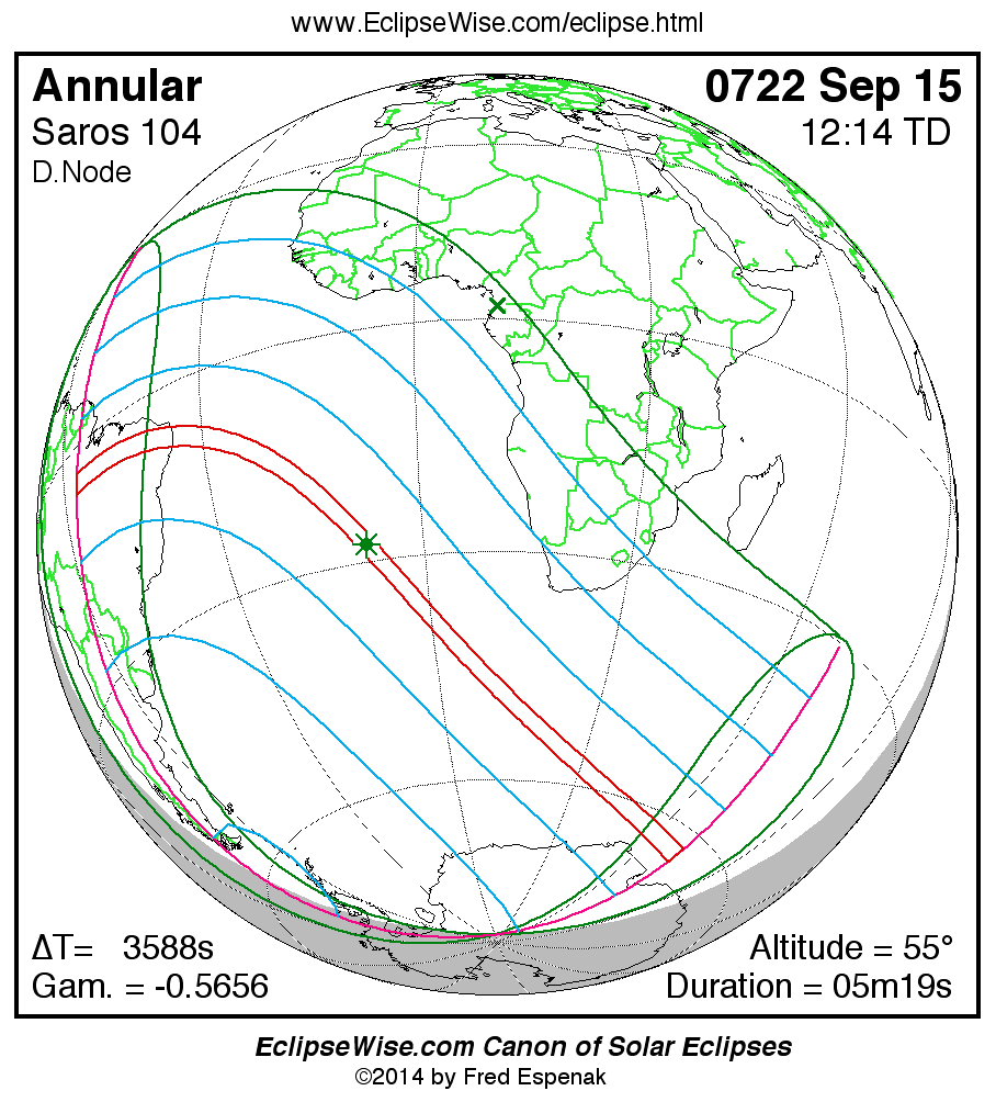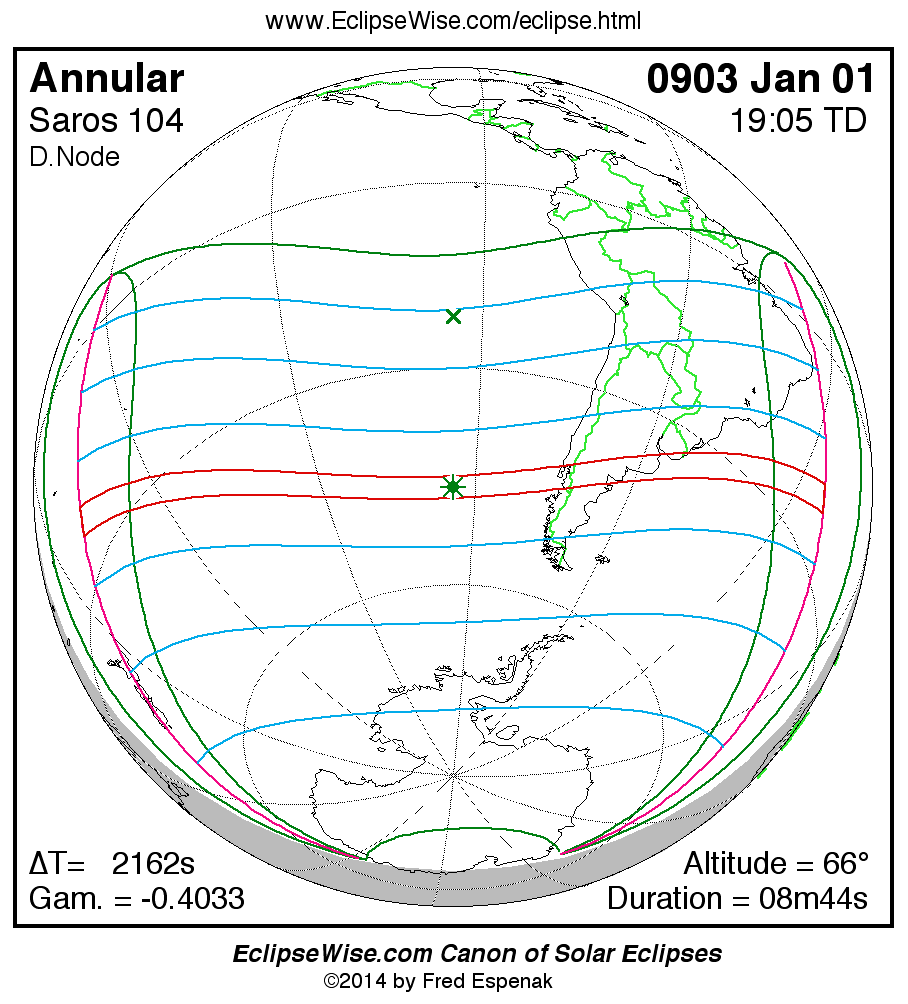A panorama of all solar eclipses belonging to Saros 104 is presented here. Each map depicts the geographic region of visibility for a single eclipse. For central eclipses, the total or annular path is plotted in either blue (total) or red (annular). The date and time is given for the instant of Greatest Eclipse. Every map serves as a hyperlink to the EclipseWise Prime page for that eclipse where a larger map and complete details for the eclipse can be found. Visit the Key to Solar Eclipse Maps for a detailed explanation of these maps. Near the bottom of the page are a series of hyperlinks for more on solar eclipses.