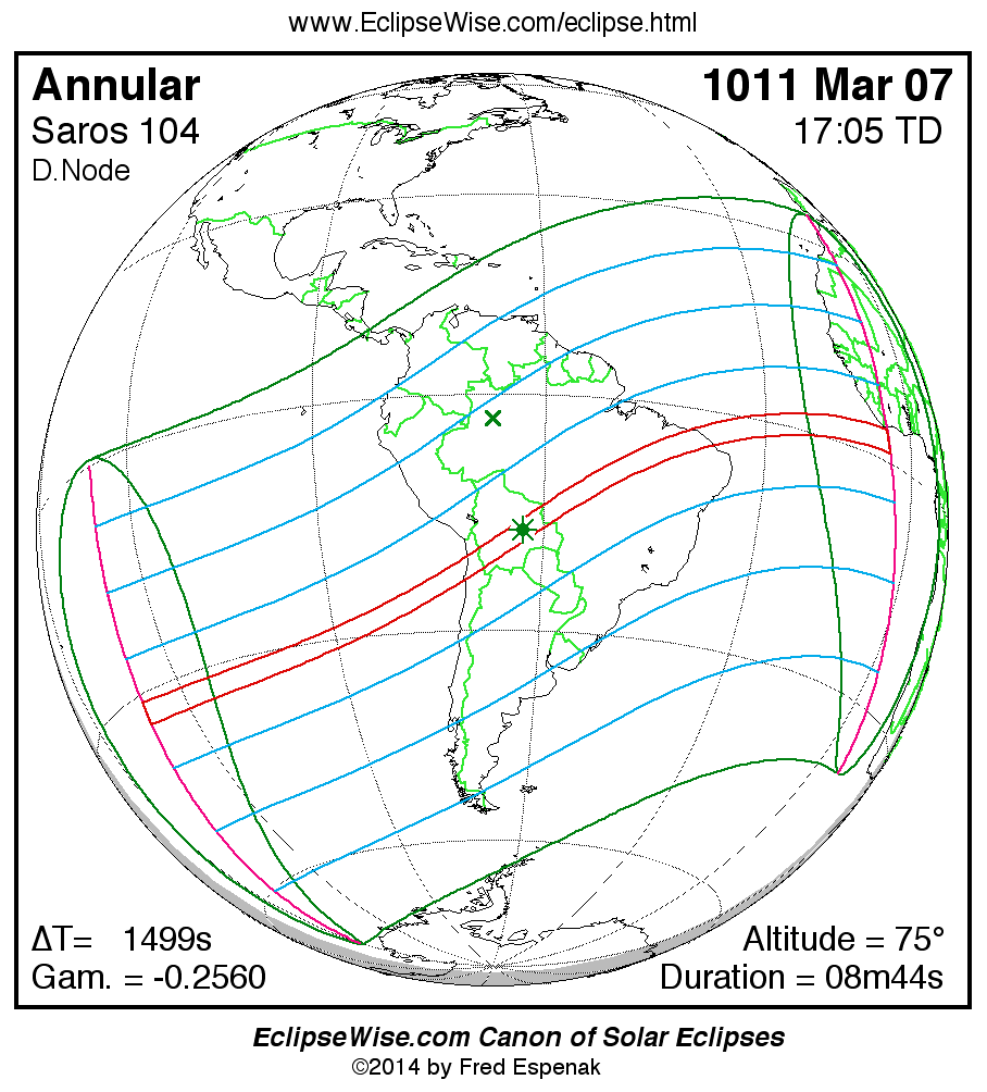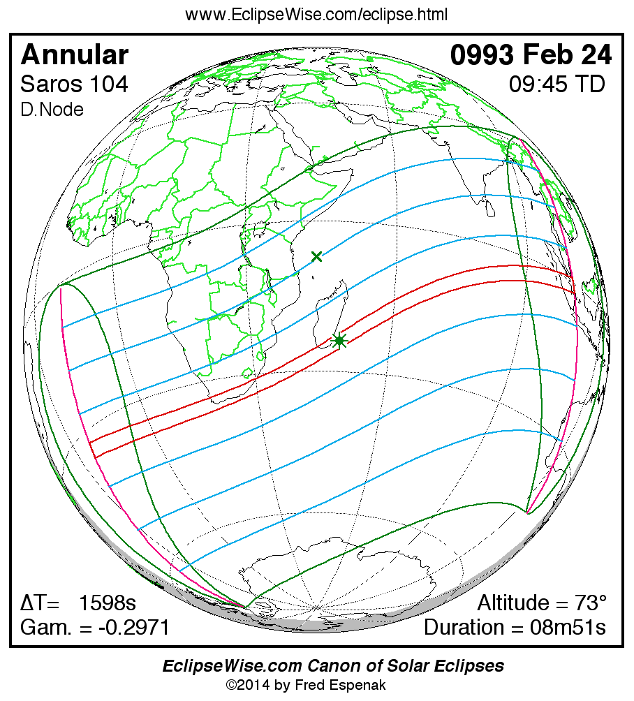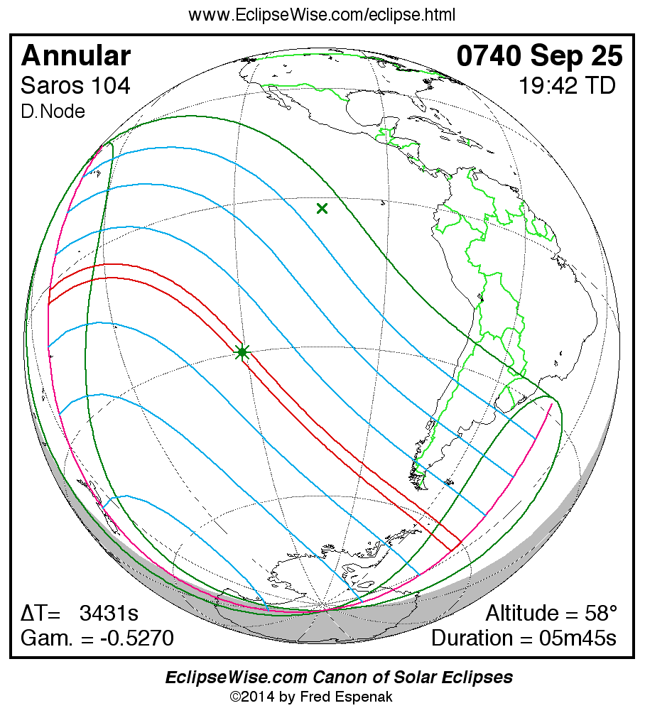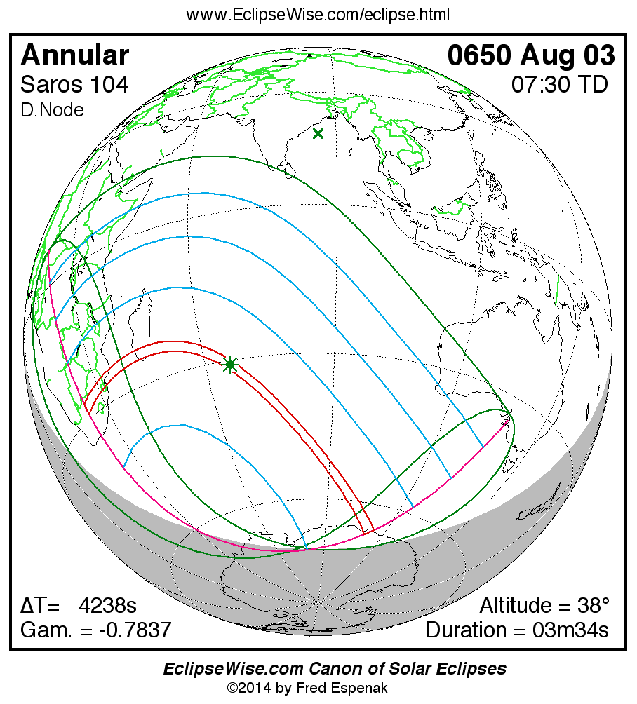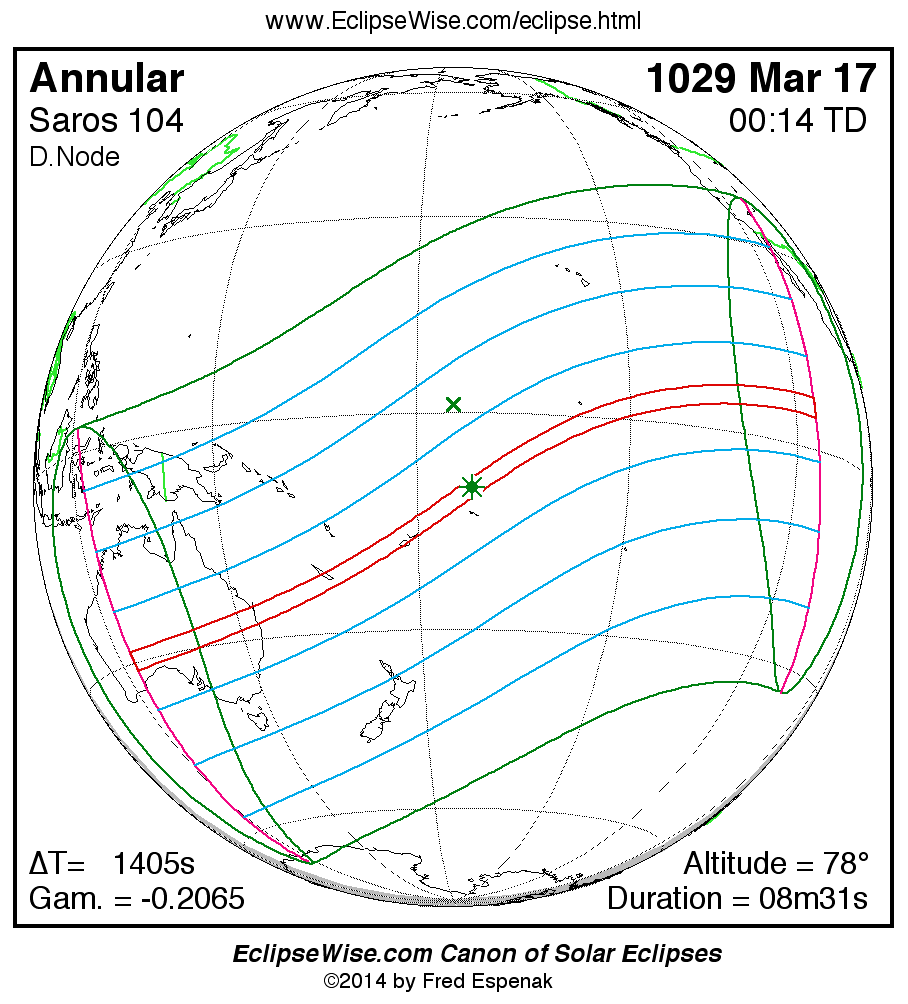 A panorama of all solar eclipses belonging to Saros 104 is presented here. Each map depicts the geographic region of visibility for a single eclipse. For central eclipses, the total or annular path is plotted in either blue (total) or red (annular). The date and time is given for the instant of Greatest Eclipse. Every map serves as a hyperlink to the EclipseWise Prime page for that eclipse where a larger map and complete details for the eclipse can be found. Visit the Key to Solar Eclipse Maps for a detailed explanation of these maps. Near the bottom of the page are a series of hyperlinks for more on solar eclipses.
