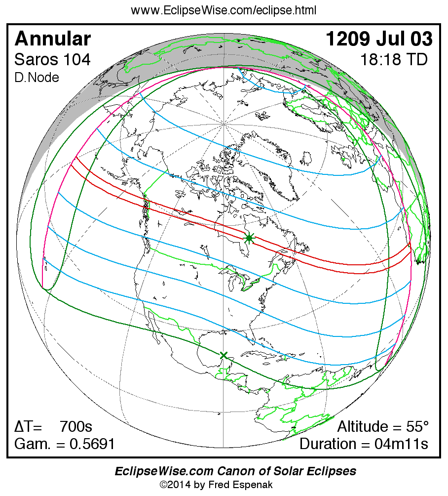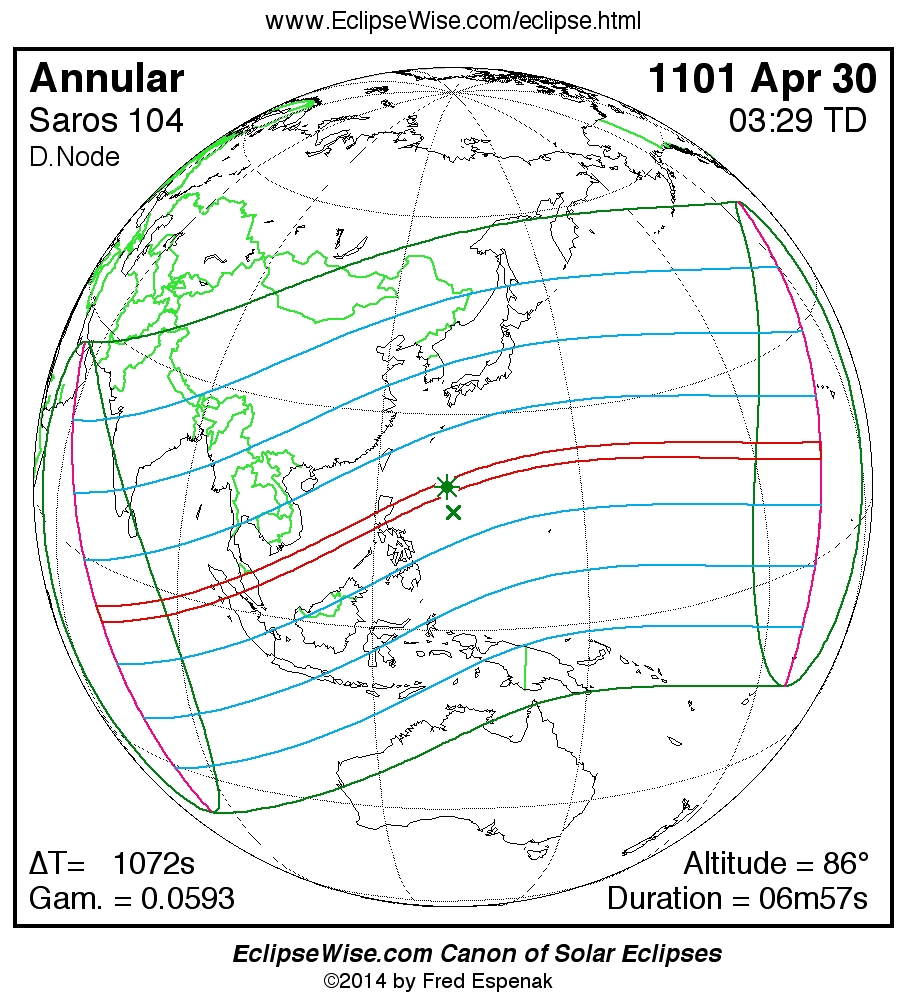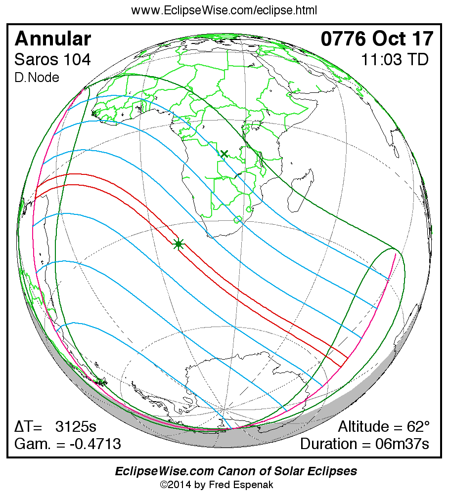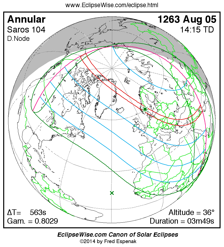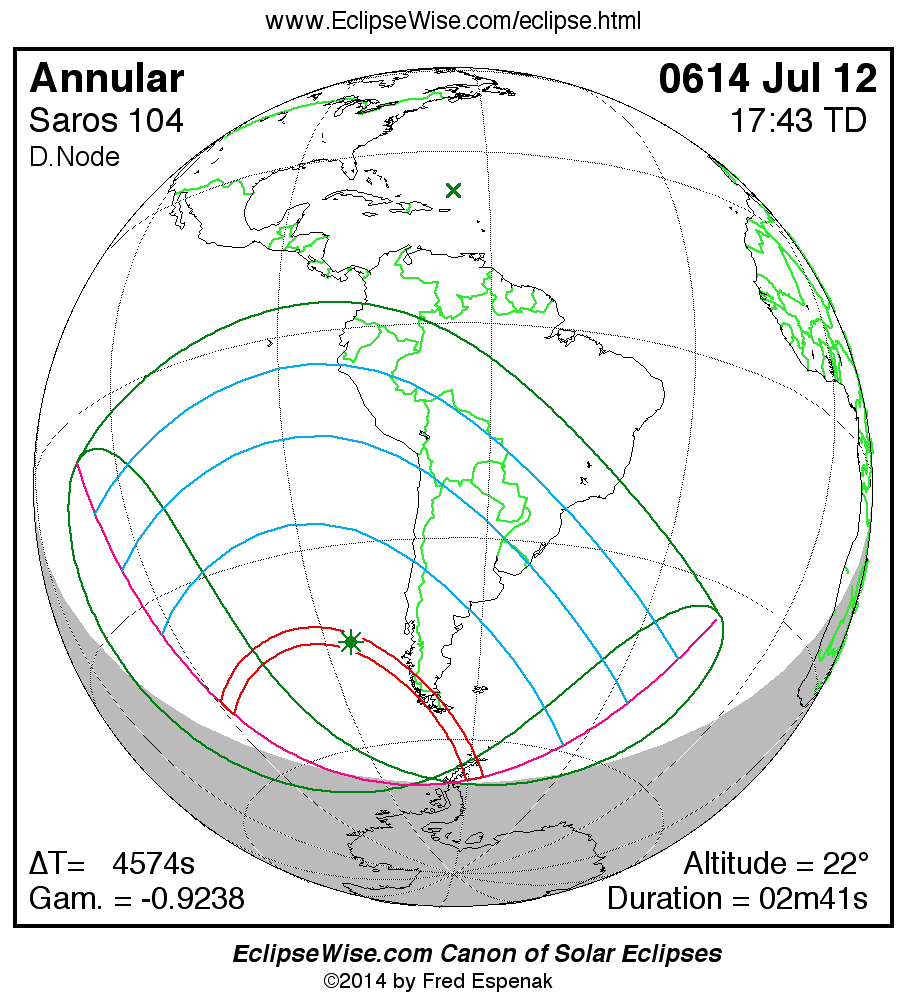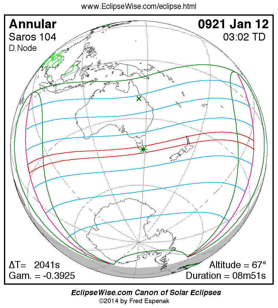 A panorama of all solar eclipses belonging to Saros 104 is presented here. Each map depicts the geographic region of visibility for a single eclipse. For central eclipses, the total or annular path is plotted in either blue (total) or red (annular). The date and time is given for the instant of Greatest Eclipse. Every map serves as a hyperlink to the EclipseWise Prime page for that eclipse where a larger map and complete details for the eclipse can be found. Visit the Key to Solar Eclipse Maps for a detailed explanation of these maps. Near the bottom of the page are a series of hyperlinks for more on solar eclipses.