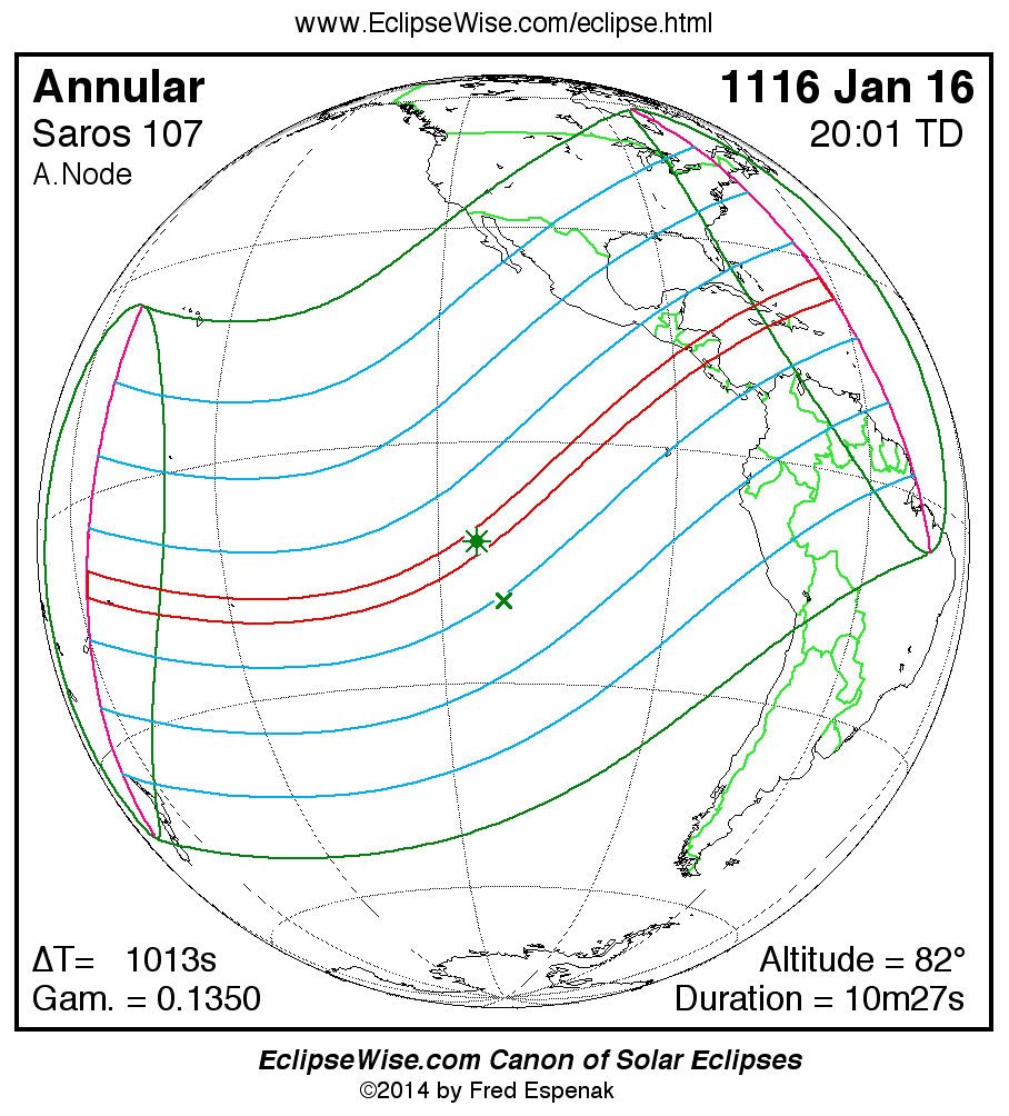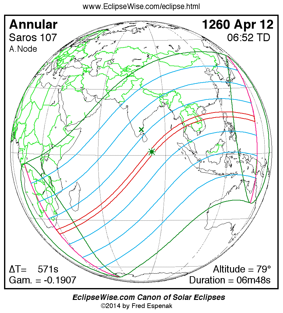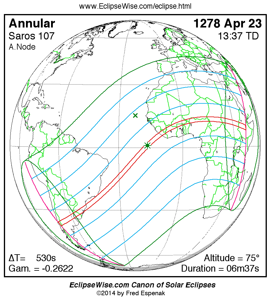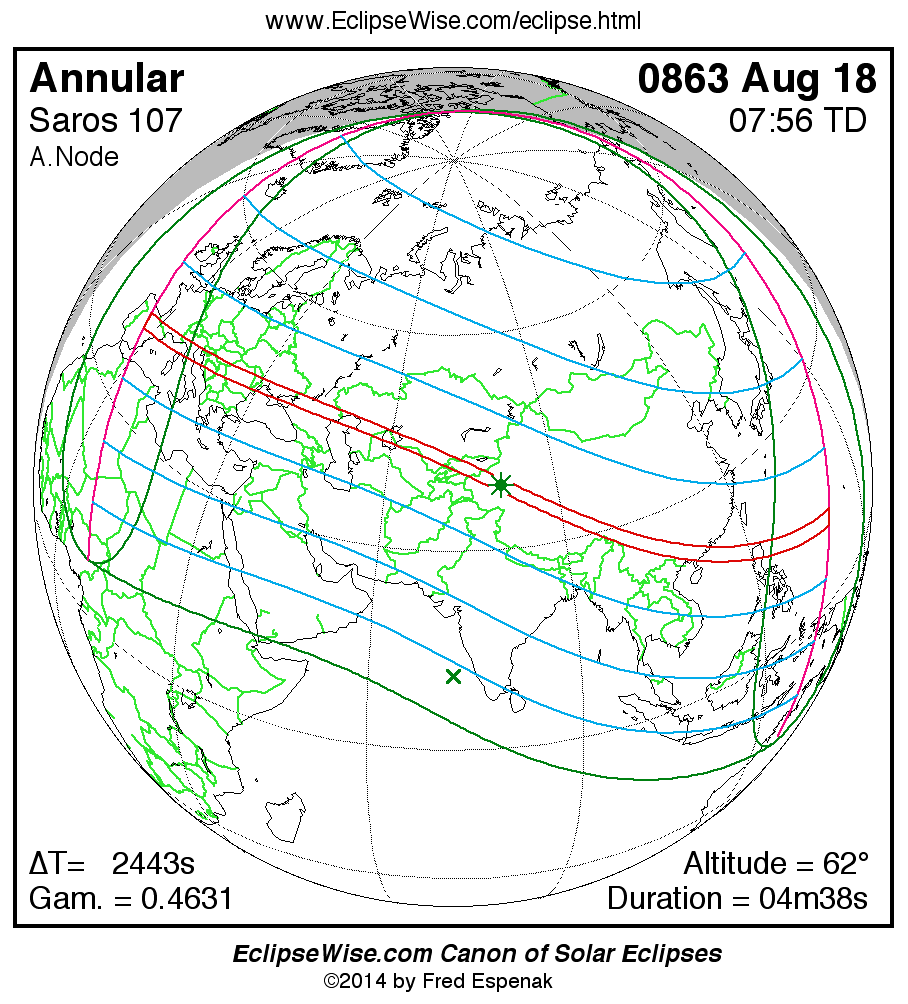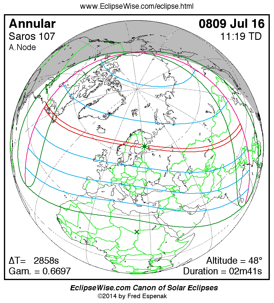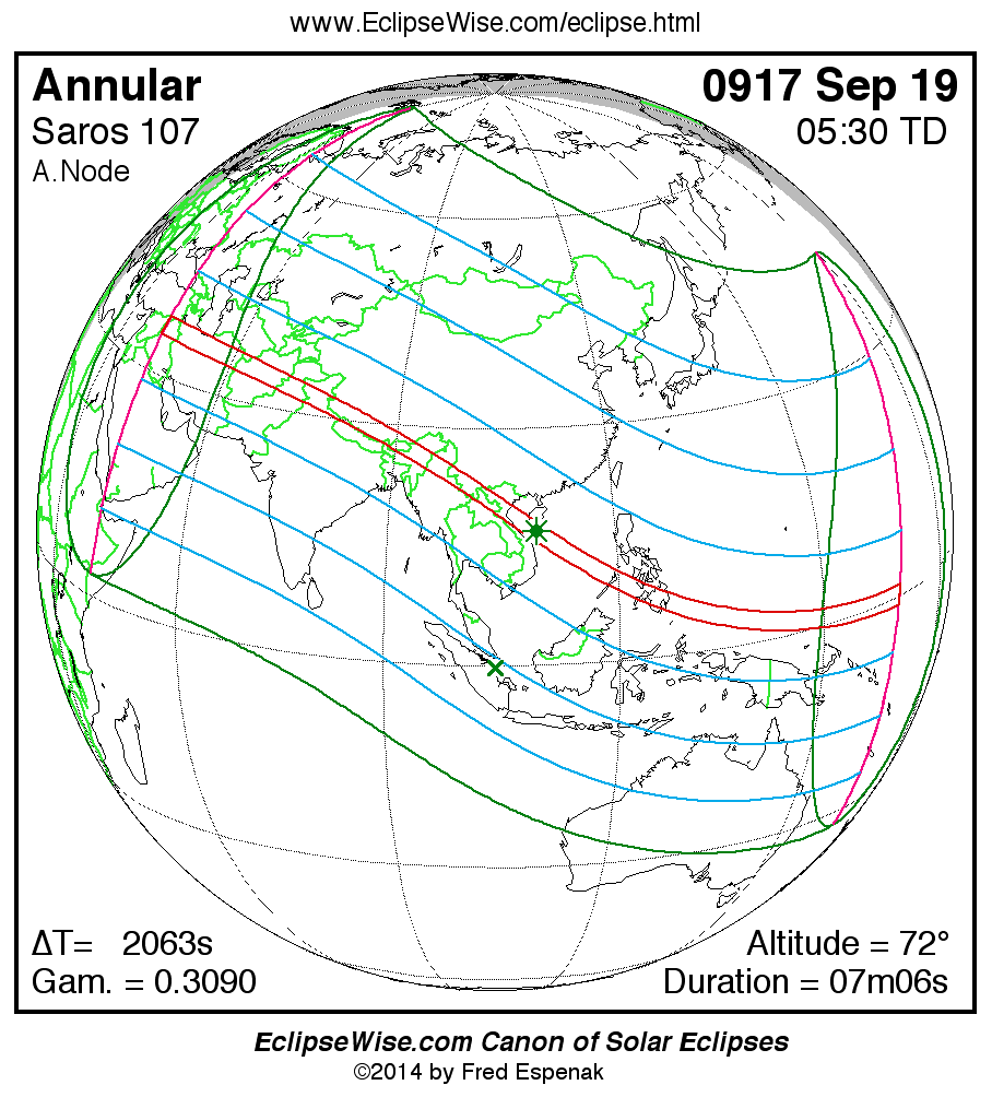 A panorama of all solar eclipses belonging to Saros 107 is presented here. Each map depicts the geographic region of visibility for a single eclipse. For central eclipses, the total or annular path is plotted in either blue (total) or red (annular). The date and time is given for the instant of Greatest Eclipse. Every map serves as a hyperlink to the EclipseWise Prime page for that eclipse where a larger map and complete details for the eclipse can be found. Visit the Key to Solar Eclipse Maps for a detailed explanation of these maps. Near the bottom of the page are a series of hyperlinks for more on solar eclipses.