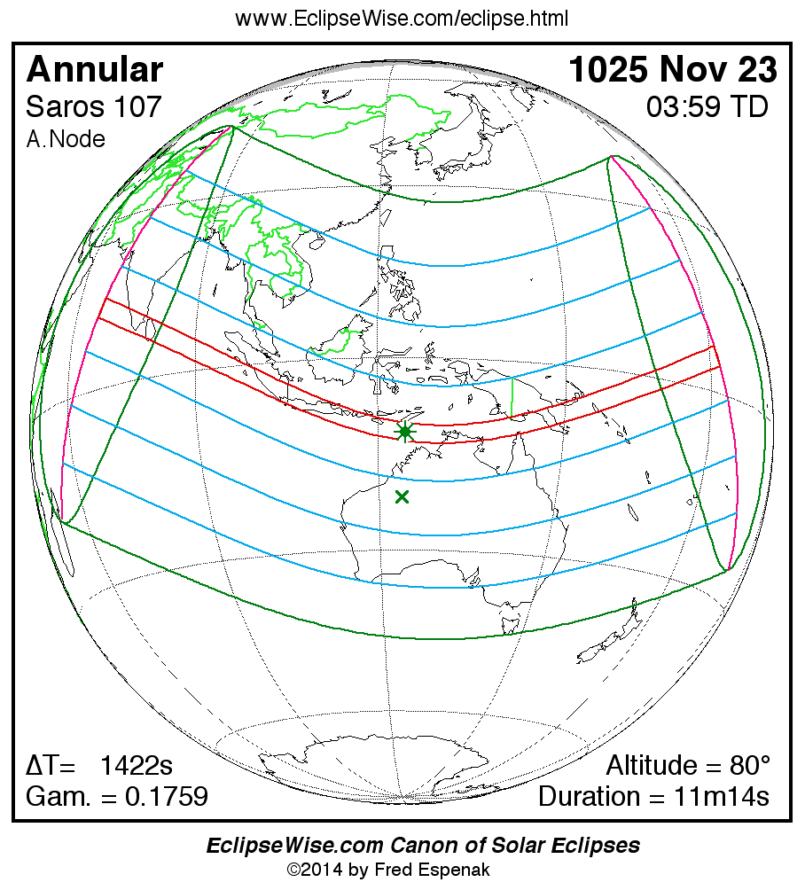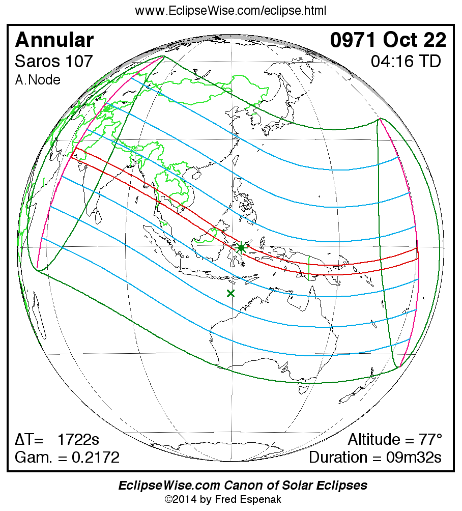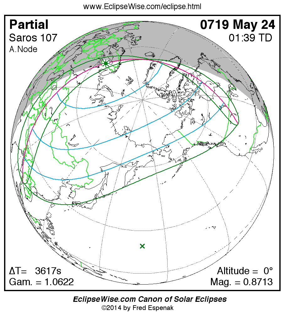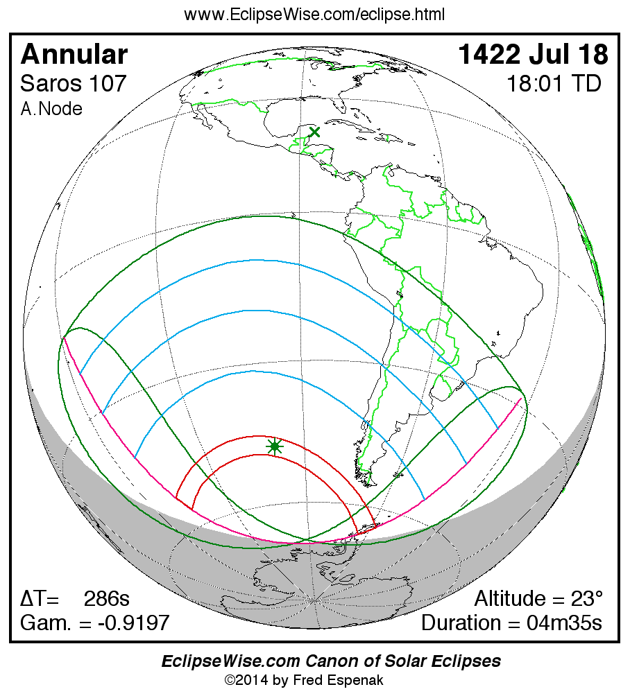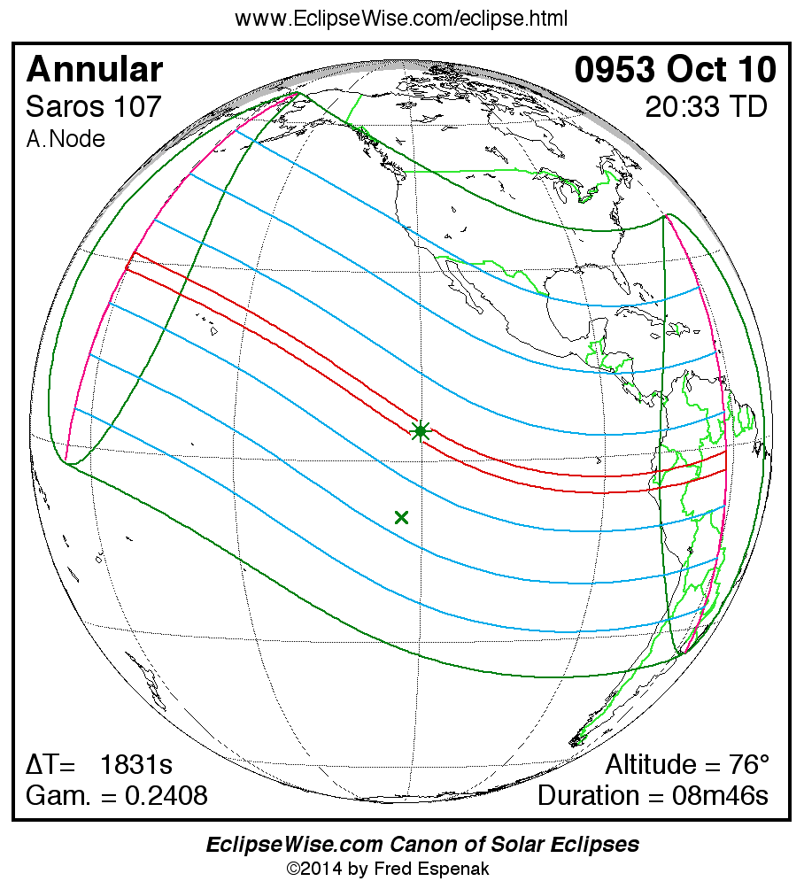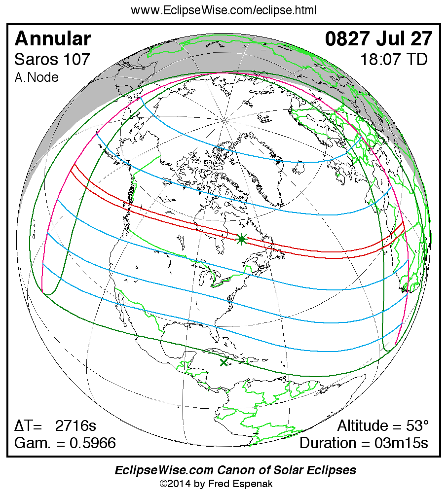 A panorama of all solar eclipses belonging to Saros 107 is presented here. Each map depicts the geographic region of visibility for a single eclipse. For central eclipses, the total or annular path is plotted in either blue (total) or red (annular). The date and time is given for the instant of Greatest Eclipse. Every map serves as a hyperlink to the EclipseWise Prime page for that eclipse where a larger map and complete details for the eclipse can be found. Visit the Key to Solar Eclipse Maps for a detailed explanation of these maps. Near the bottom of the page are a series of hyperlinks for more on solar eclipses.