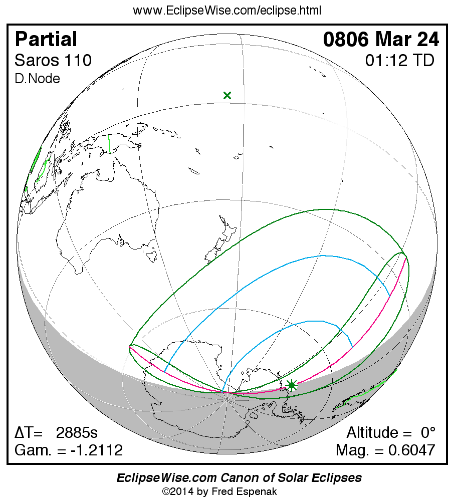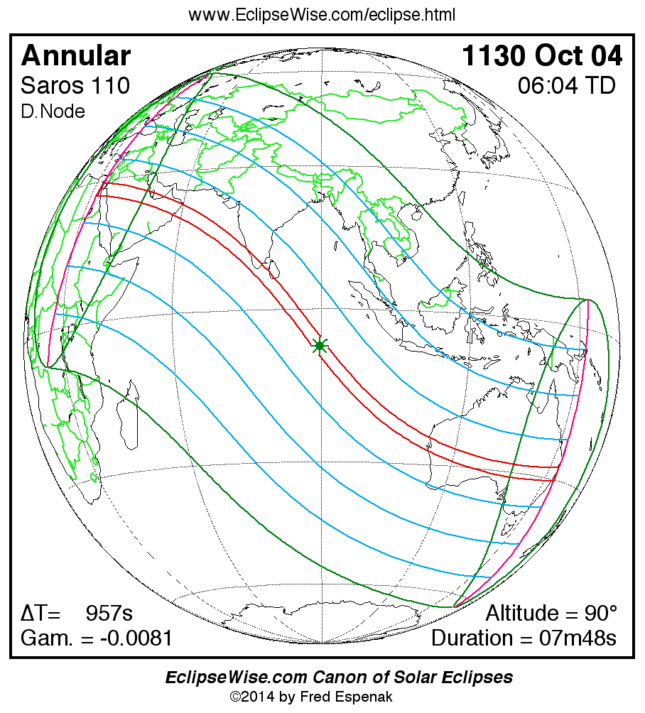 A panorama of all solar eclipses belonging to Saros 110 is presented here. Each map depicts the geographic region of visibility for a single eclipse. For central eclipses, the total or annular path is plotted in either blue (total) or red (annular). The date and time is given for the instant of Greatest Eclipse. Every map serves as a hyperlink to the EclipseWise Prime page for that eclipse where a larger map and complete details for the eclipse can be found. Visit the Key to Solar Eclipse Maps for a detailed explanation of these maps. Near the bottom of the page are a series of hyperlinks for more on solar eclipses.