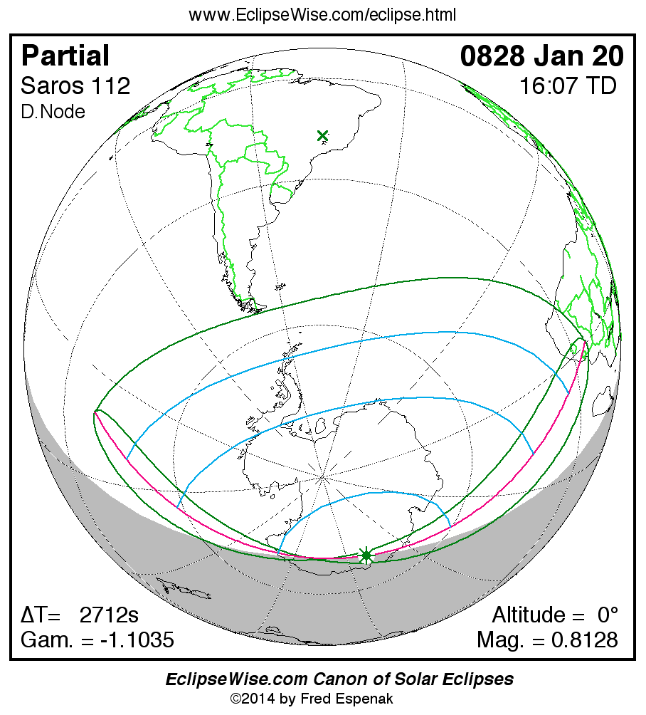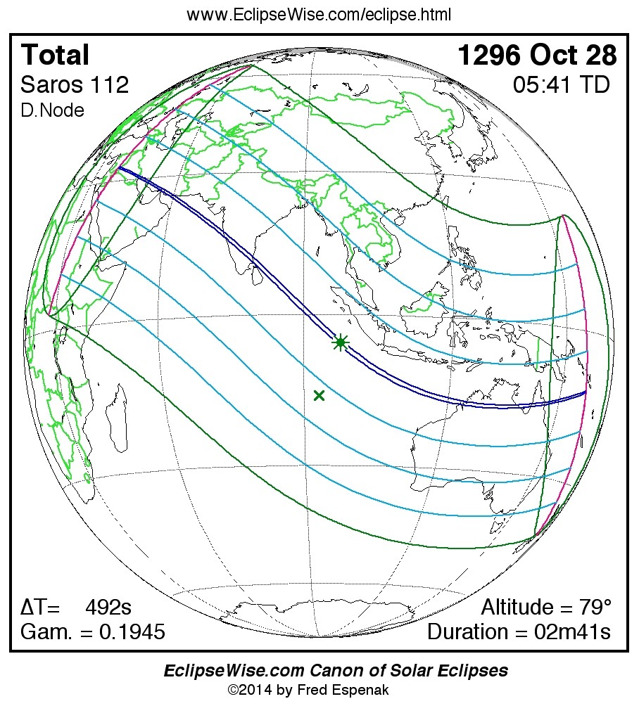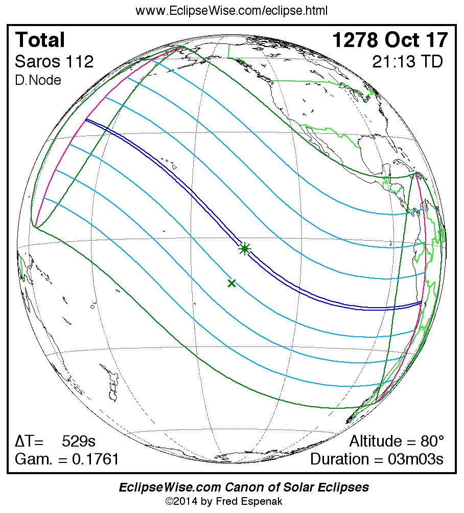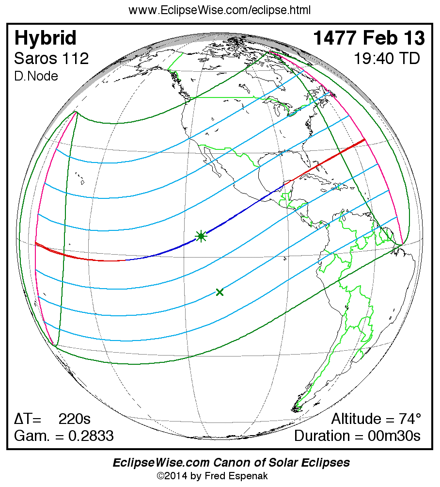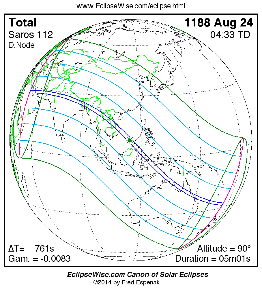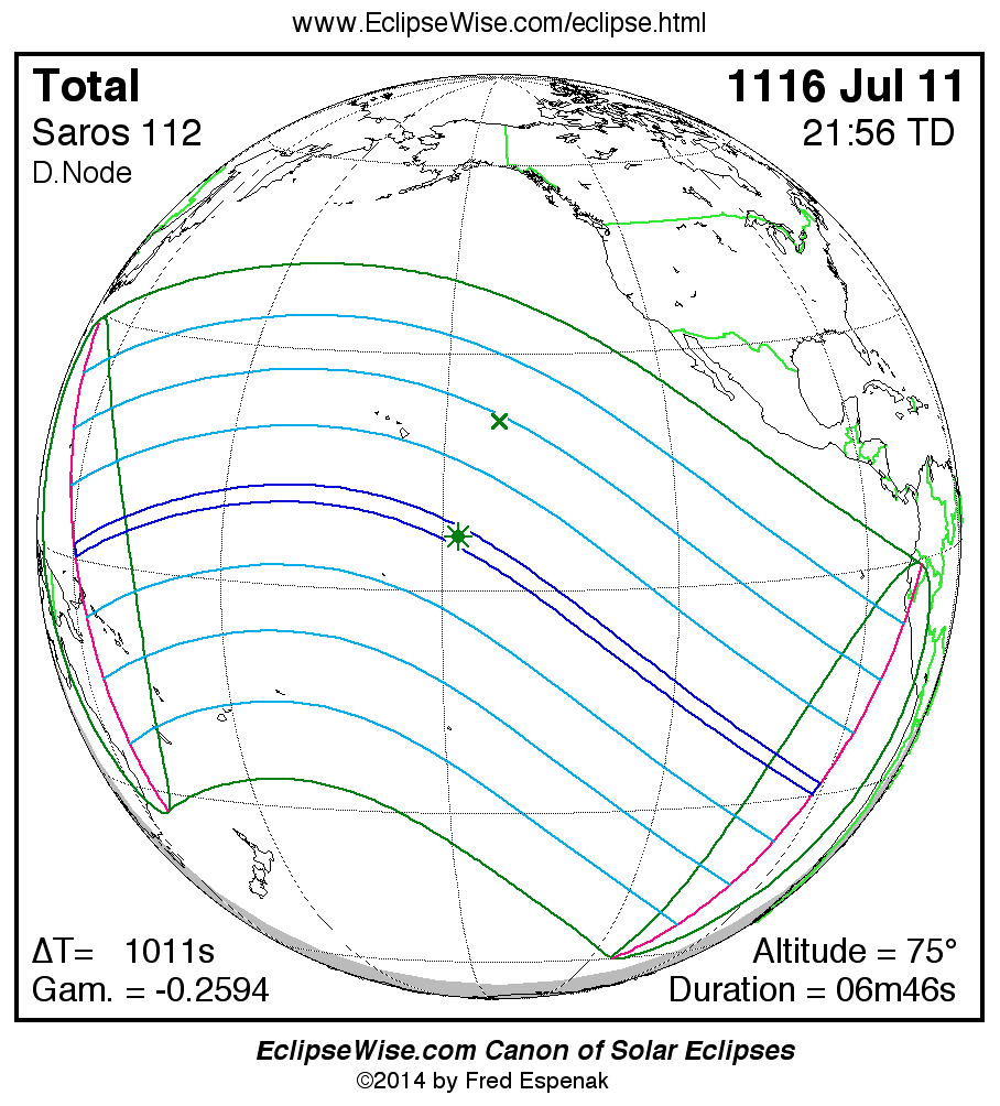 A panorama of all solar eclipses belonging to Saros 112 is presented here. Each map depicts the geographic region of visibility for a single eclipse. For central eclipses, the total or annular path is plotted in either blue (total) or red (annular). The date and time is given for the instant of Greatest Eclipse. Every map serves as a hyperlink to the EclipseWise Prime page for that eclipse where a larger map and complete details for the eclipse can be found. Visit the Key to Solar Eclipse Maps for a detailed explanation of these maps. Near the bottom of the page are a series of hyperlinks for more on solar eclipses.
