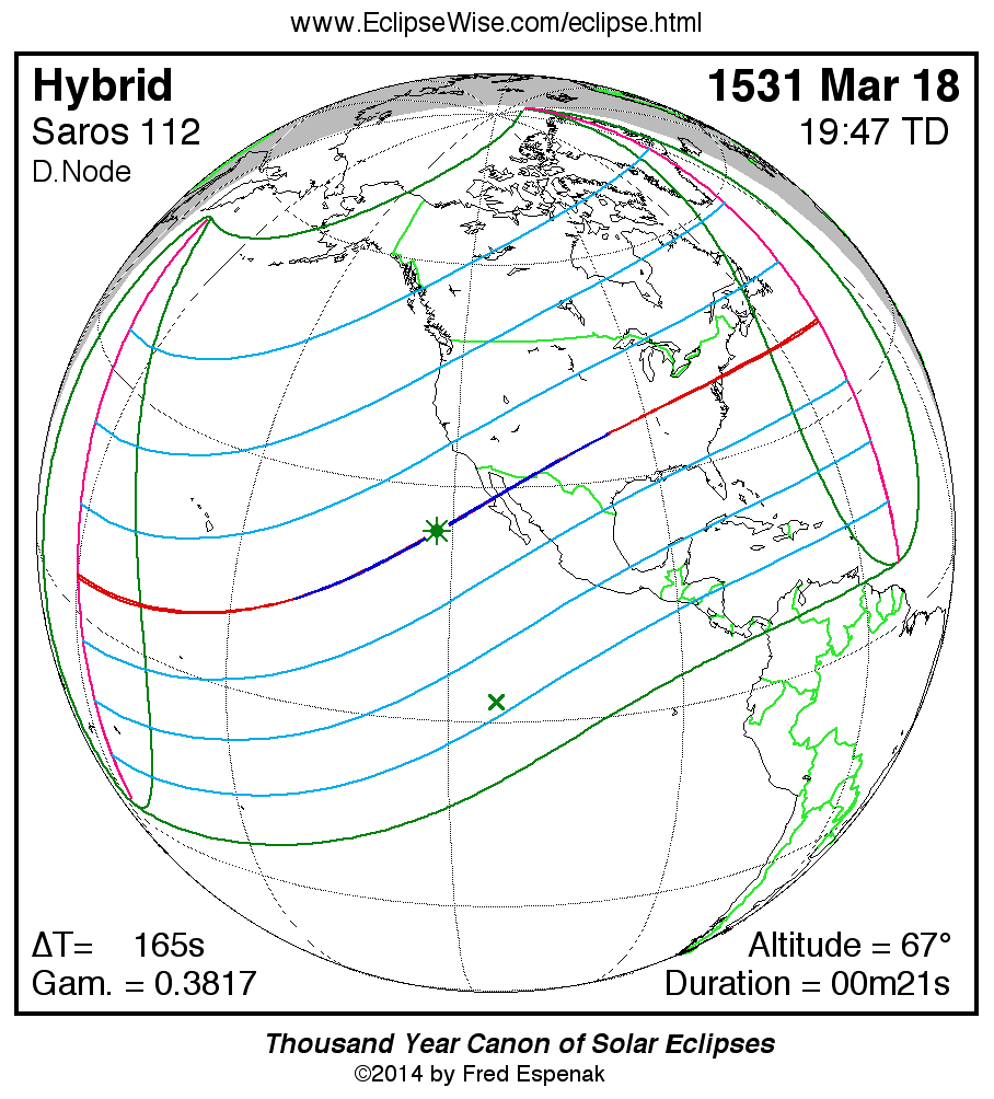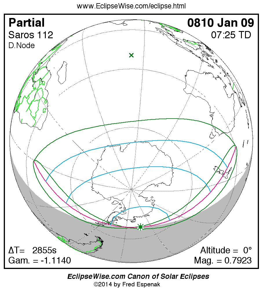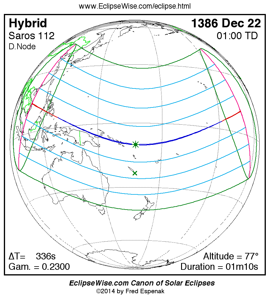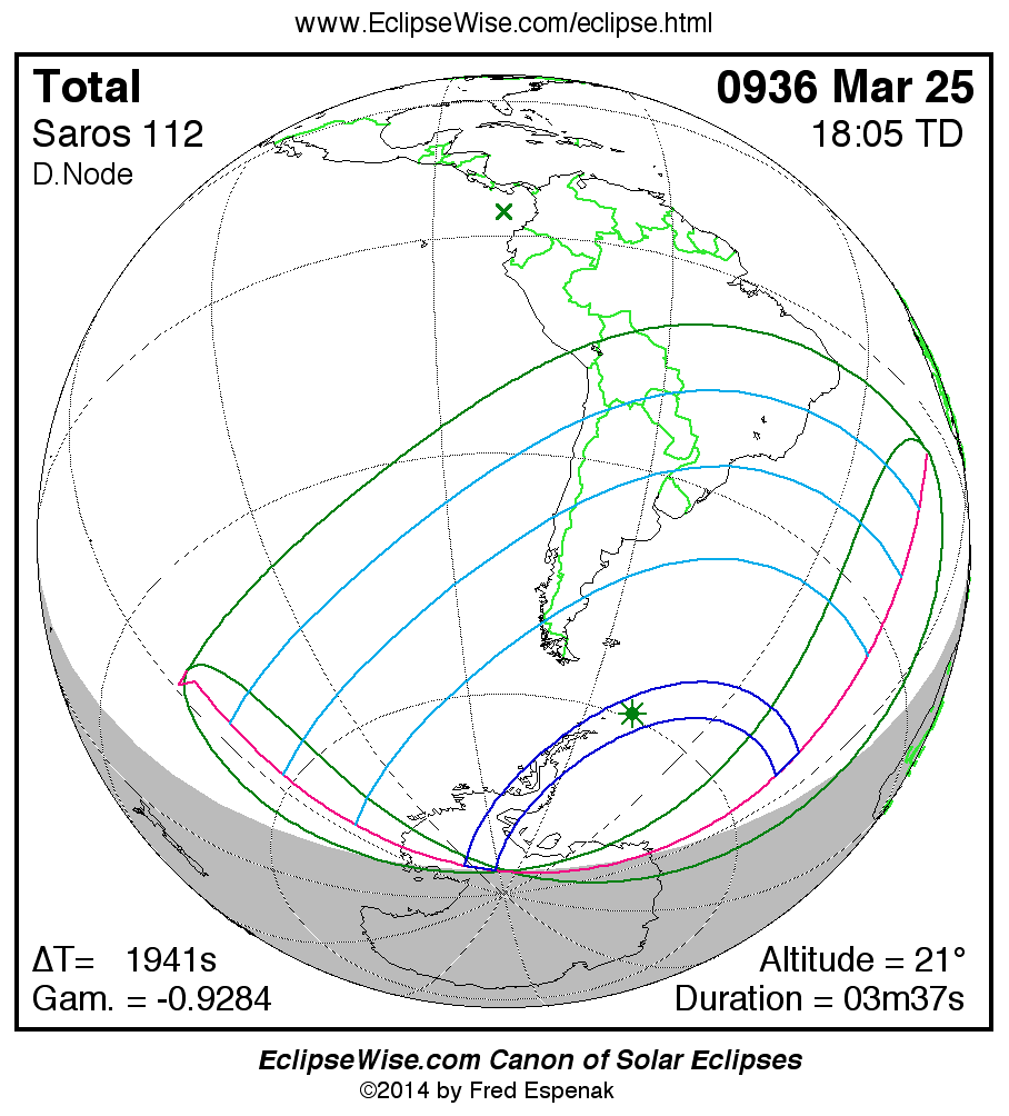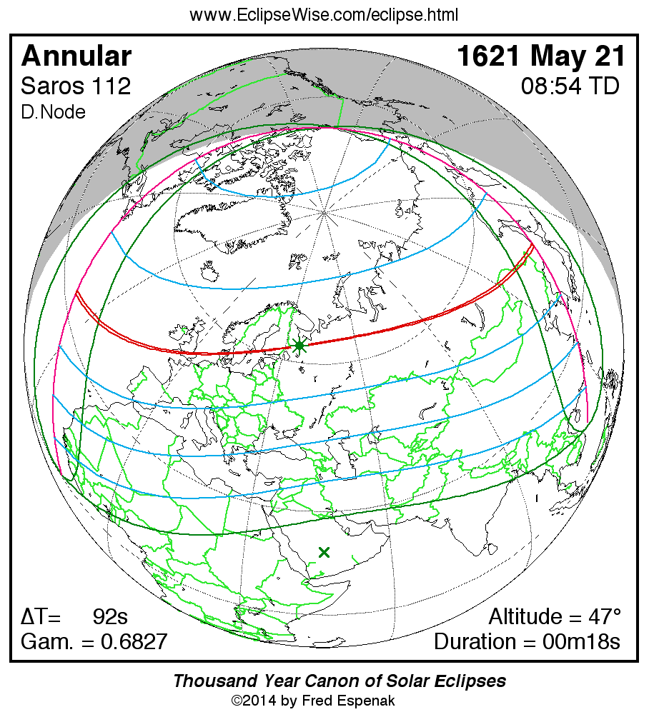 A panorama of all solar eclipses belonging to Saros 112 is presented here. Each map depicts the geographic region of visibility for a single eclipse. For central eclipses, the total or annular path is plotted in either blue (total) or red (annular). The date and time is given for the instant of Greatest Eclipse. Every map serves as a hyperlink to the EclipseWise Prime page for that eclipse where a larger map and complete details for the eclipse can be found. Visit the Key to Solar Eclipse Maps for a detailed explanation of these maps. Near the bottom of the page are a series of hyperlinks for more on solar eclipses.