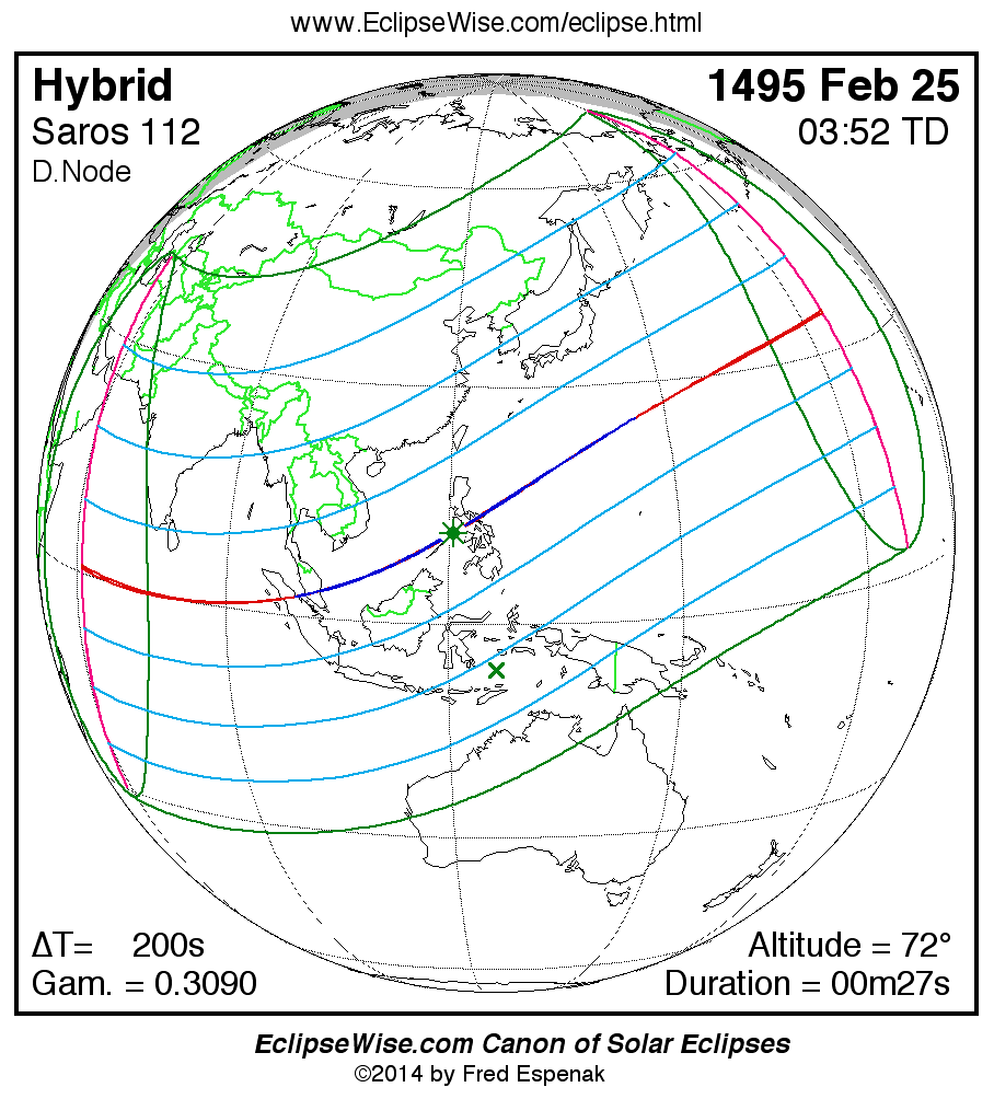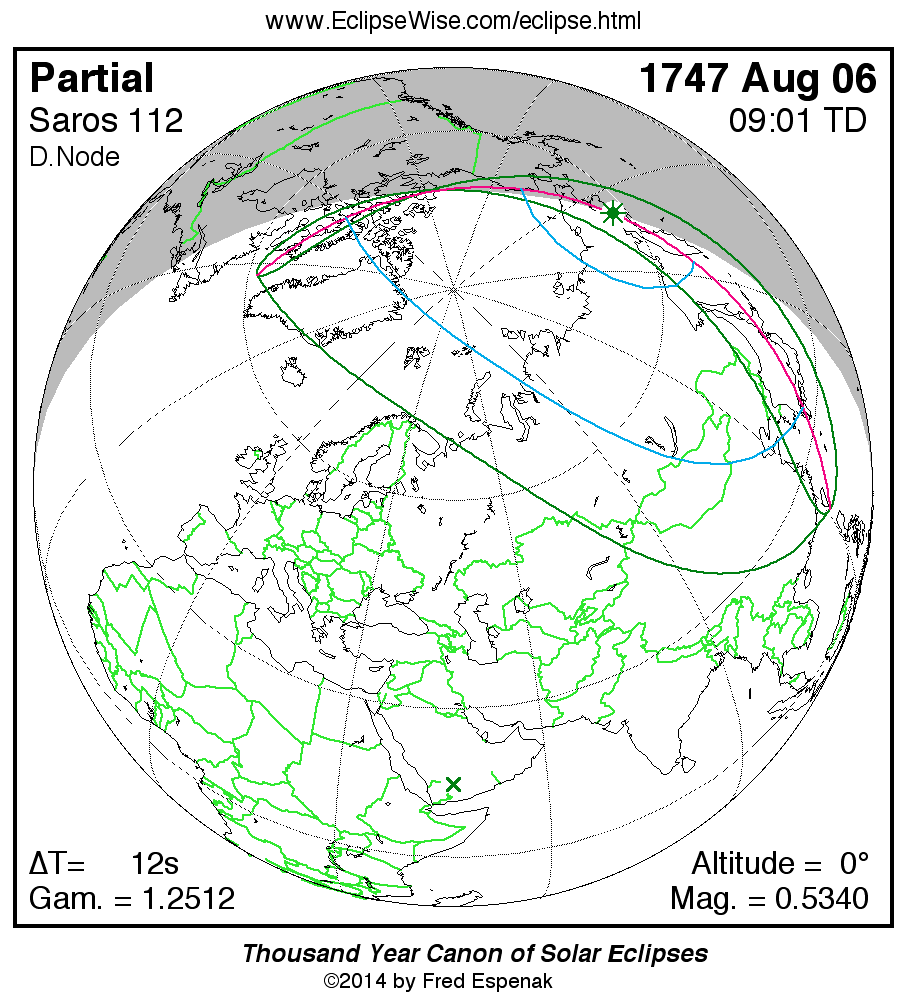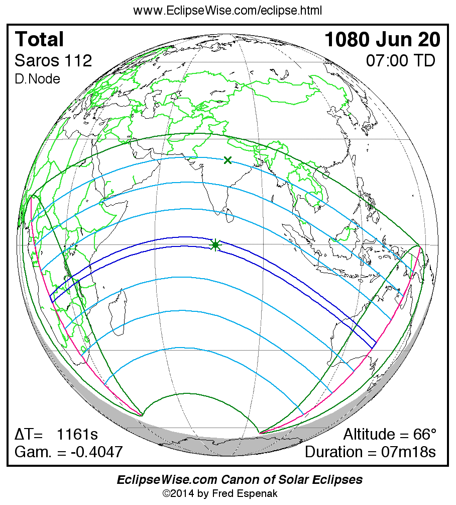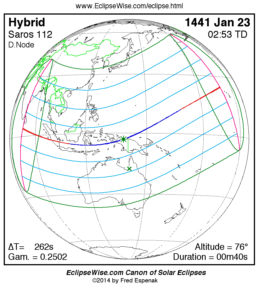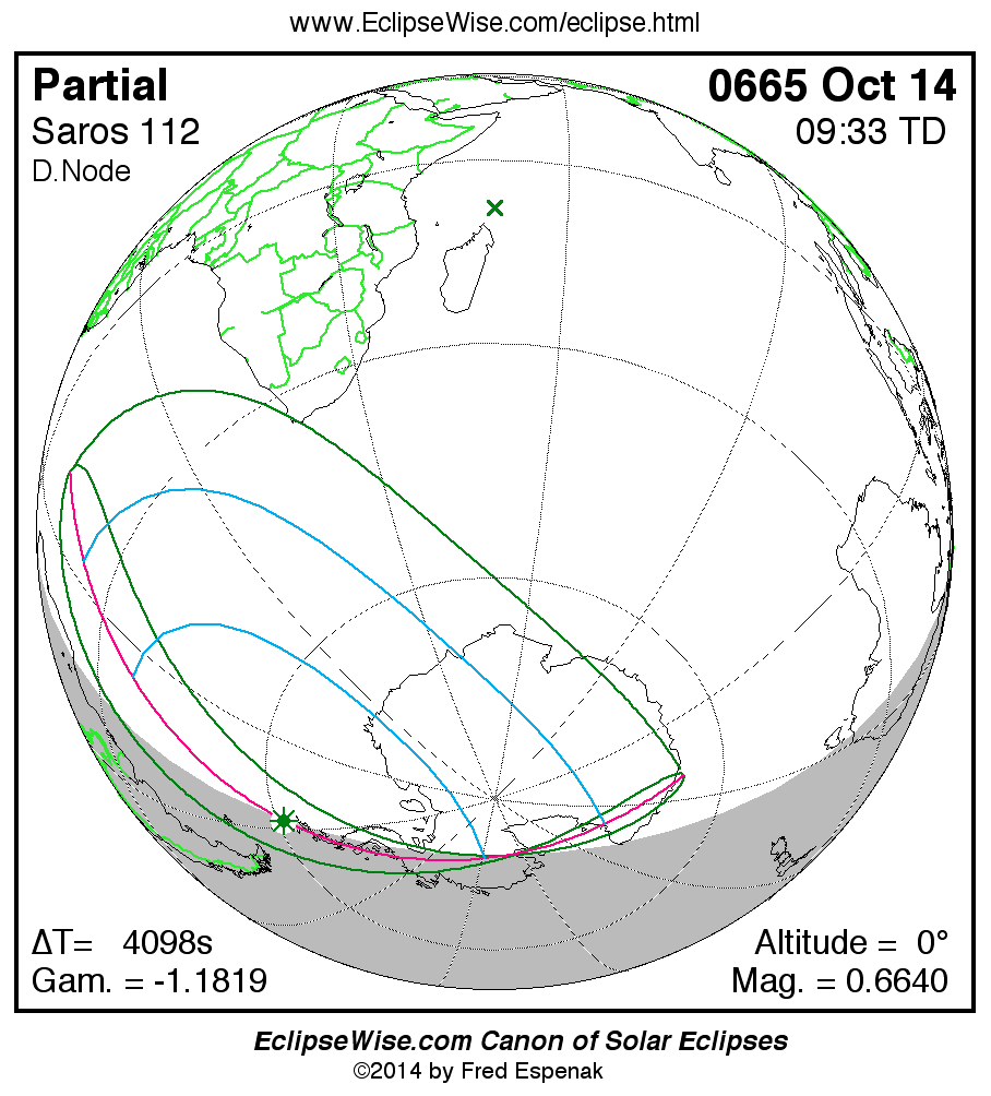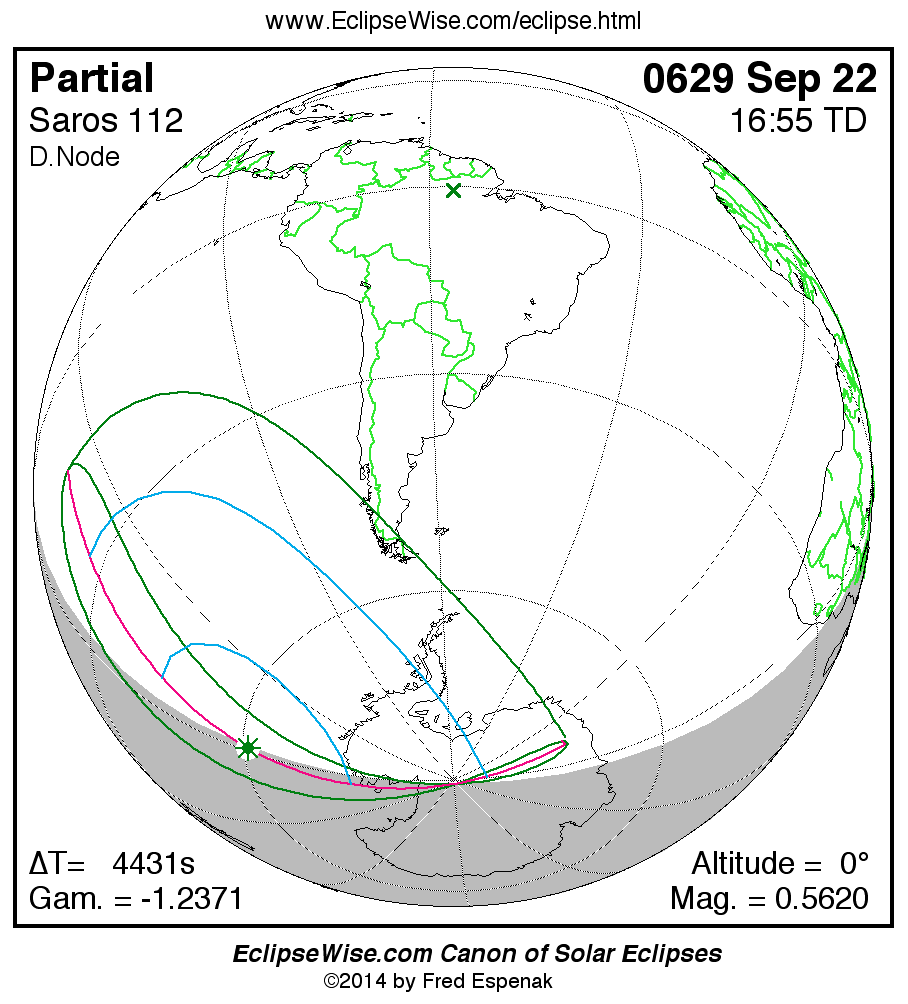 A panorama of all solar eclipses belonging to Saros 112 is presented here. Each map depicts the geographic region of visibility for a single eclipse. For central eclipses, the total or annular path is plotted in either blue (total) or red (annular). The date and time is given for the instant of Greatest Eclipse. Every map serves as a hyperlink to the EclipseWise Prime page for that eclipse where a larger map and complete details for the eclipse can be found. Visit the Key to Solar Eclipse Maps for a detailed explanation of these maps. Near the bottom of the page are a series of hyperlinks for more on solar eclipses.