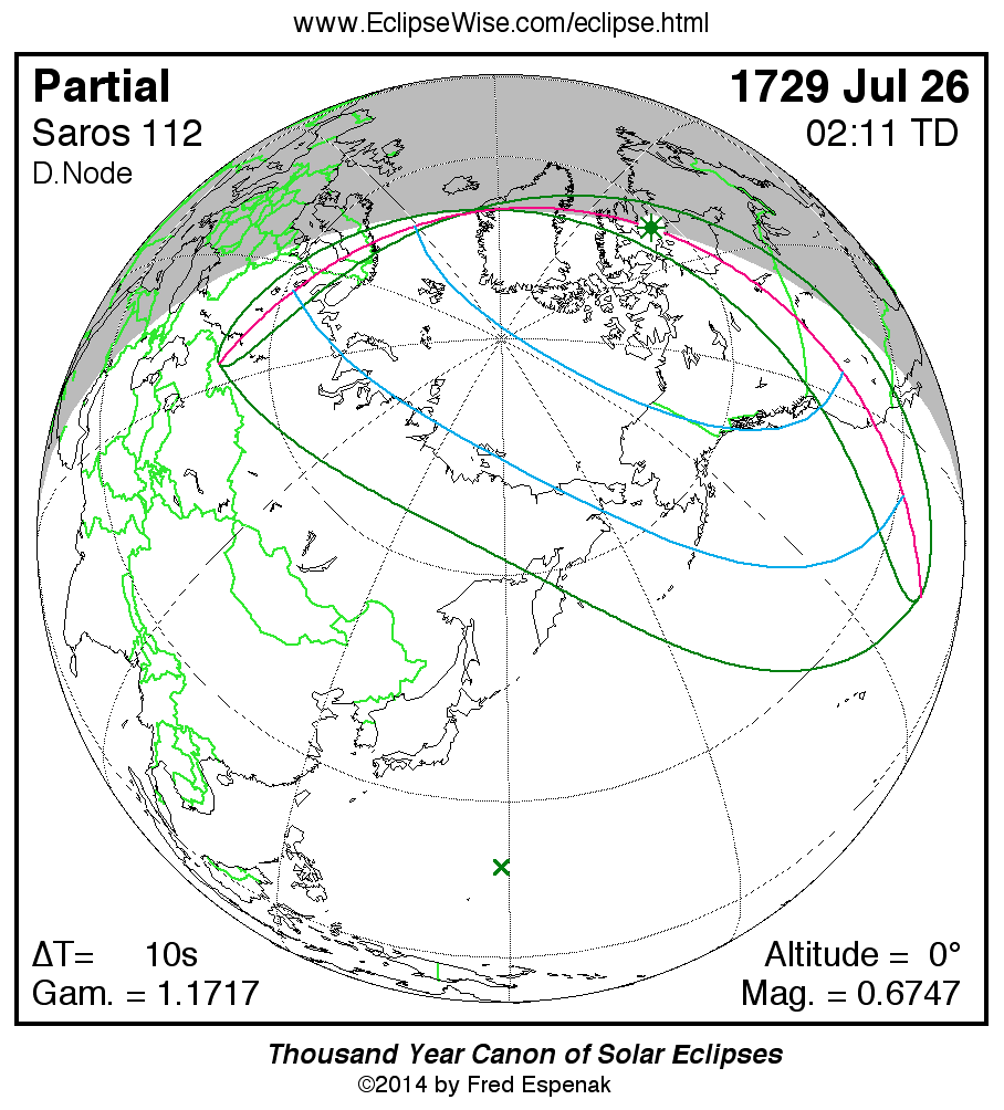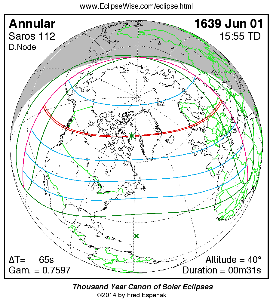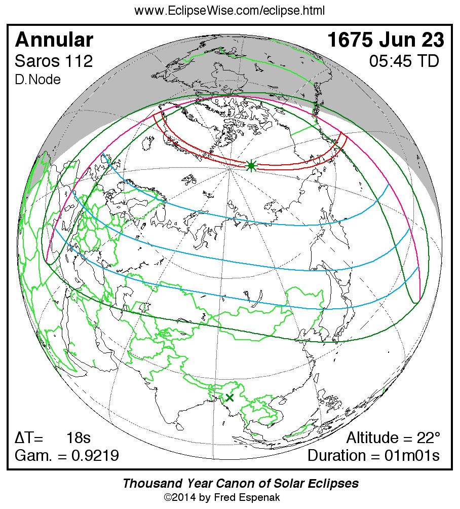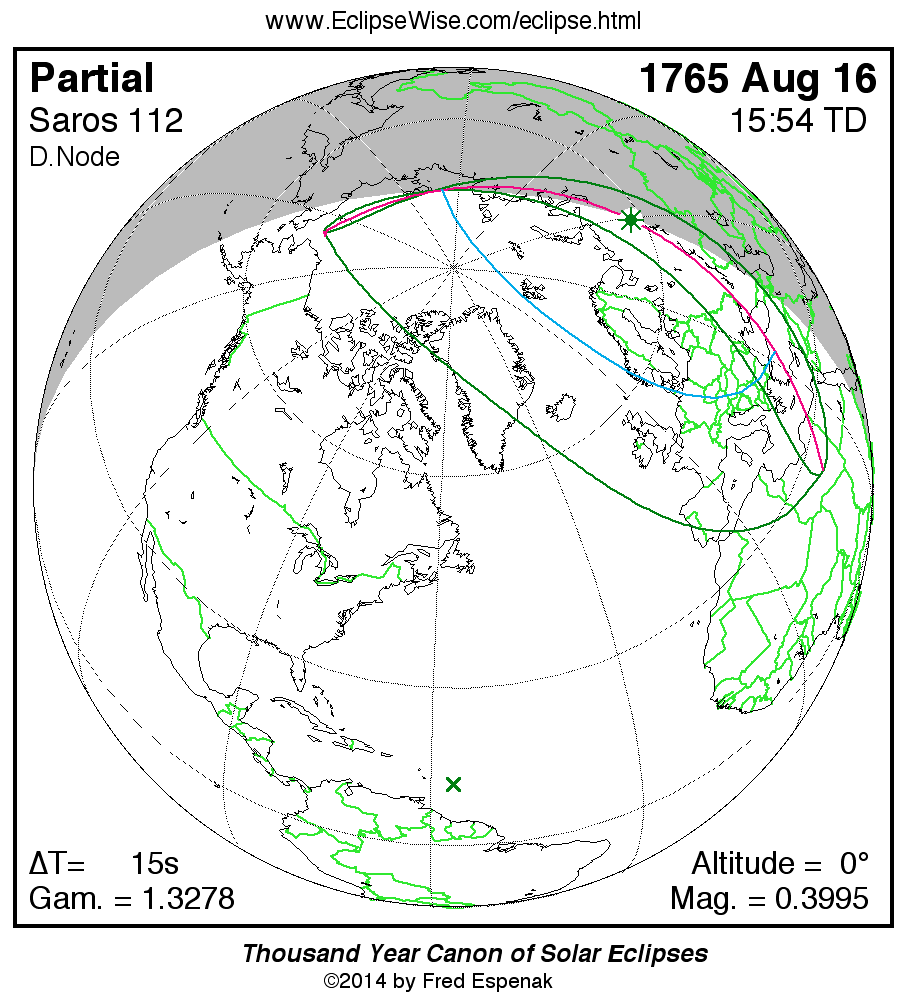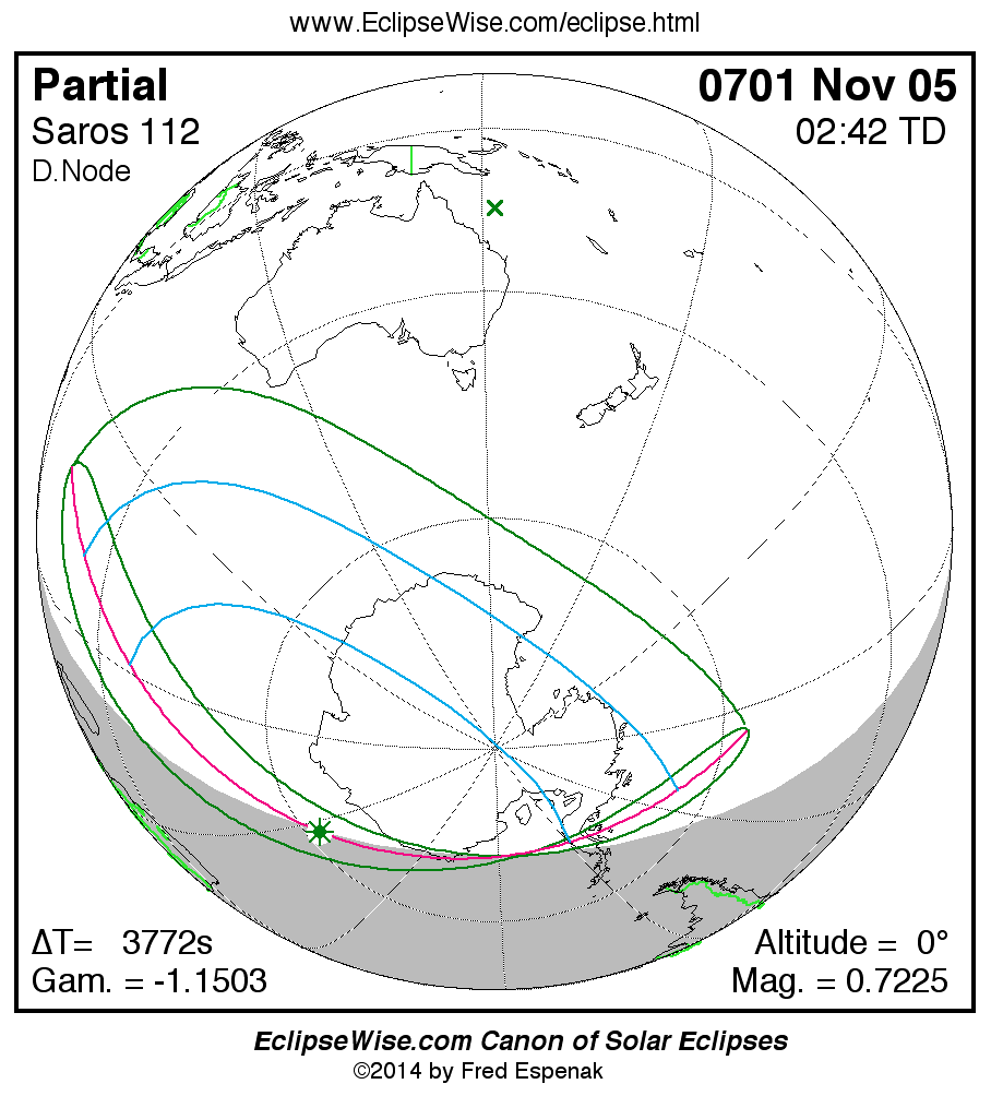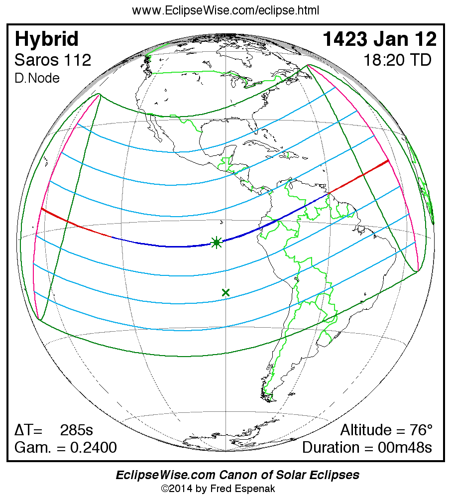 A panorama of all solar eclipses belonging to Saros 112 is presented here. Each map depicts the geographic region of visibility for a single eclipse. For central eclipses, the total or annular path is plotted in either blue (total) or red (annular). The date and time is given for the instant of Greatest Eclipse. Every map serves as a hyperlink to the EclipseWise Prime page for that eclipse where a larger map and complete details for the eclipse can be found. Visit the Key to Solar Eclipse Maps for a detailed explanation of these maps. Near the bottom of the page are a series of hyperlinks for more on solar eclipses.