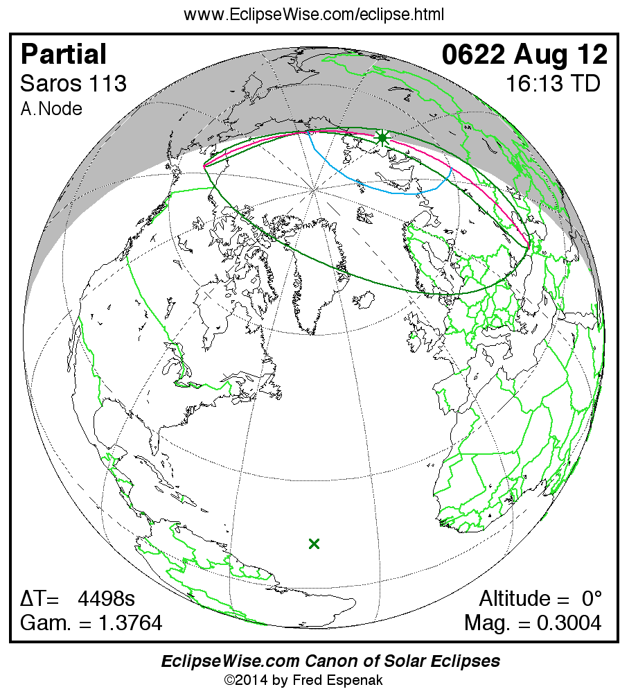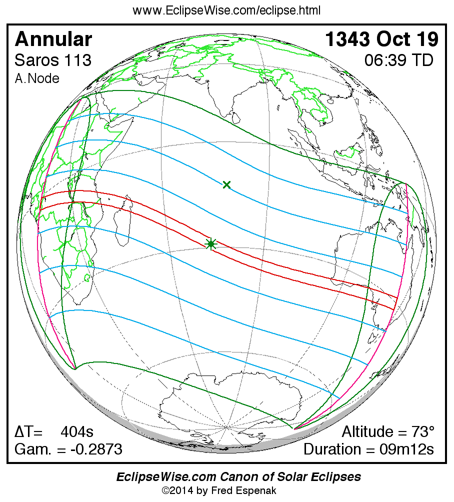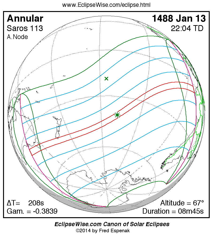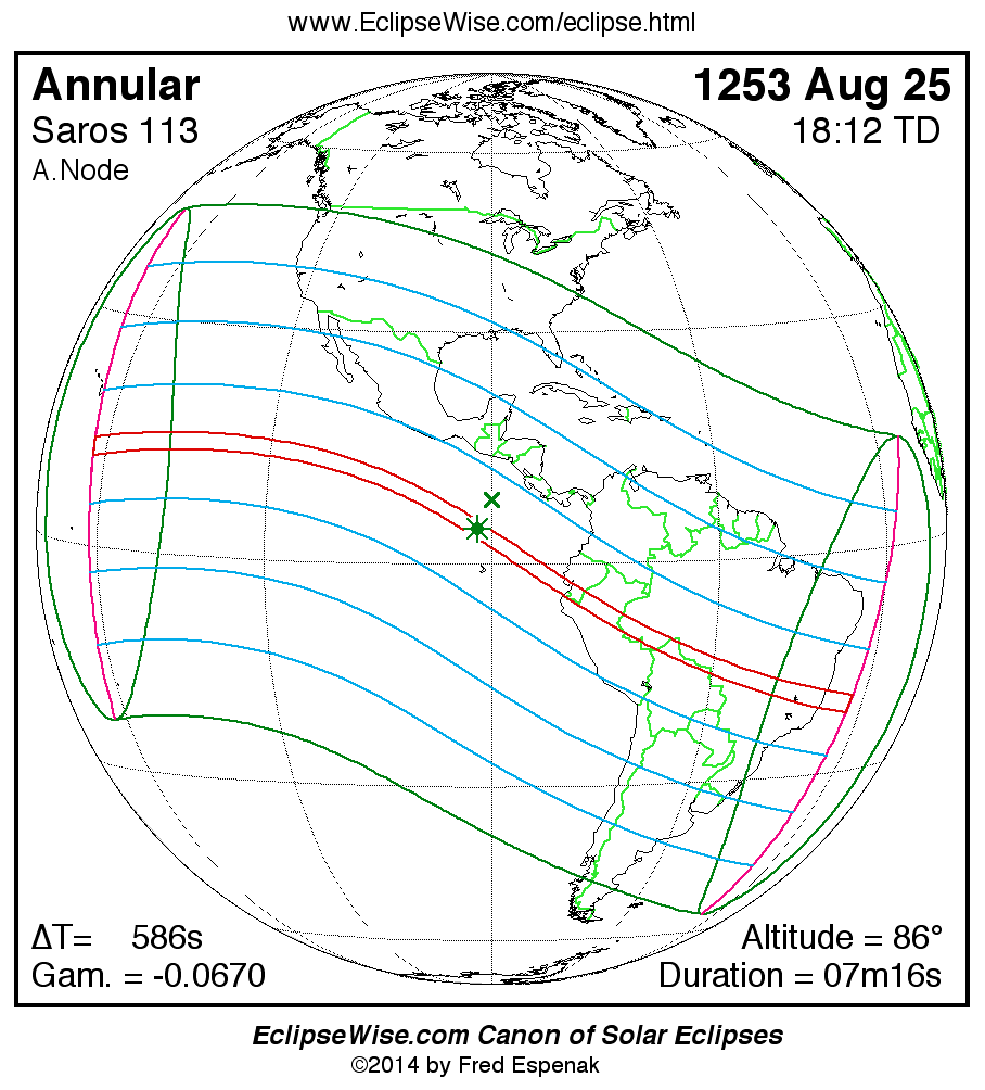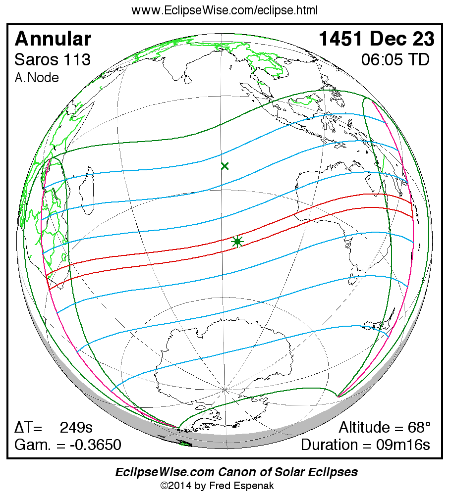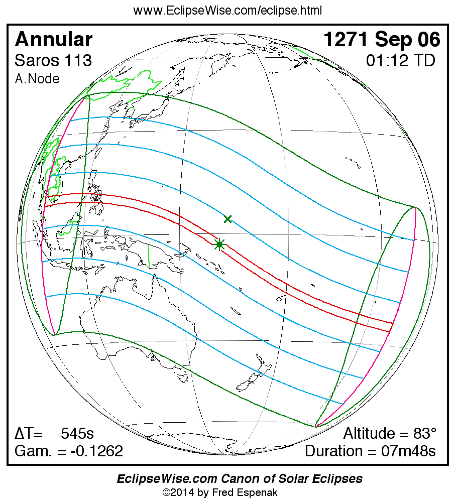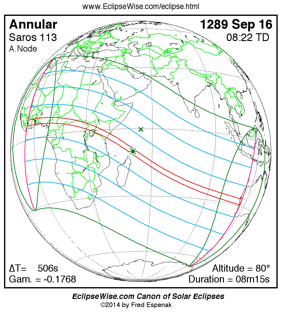 A panorama of all solar eclipses belonging to Saros 113 is presented here. Each map depicts the geographic region of visibility for a single eclipse. For central eclipses, the total or annular path is plotted in either blue (total) or red (annular). The date and time is given for the instant of Greatest Eclipse. Every map serves as a hyperlink to the EclipseWise Prime page for that eclipse where a larger map and complete details for the eclipse can be found. Visit the Key to Solar Eclipse Maps for a detailed explanation of these maps. Near the bottom of the page are a series of hyperlinks for more on solar eclipses.