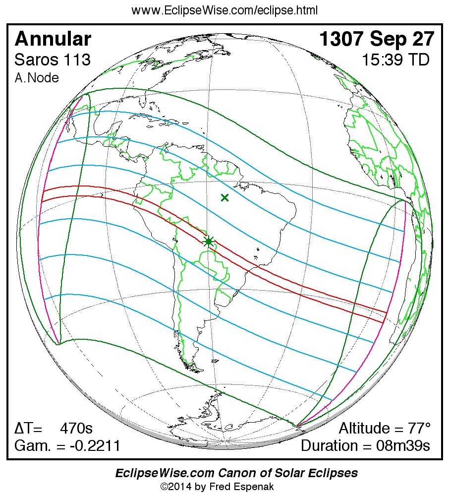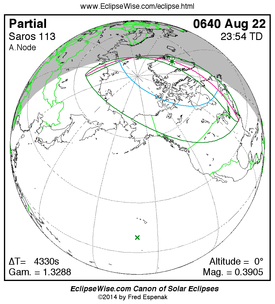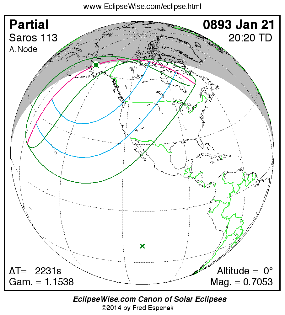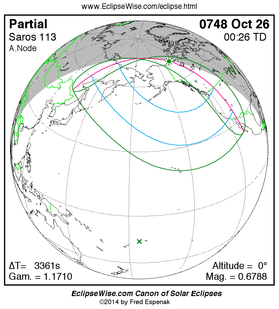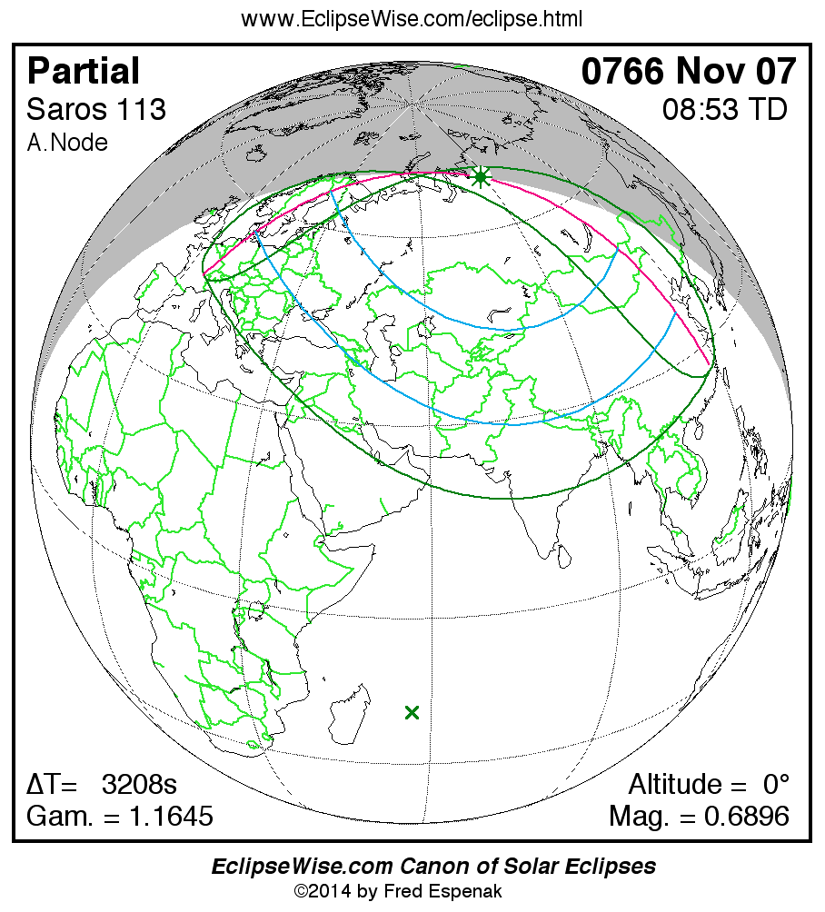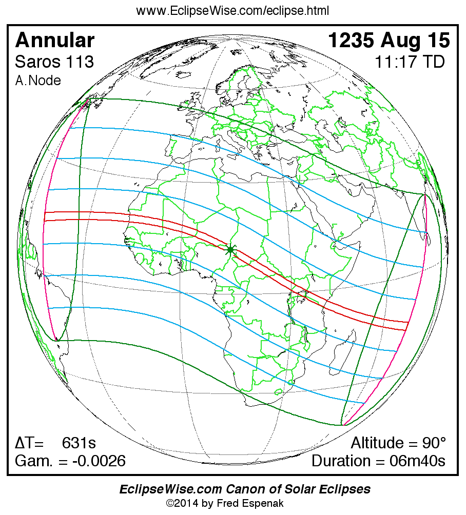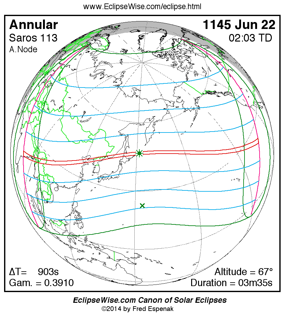 A panorama of all solar eclipses belonging to Saros 113 is presented here. Each map depicts the geographic region of visibility for a single eclipse. For central eclipses, the total or annular path is plotted in either blue (total) or red (annular). The date and time is given for the instant of Greatest Eclipse. Every map serves as a hyperlink to the EclipseWise Prime page for that eclipse where a larger map and complete details for the eclipse can be found. Visit the Key to Solar Eclipse Maps for a detailed explanation of these maps. Near the bottom of the page are a series of hyperlinks for more on solar eclipses.