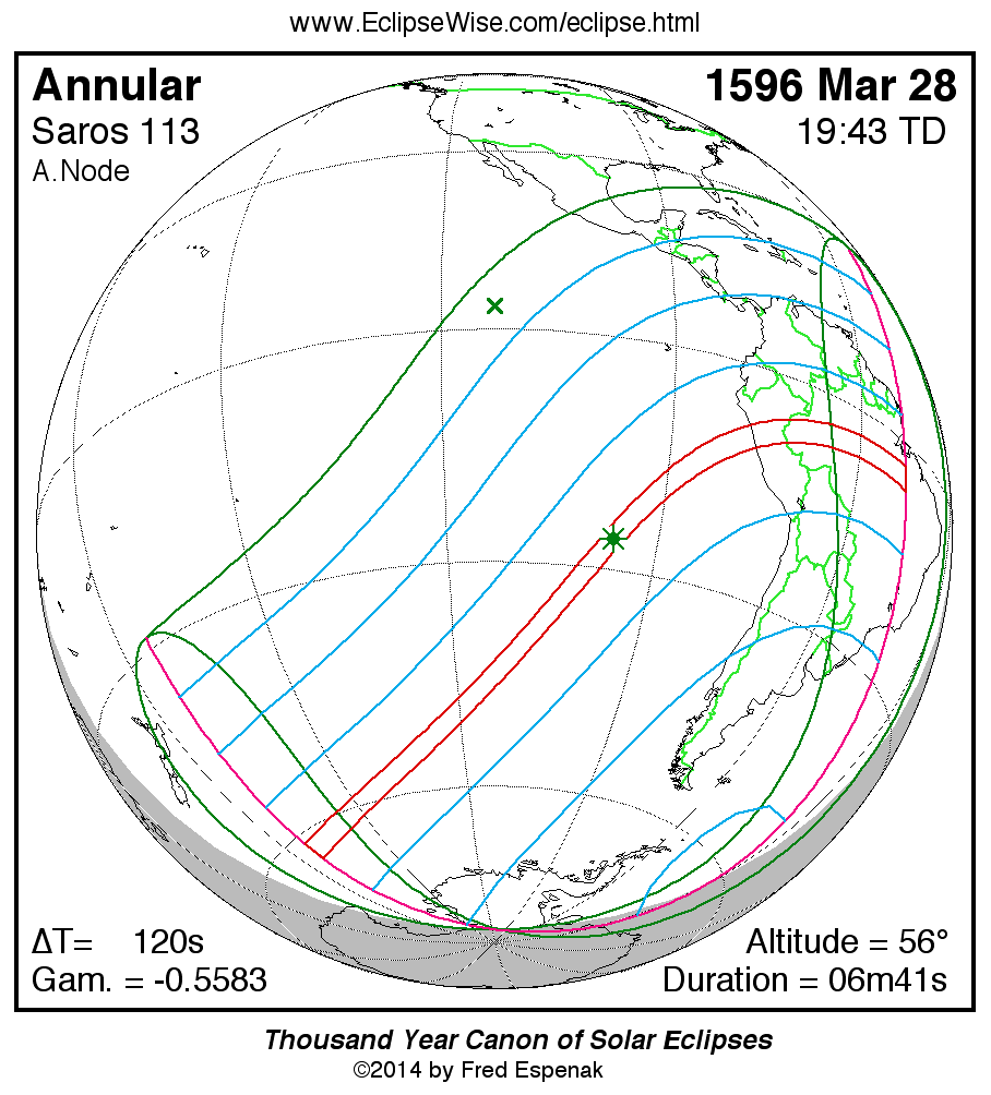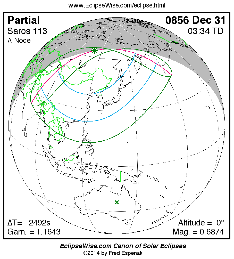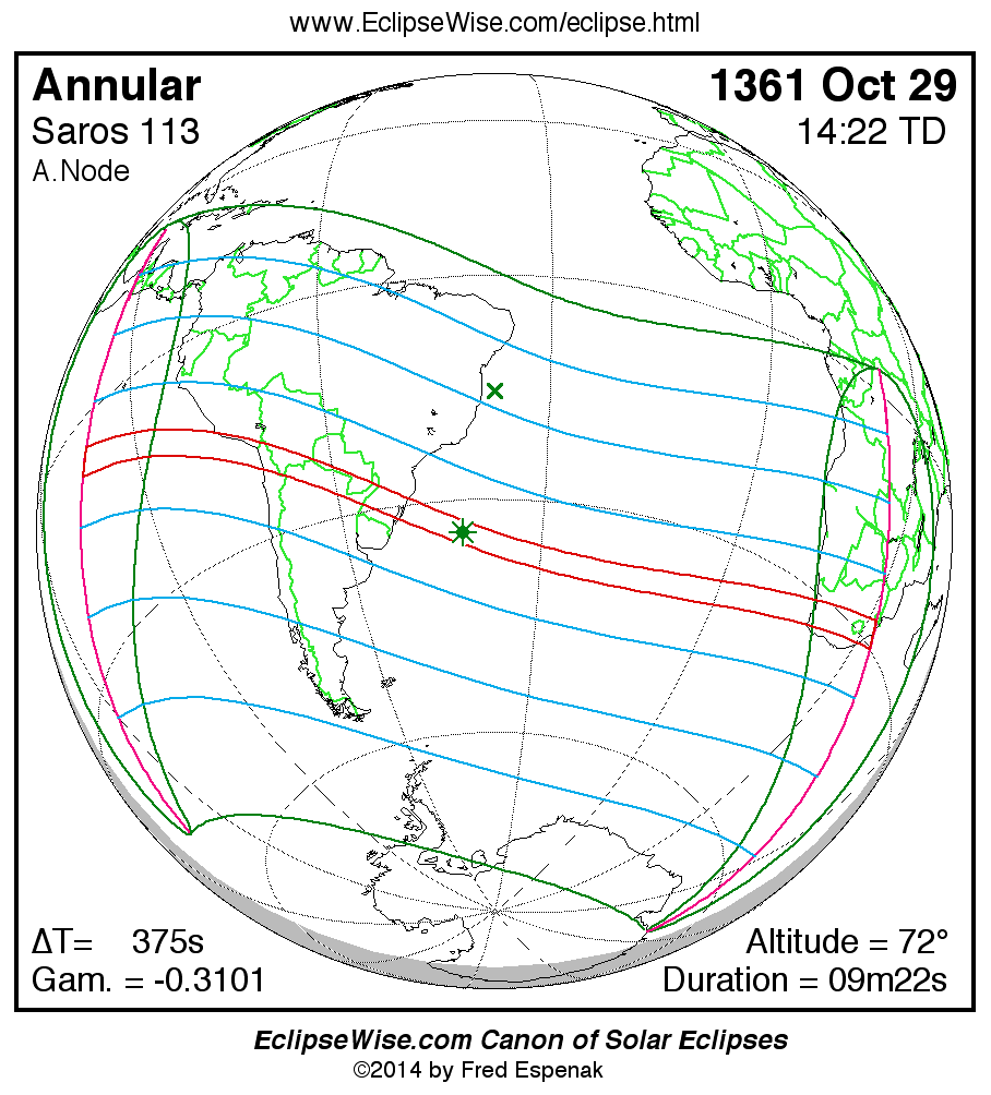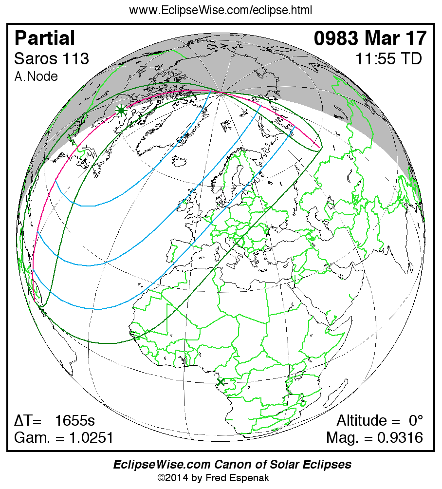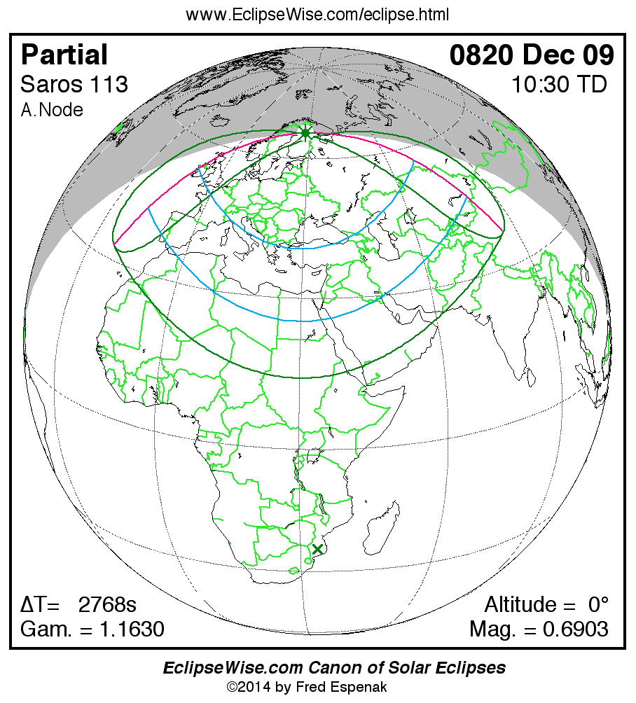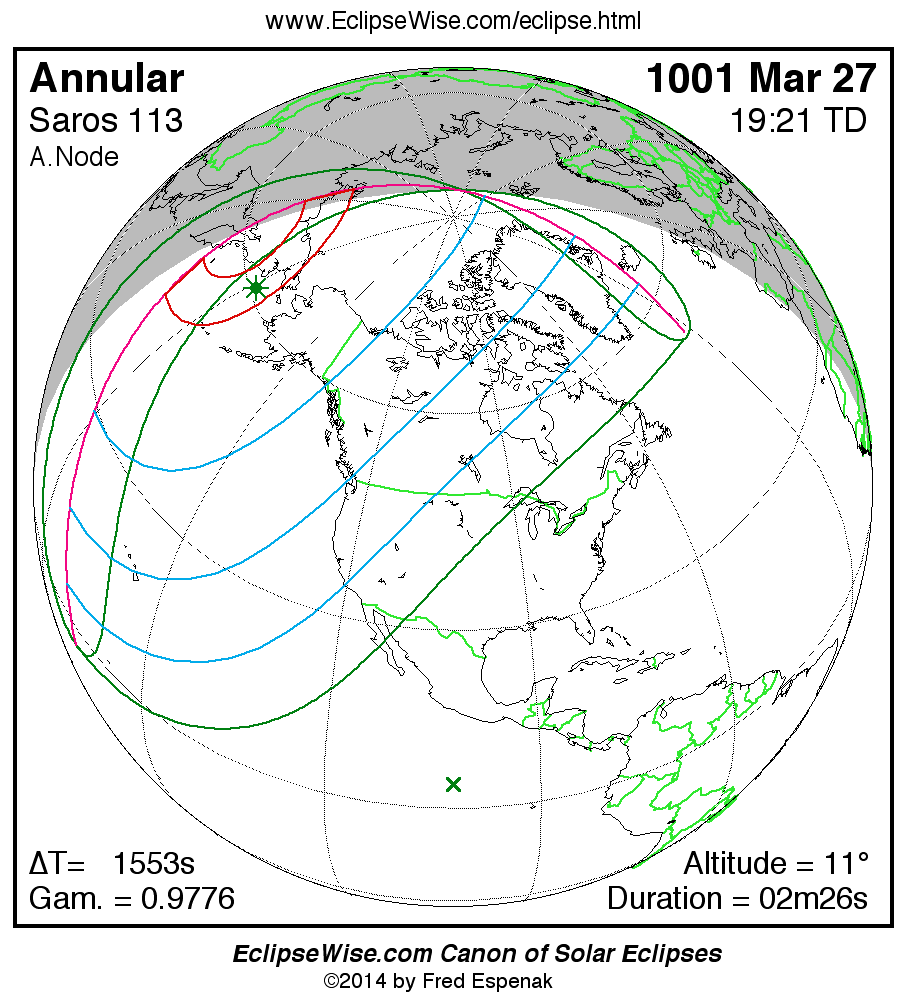 A panorama of all solar eclipses belonging to Saros 113 is presented here. Each map depicts the geographic region of visibility for a single eclipse. For central eclipses, the total or annular path is plotted in either blue (total) or red (annular). The date and time is given for the instant of Greatest Eclipse. Every map serves as a hyperlink to the EclipseWise Prime page for that eclipse where a larger map and complete details for the eclipse can be found. Visit the Key to Solar Eclipse Maps for a detailed explanation of these maps. Near the bottom of the page are a series of hyperlinks for more on solar eclipses.