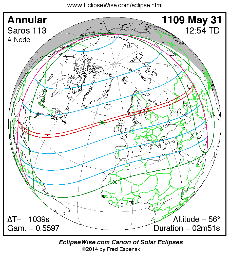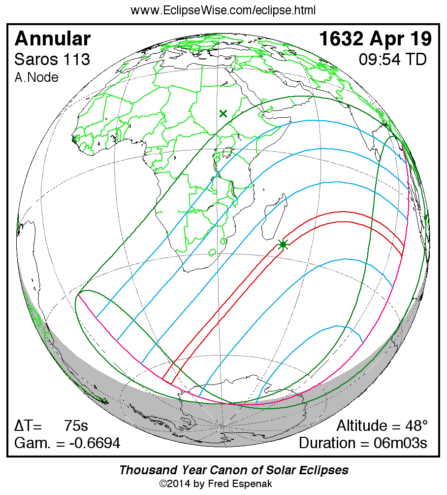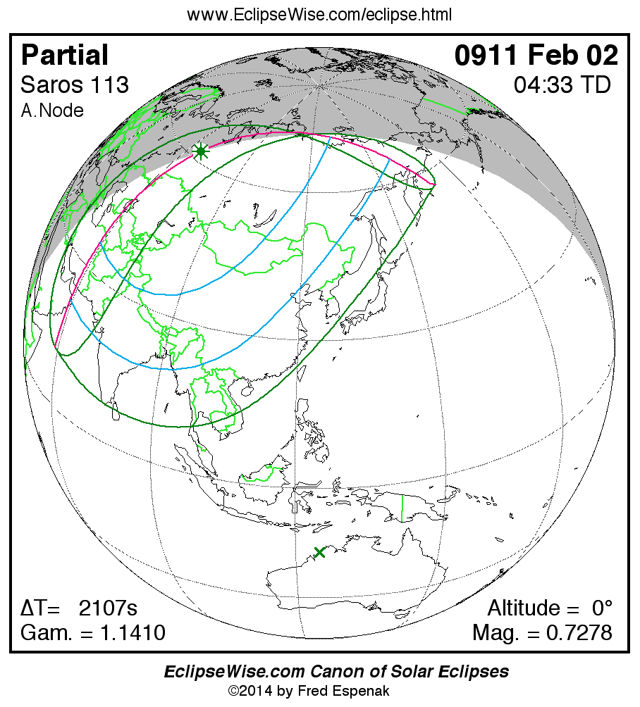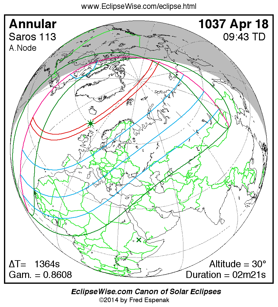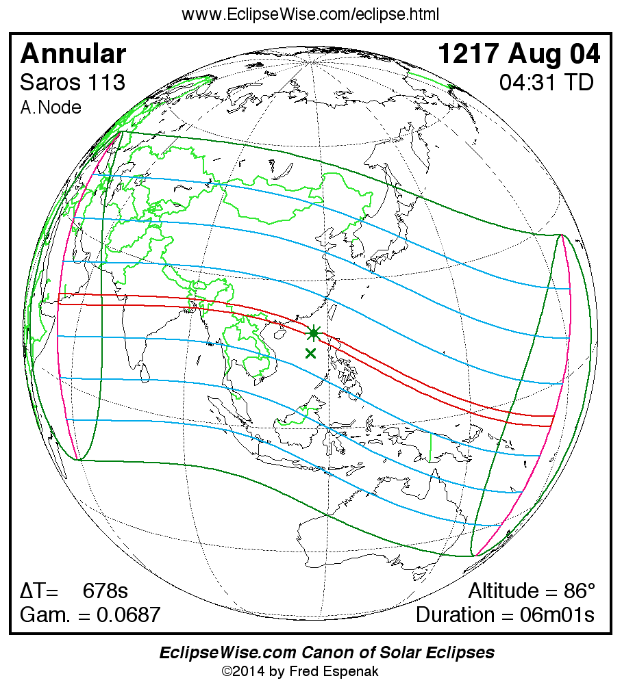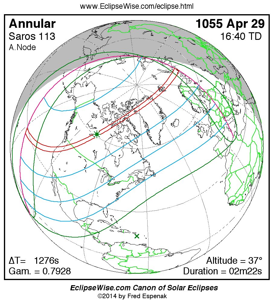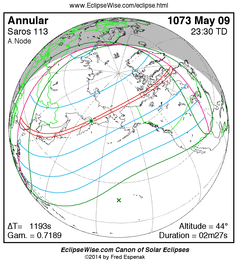 A panorama of all solar eclipses belonging to Saros 113 is presented here. Each map depicts the geographic region of visibility for a single eclipse. For central eclipses, the total or annular path is plotted in either blue (total) or red (annular). The date and time is given for the instant of Greatest Eclipse. Every map serves as a hyperlink to the EclipseWise Prime page for that eclipse where a larger map and complete details for the eclipse can be found. Visit the Key to Solar Eclipse Maps for a detailed explanation of these maps. Near the bottom of the page are a series of hyperlinks for more on solar eclipses.