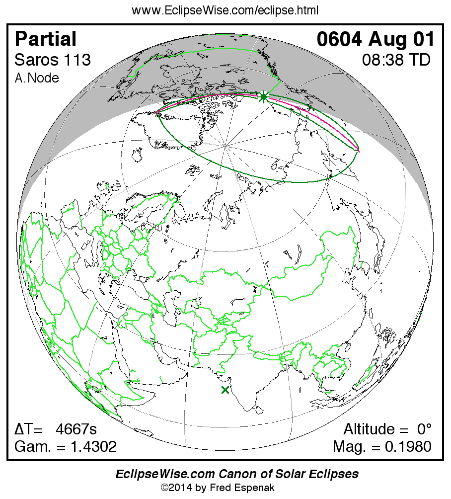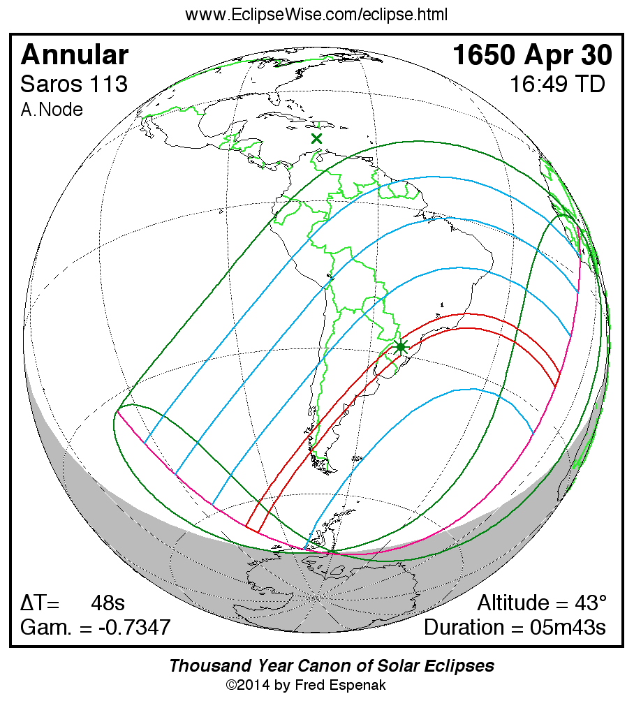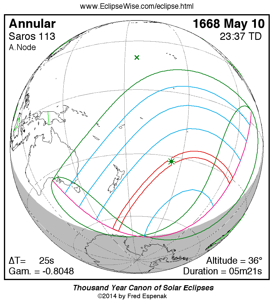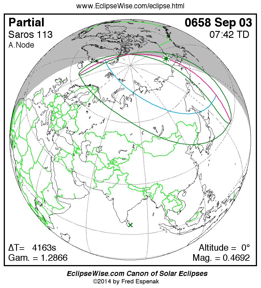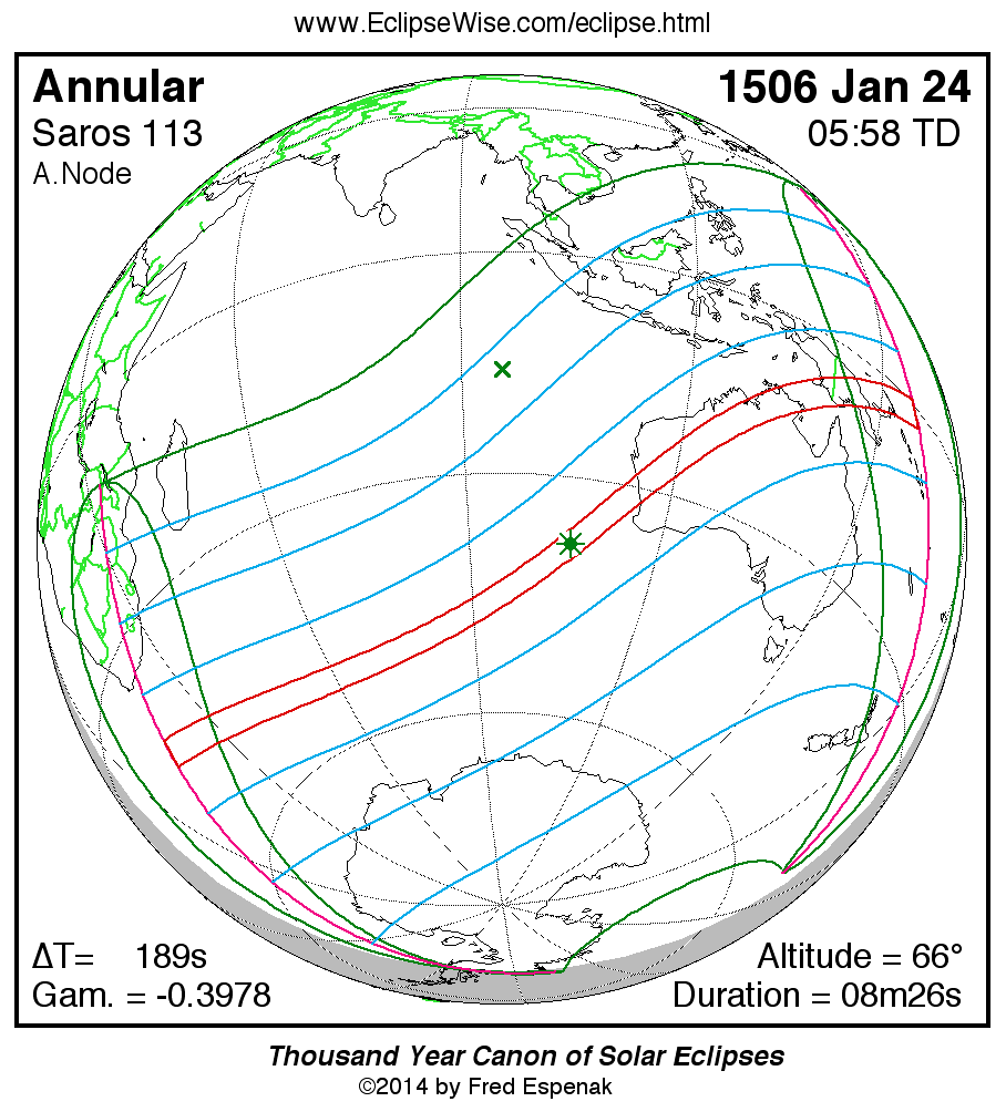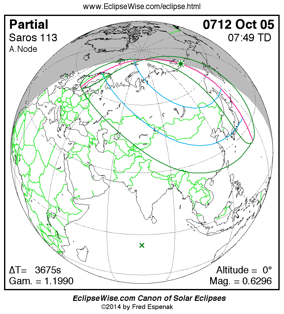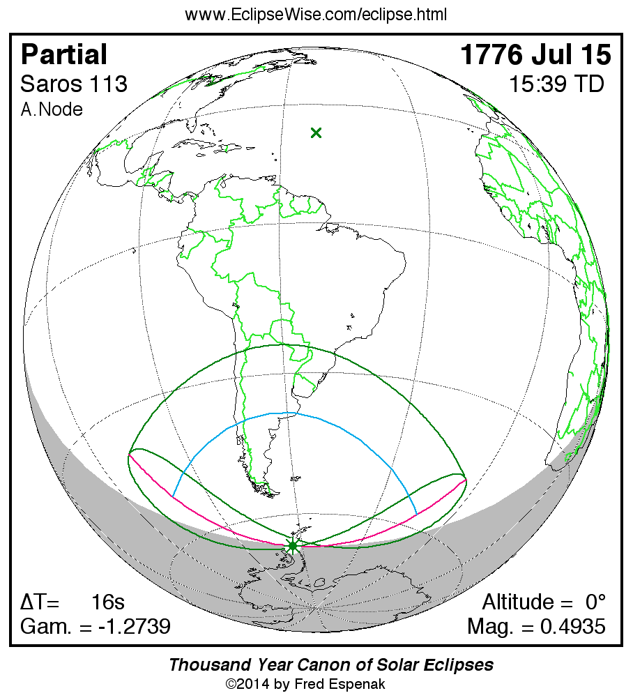 A panorama of all solar eclipses belonging to Saros 113 is presented here. Each map depicts the geographic region of visibility for a single eclipse. For central eclipses, the total or annular path is plotted in either blue (total) or red (annular). The date and time is given for the instant of Greatest Eclipse. Every map serves as a hyperlink to the EclipseWise Prime page for that eclipse where a larger map and complete details for the eclipse can be found. Visit the Key to Solar Eclipse Maps for a detailed explanation of these maps. Near the bottom of the page are a series of hyperlinks for more on solar eclipses.