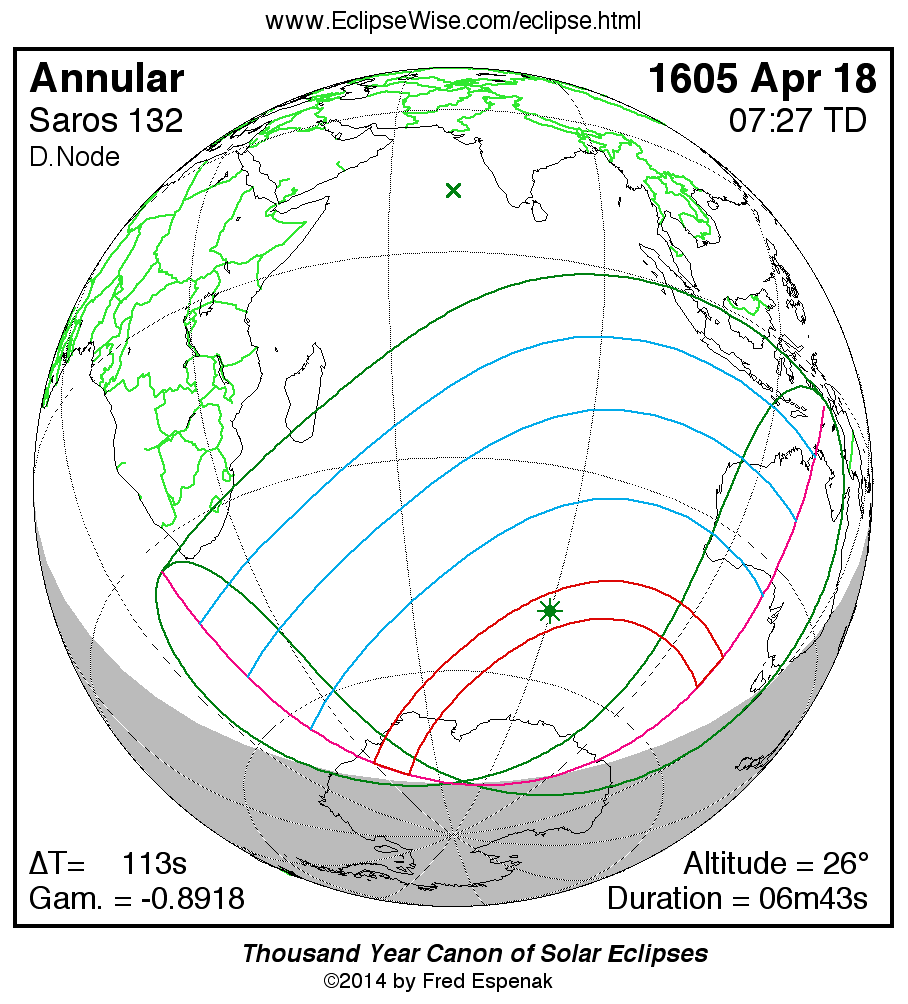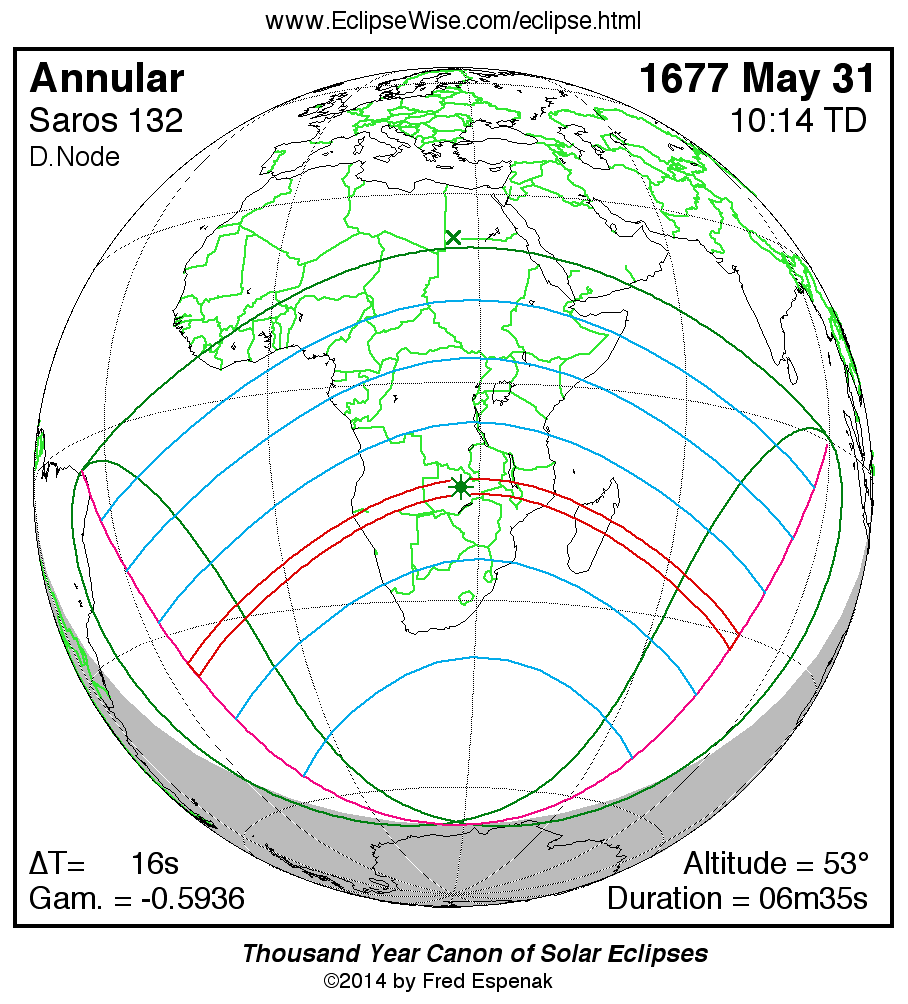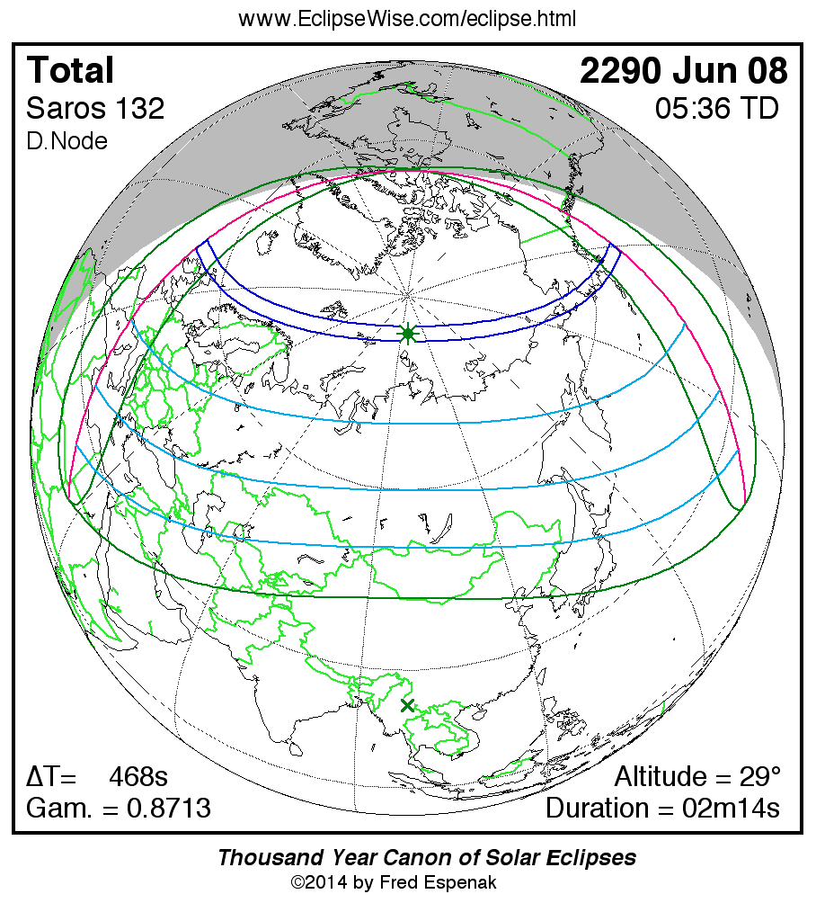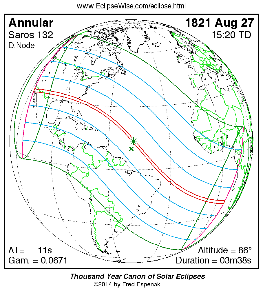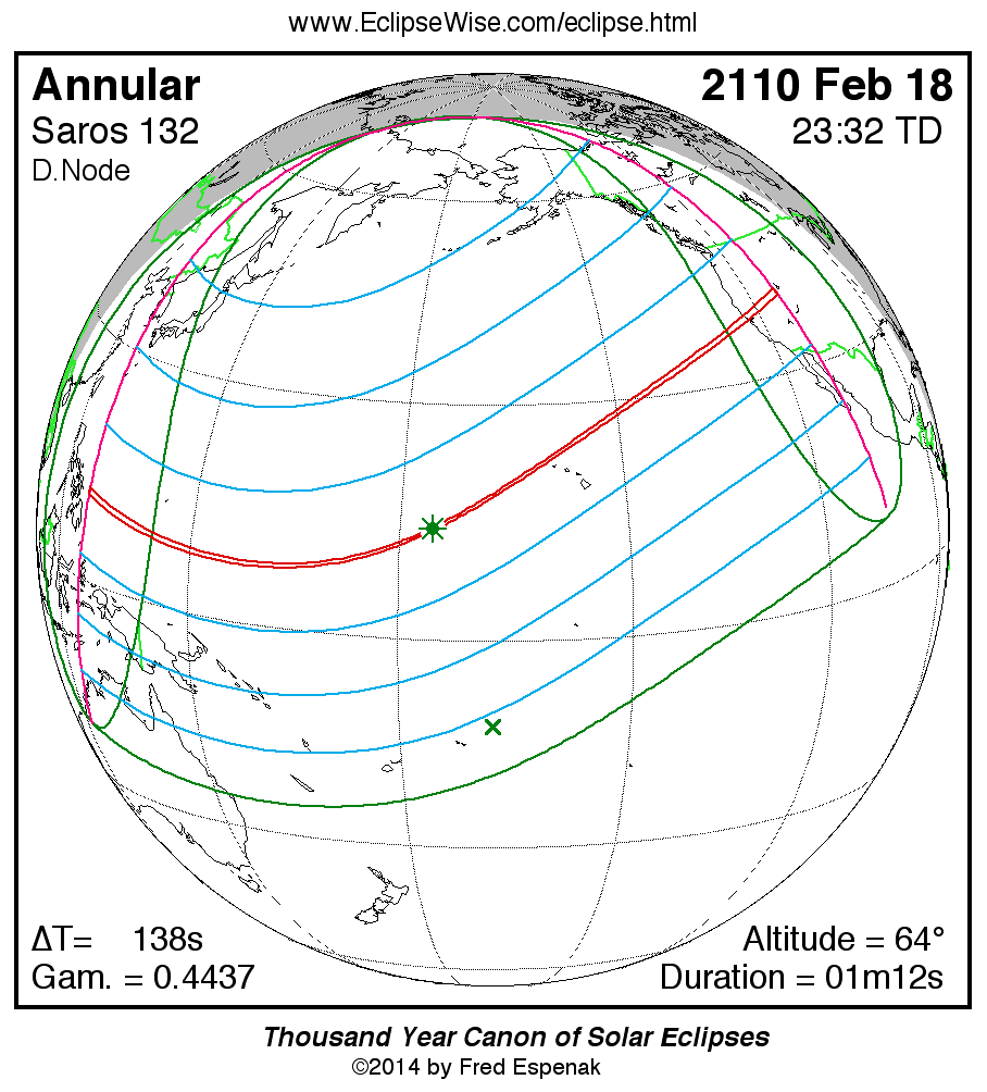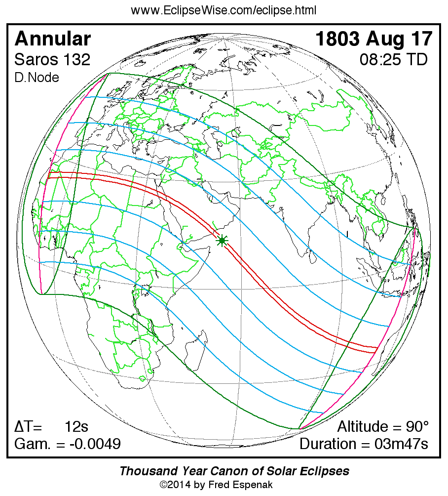 A panorama of all solar eclipses belonging to Saros 132 is presented here. Each map depicts the geographic region of visibility for a single eclipse. For central eclipses, the total or annular path is plotted in either blue (total) or red (annular). The date and time is given for the instant of Greatest Eclipse. Every map serves as a hyperlink to the EclipseWise Prime page for that eclipse where a larger map and complete details for the eclipse can be found. Visit the Key to Solar Eclipse Maps for a detailed explanation of these maps. Near the bottom of the page are a series of hyperlinks for more on solar eclipses.