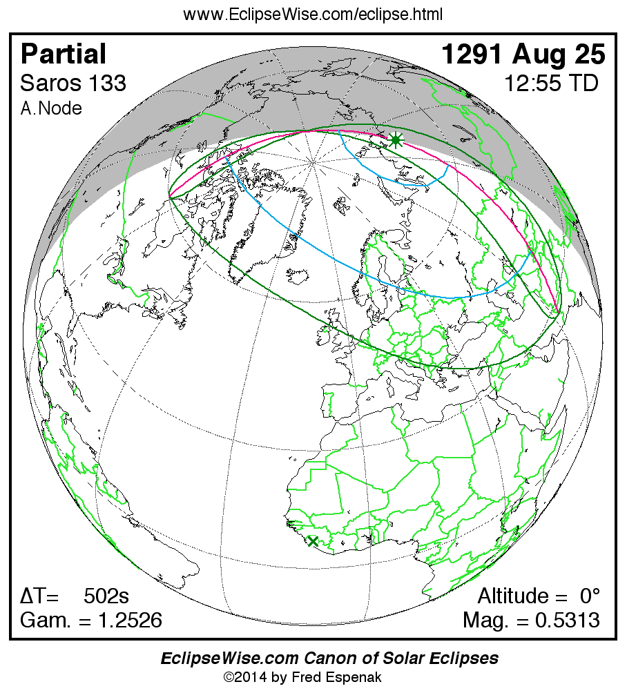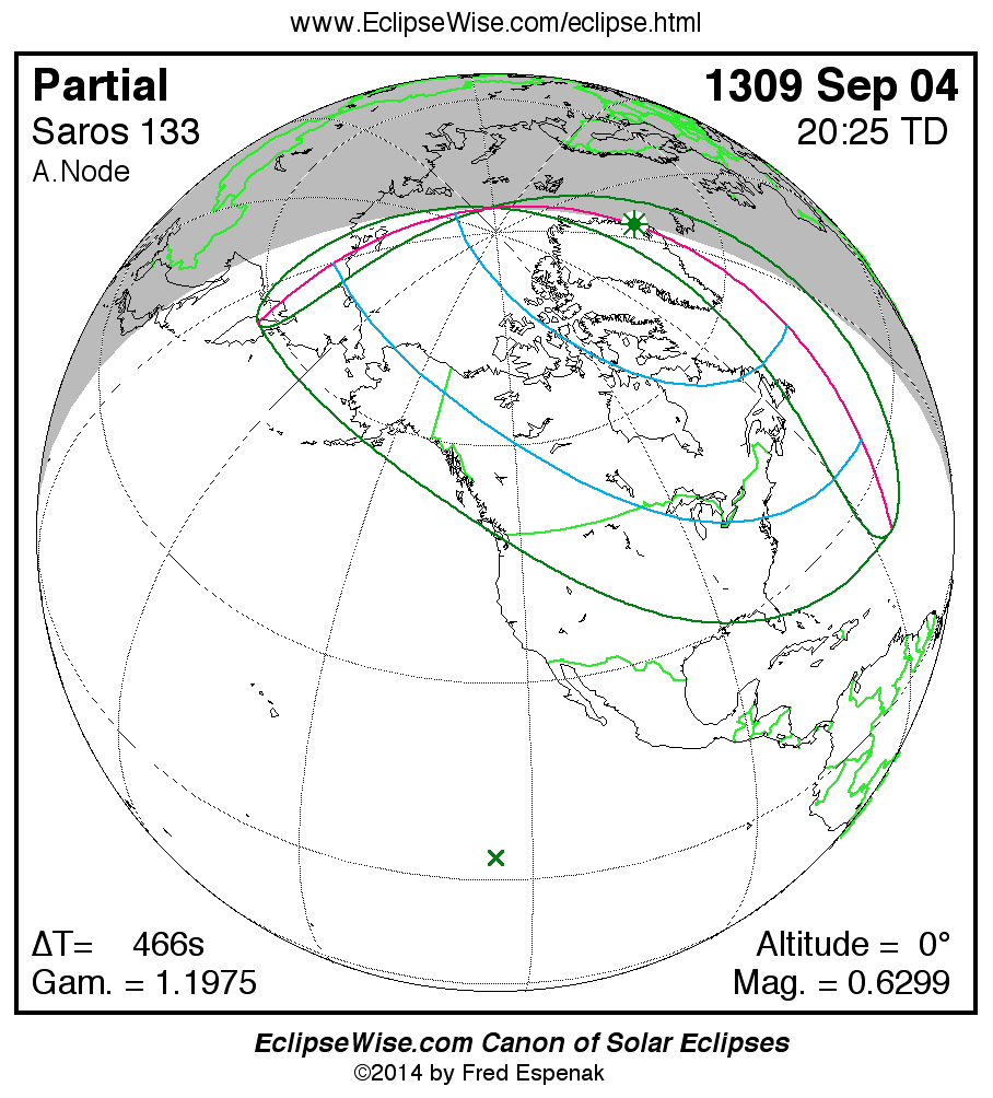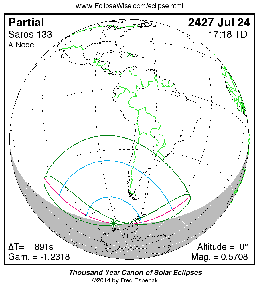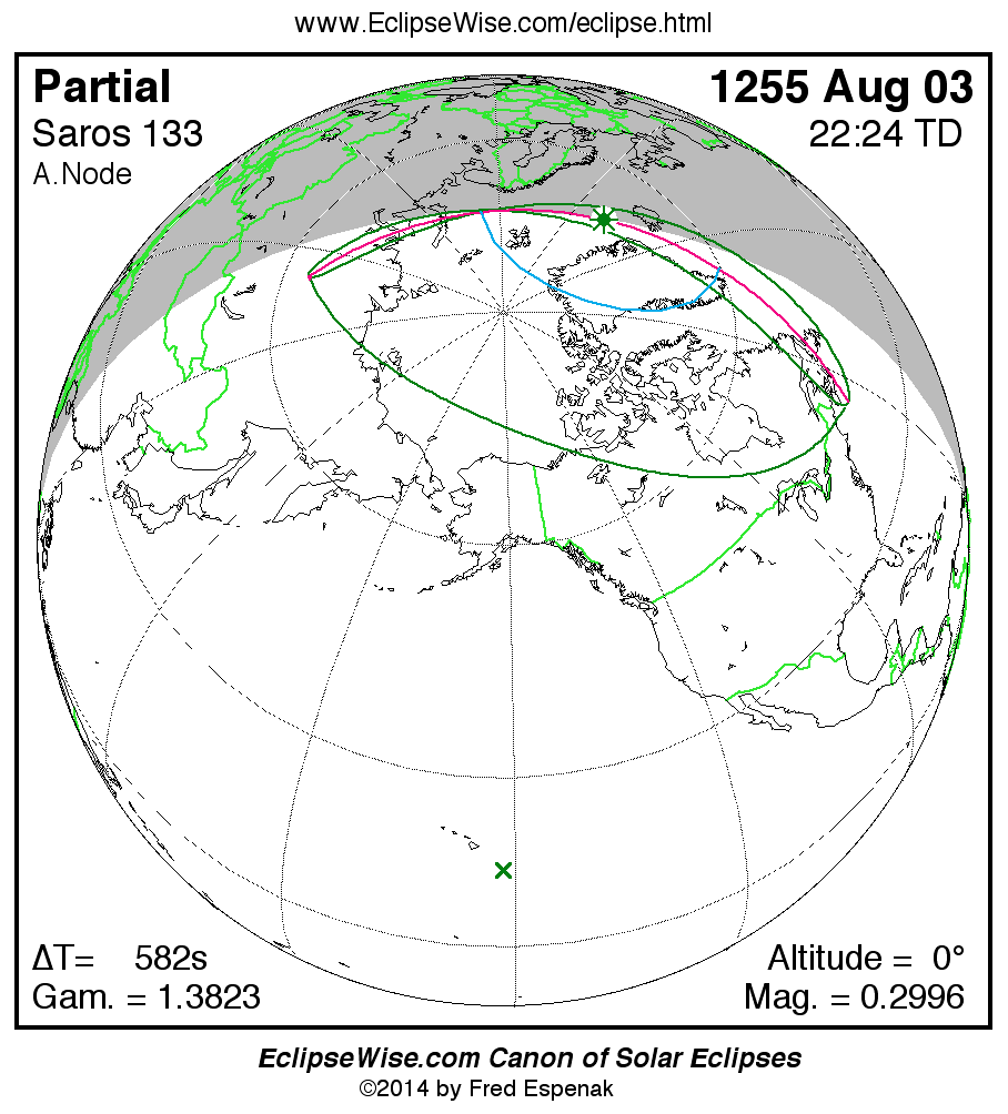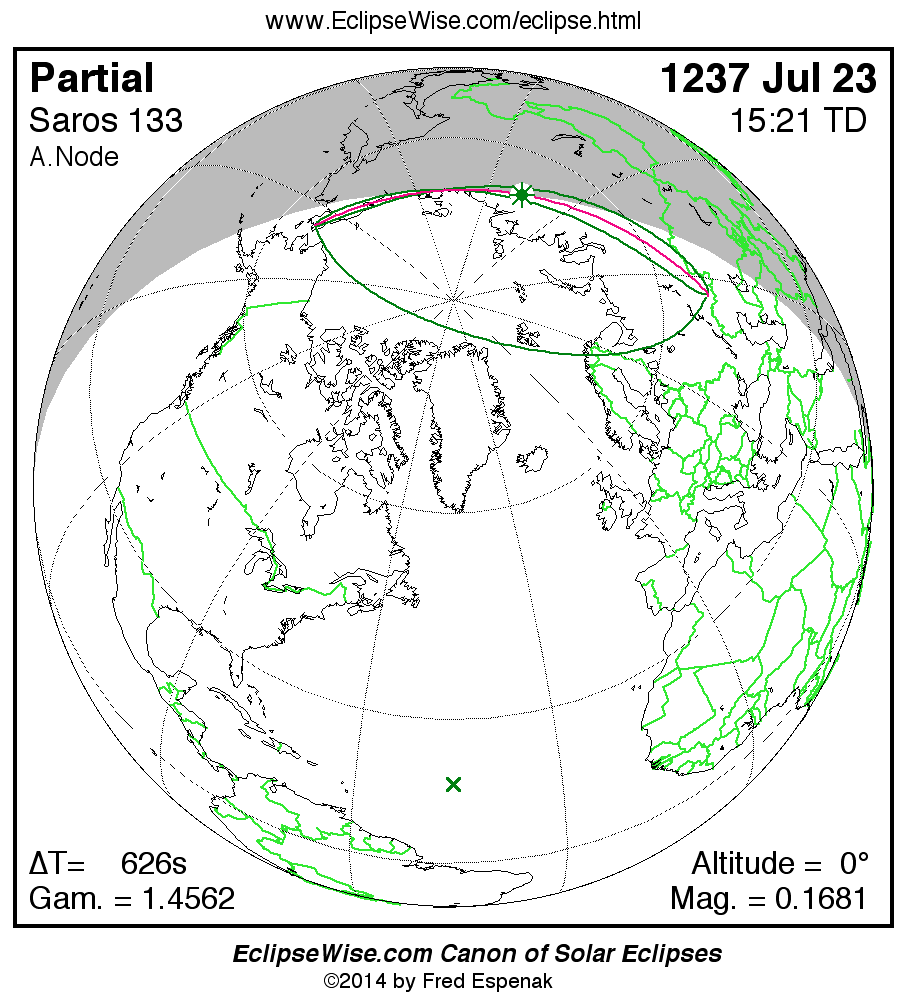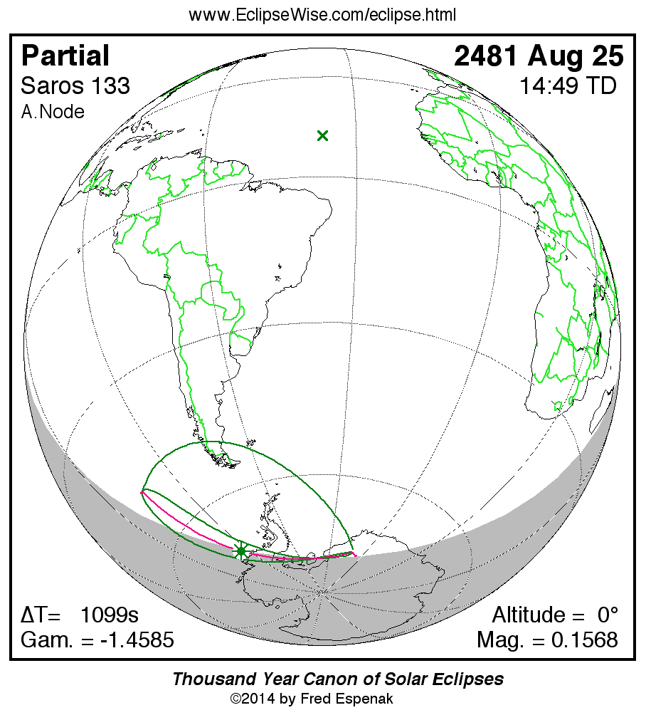 Solar eclipses of Saros 133 all occur at the Moon’s ascending node and the Moon moves southward with each eclipse. The series began with a partial eclipse in the northern hemisphere on 1219 Jul 13. The series will end with a partial eclipse in the southern hemisphere on 2499 Sep 05. The total duration of Saros series 133 is 1280.14 years.