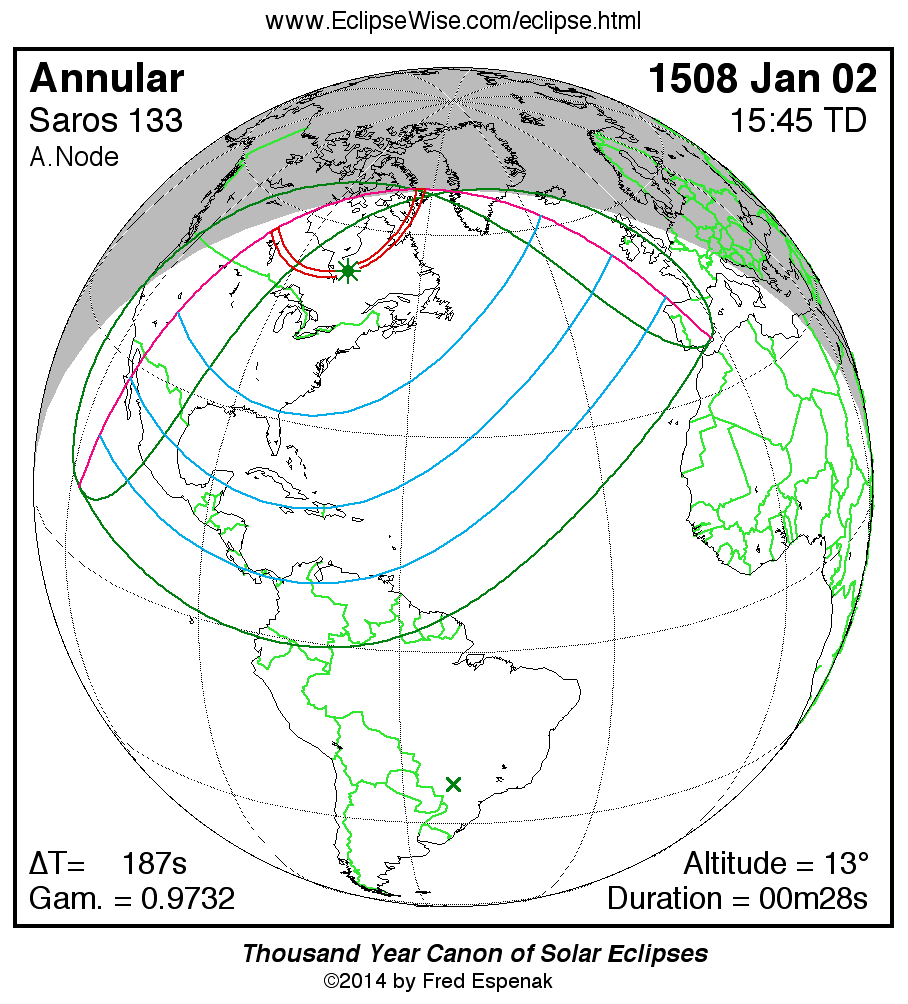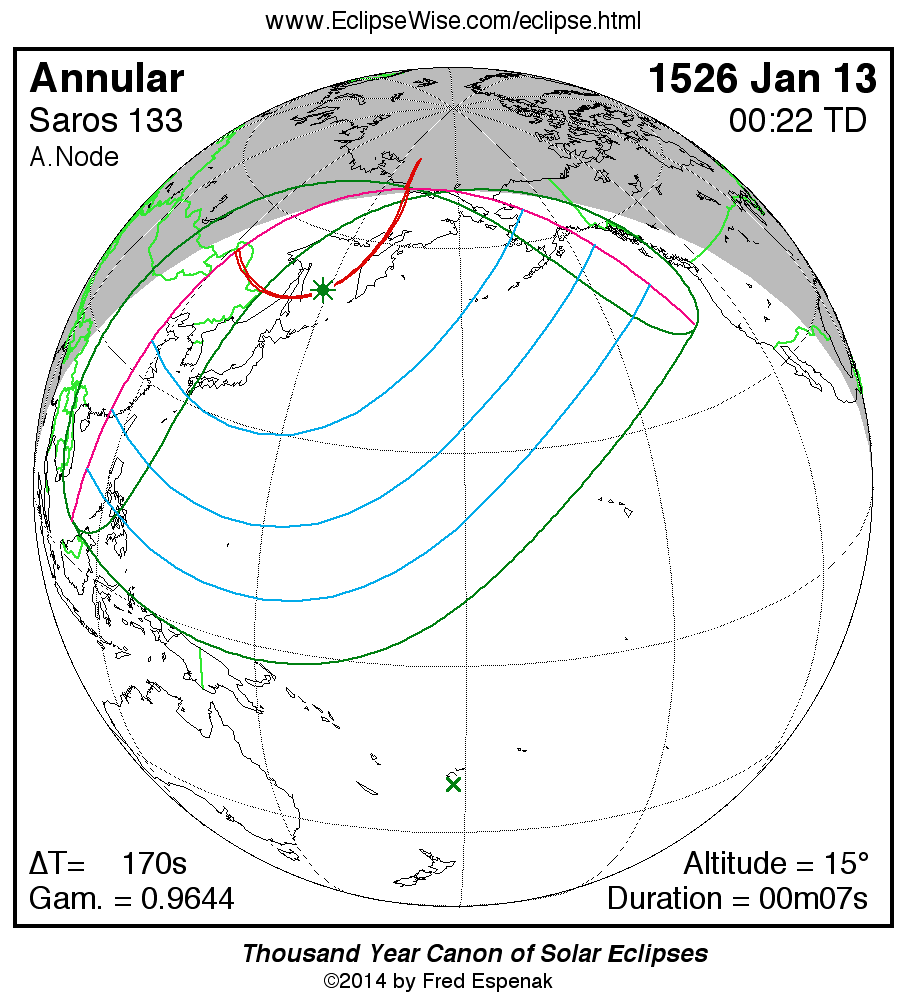 Shortest Annular Solar Eclipse 1526 Jan 1300m07s -