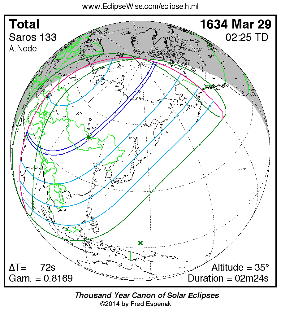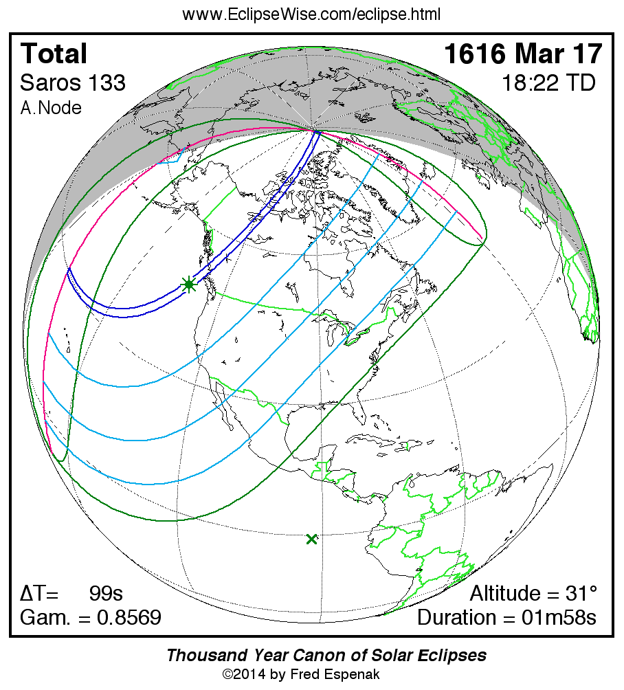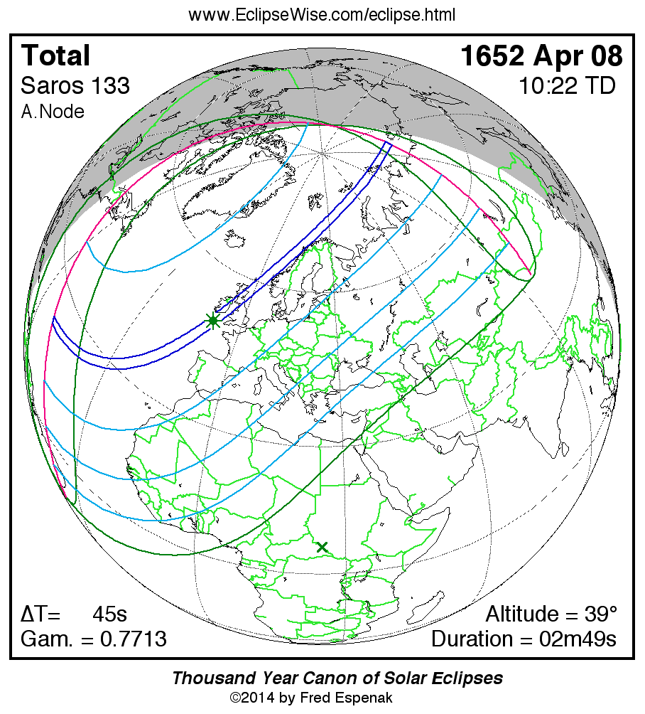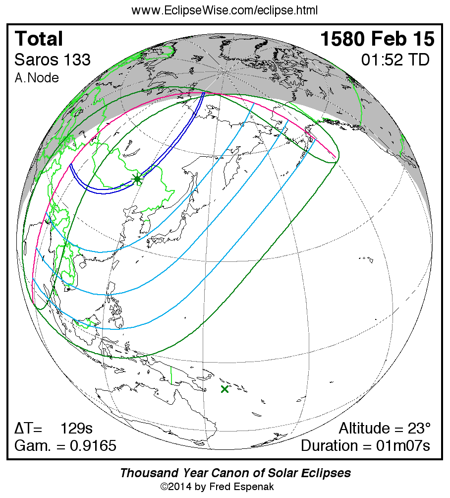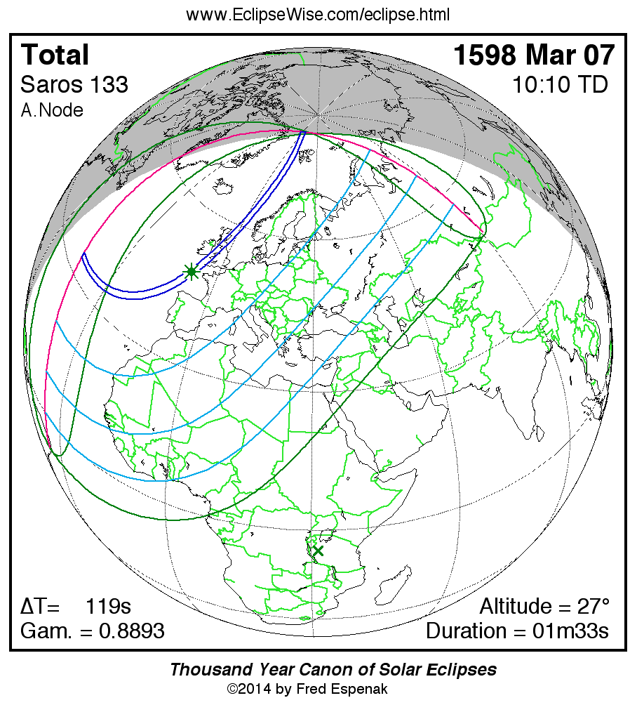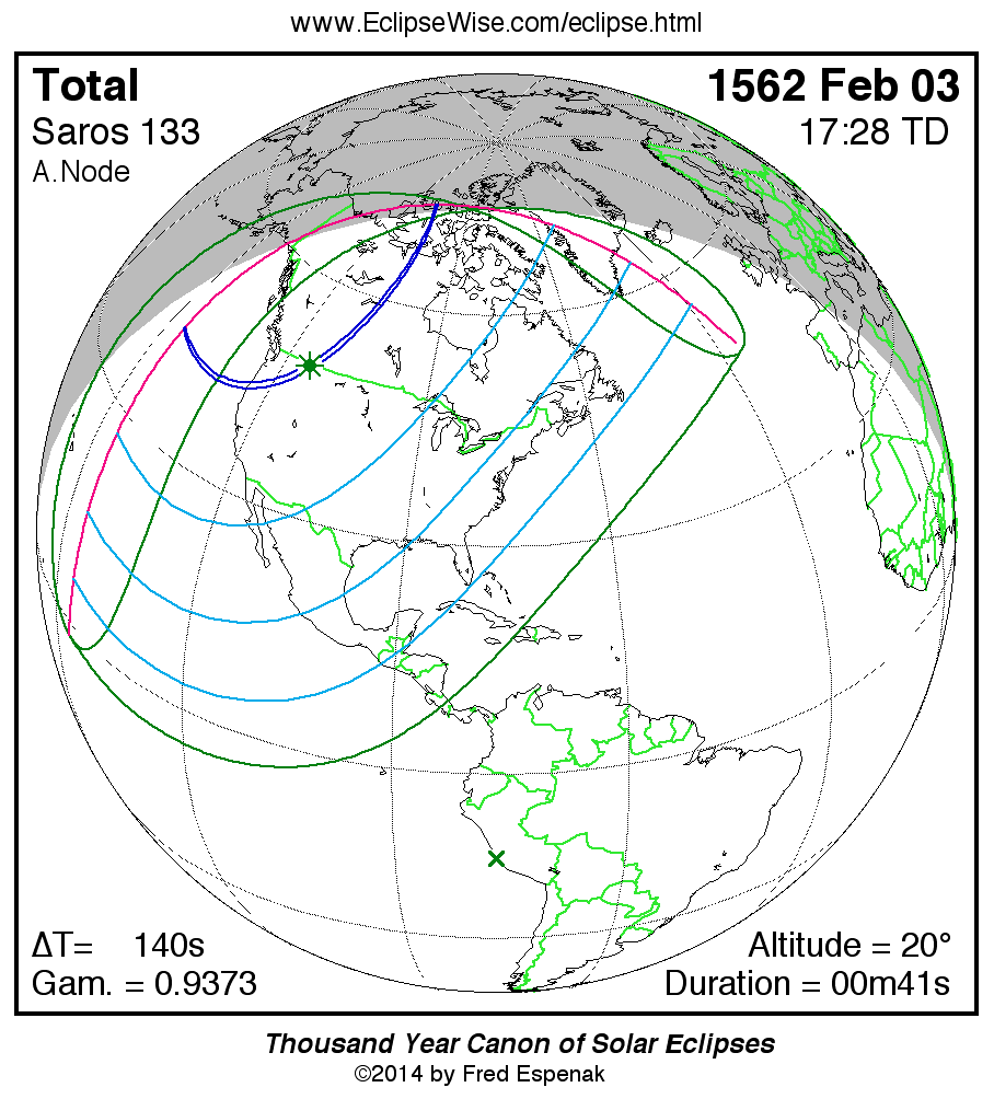Shortest Total Solar Eclipse 1562 Feb 0300m41s -