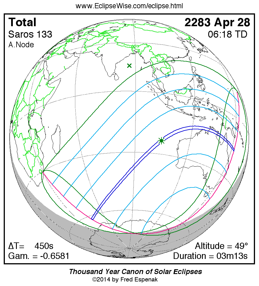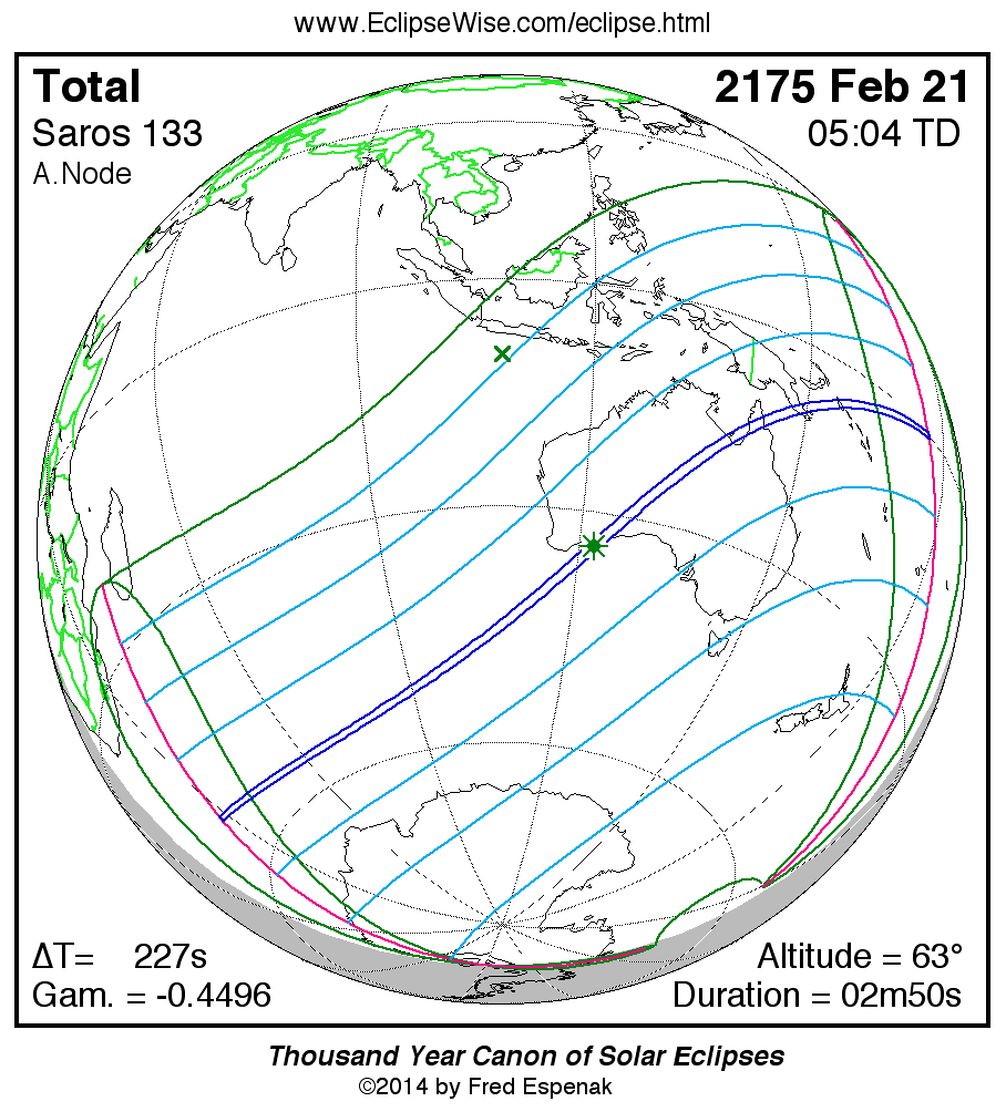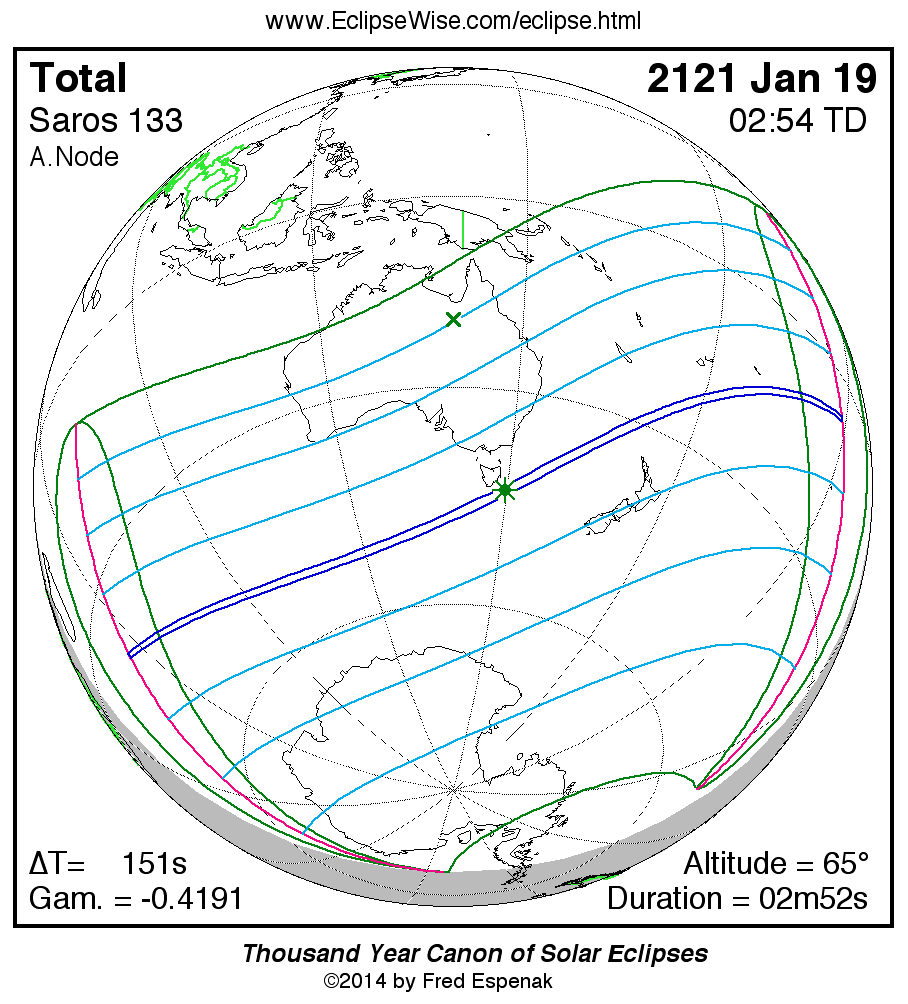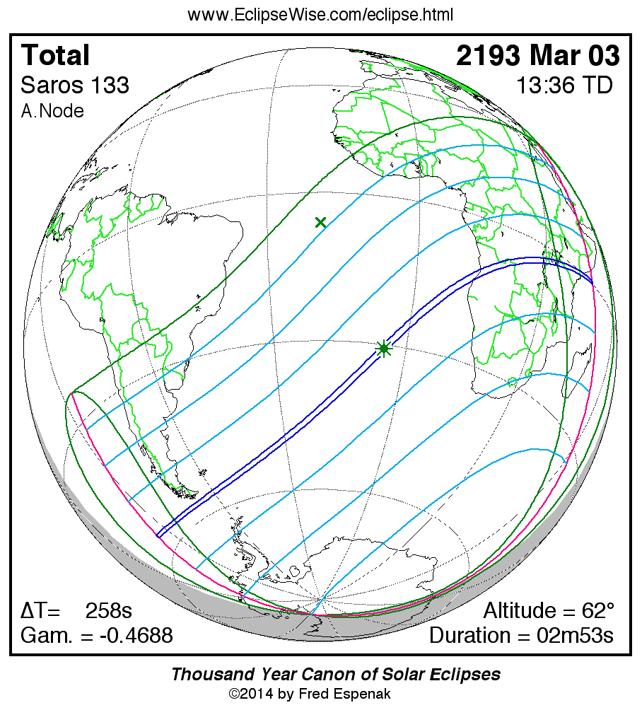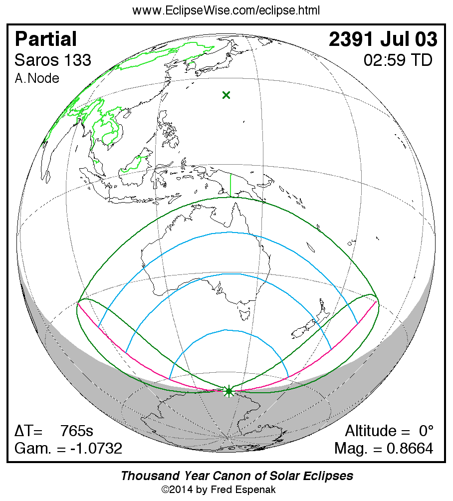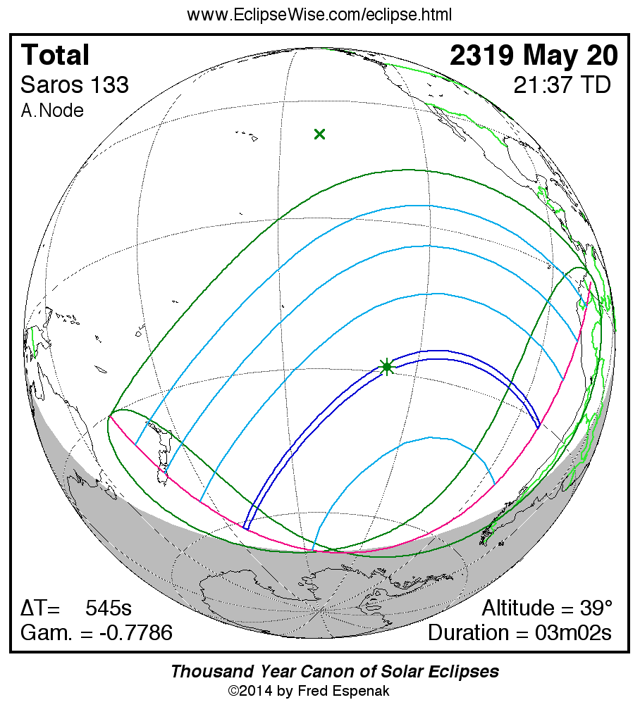 The longest and shortest central eclipses of Saros 133 as well as largest and smallest partial eclipses appear below.