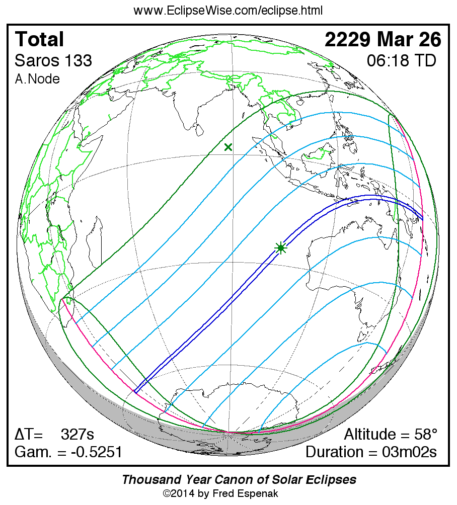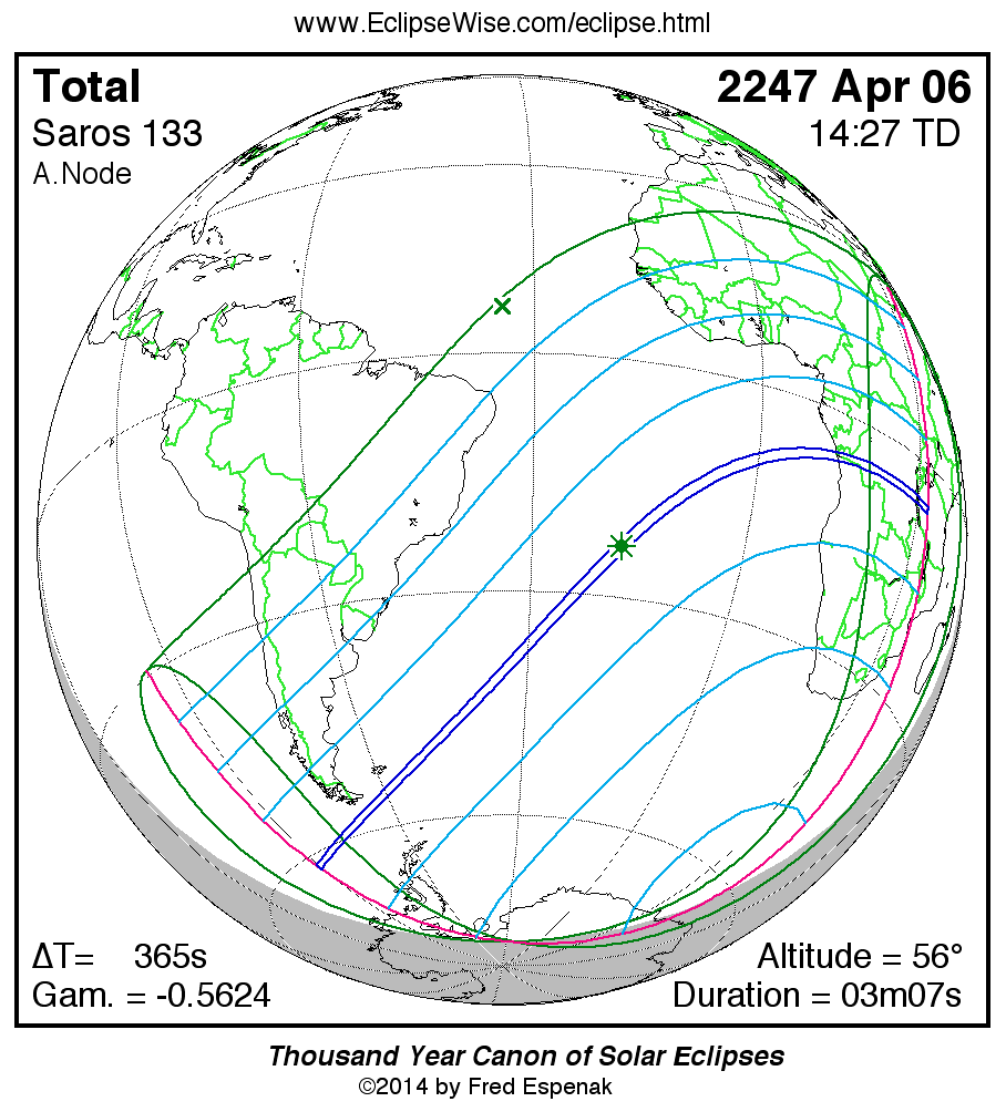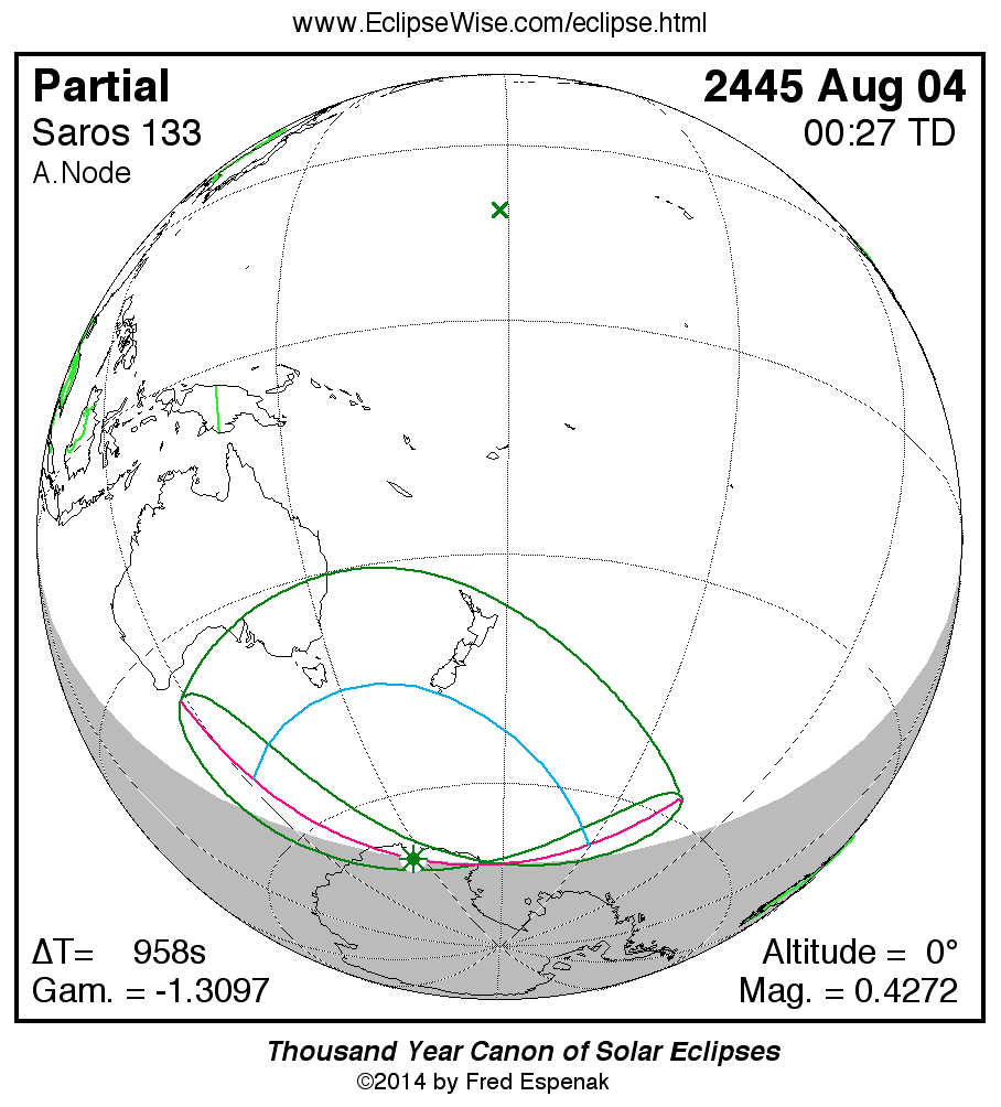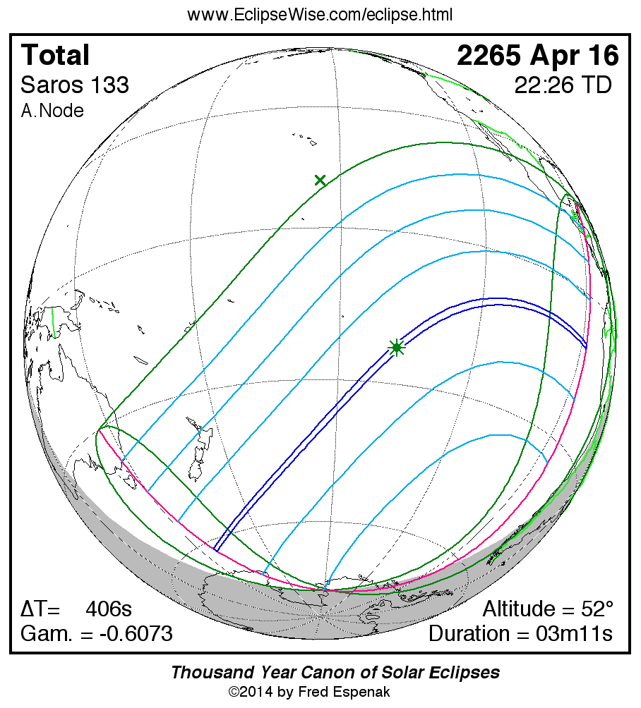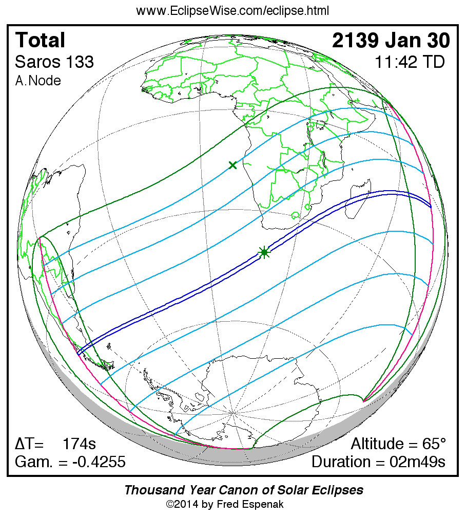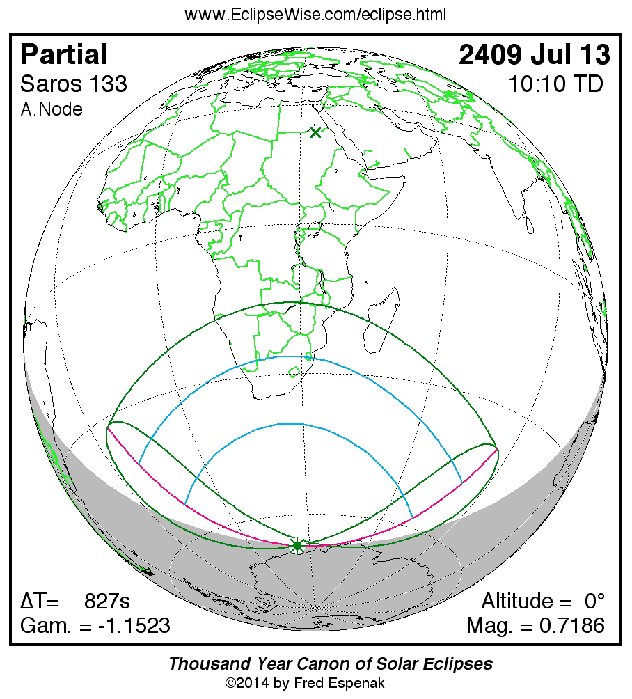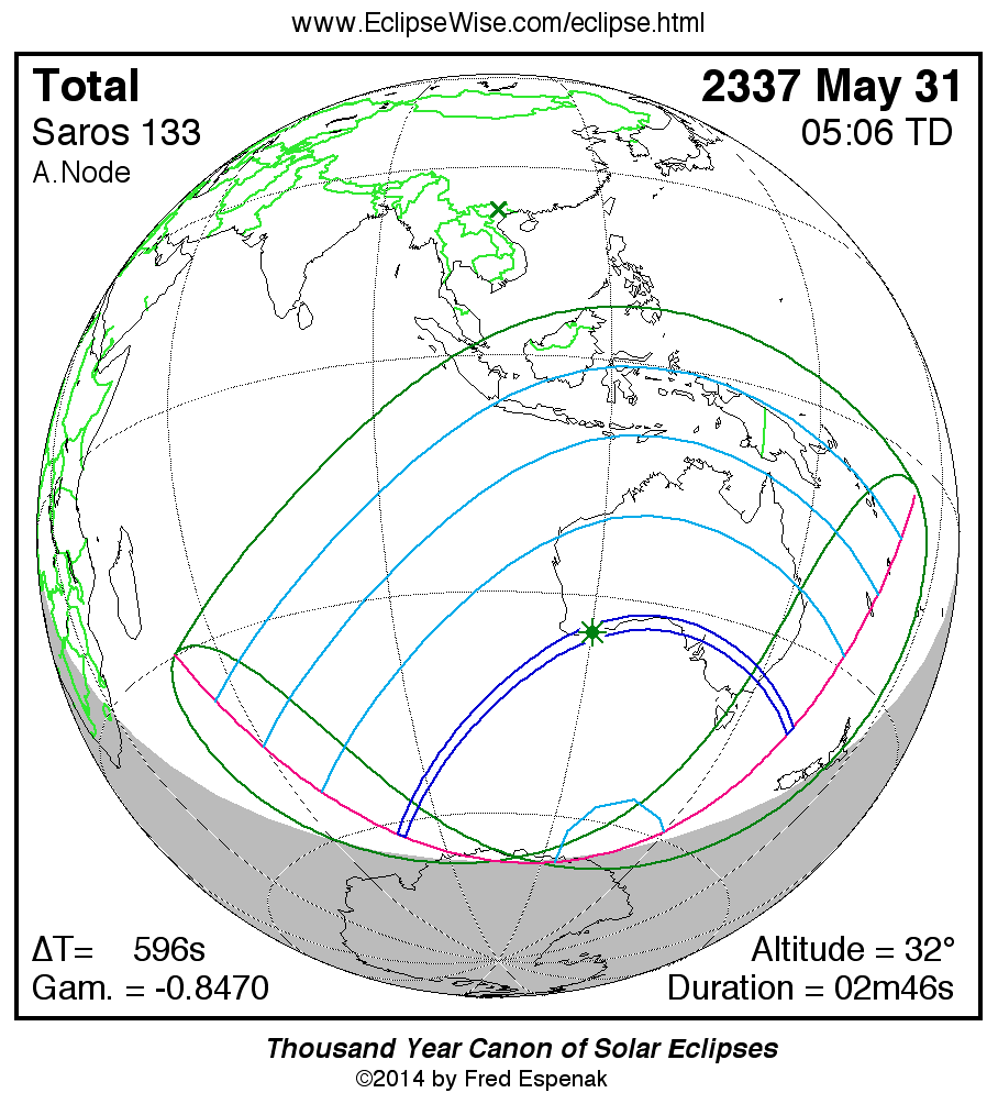 The longest and shortest central eclipses of Saros 133 as well as largest and smallest partial eclipses appear below.