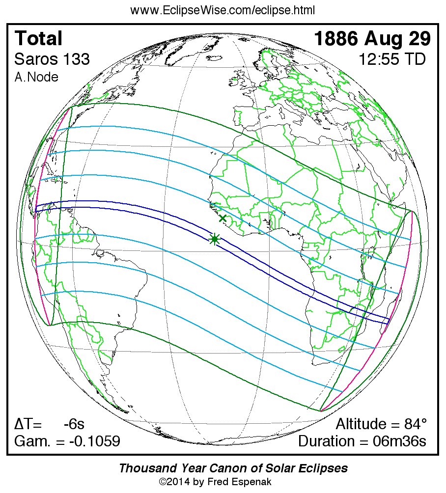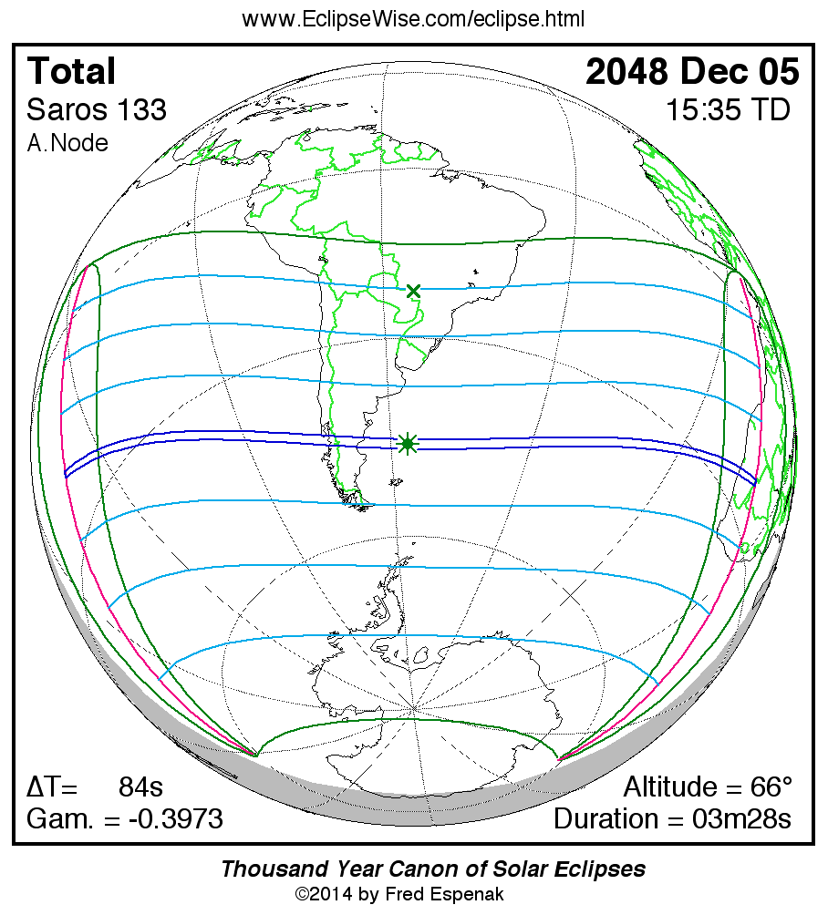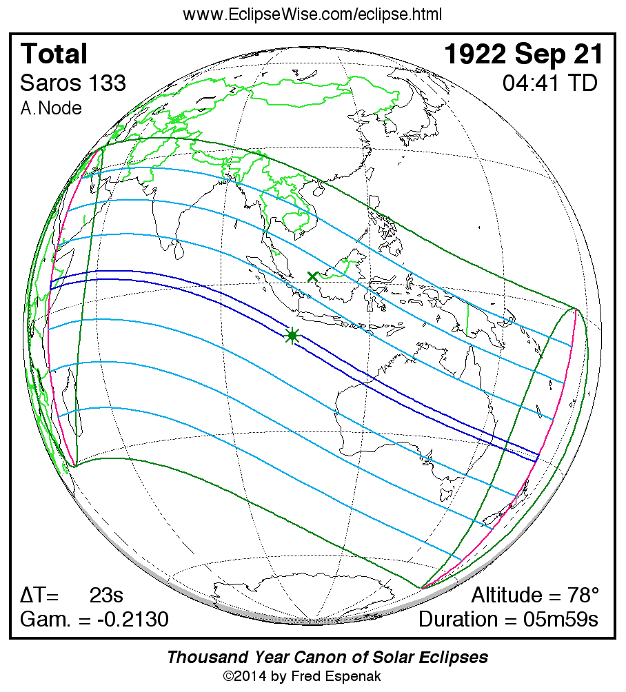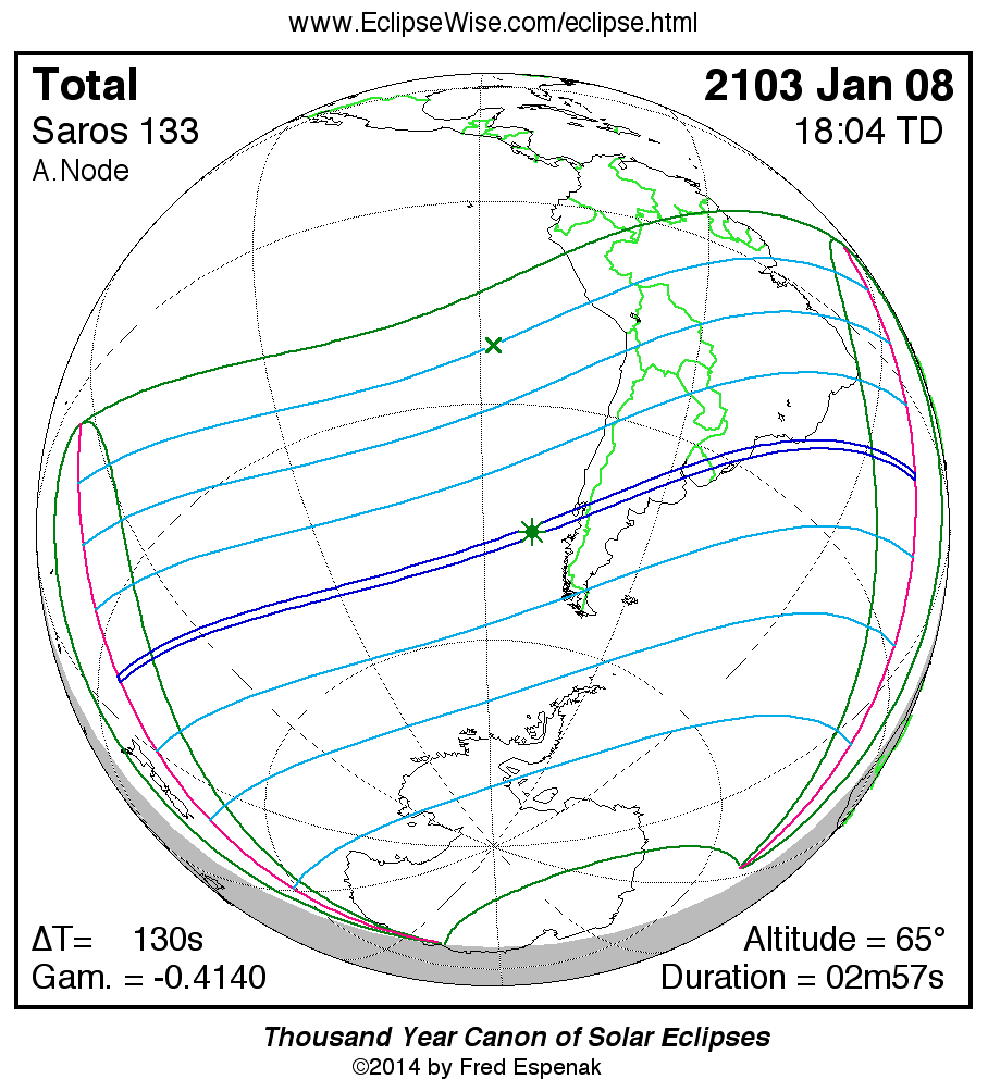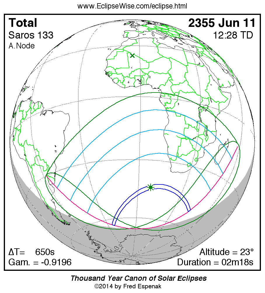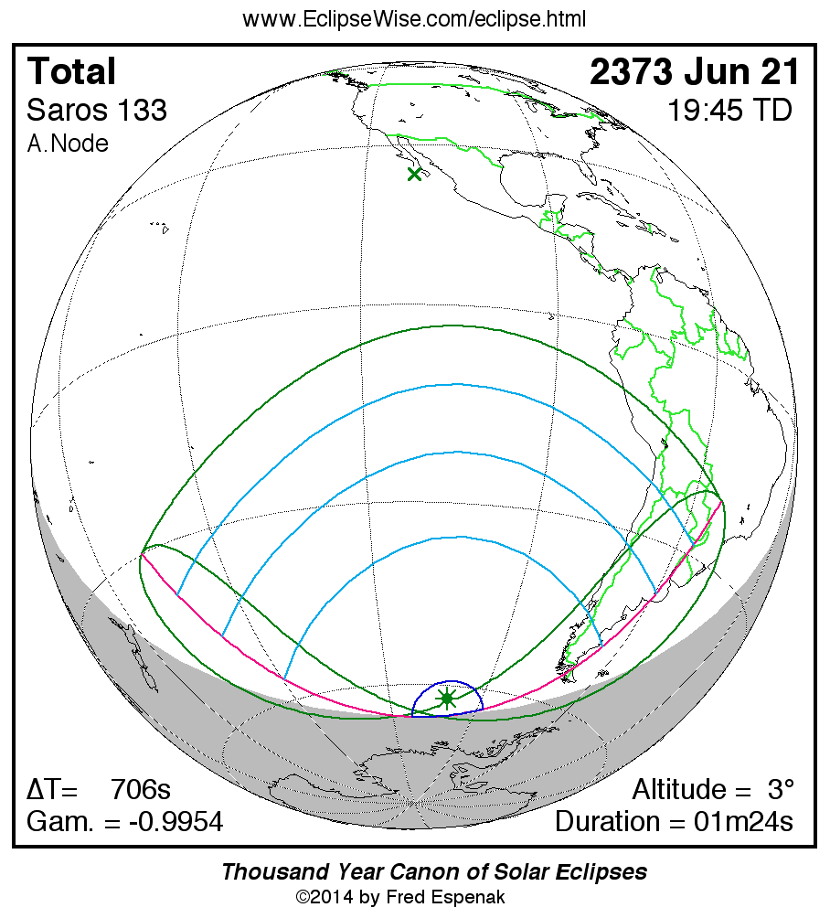 The longest and shortest central eclipses of Saros 133 as well as largest and smallest partial eclipses appear below.