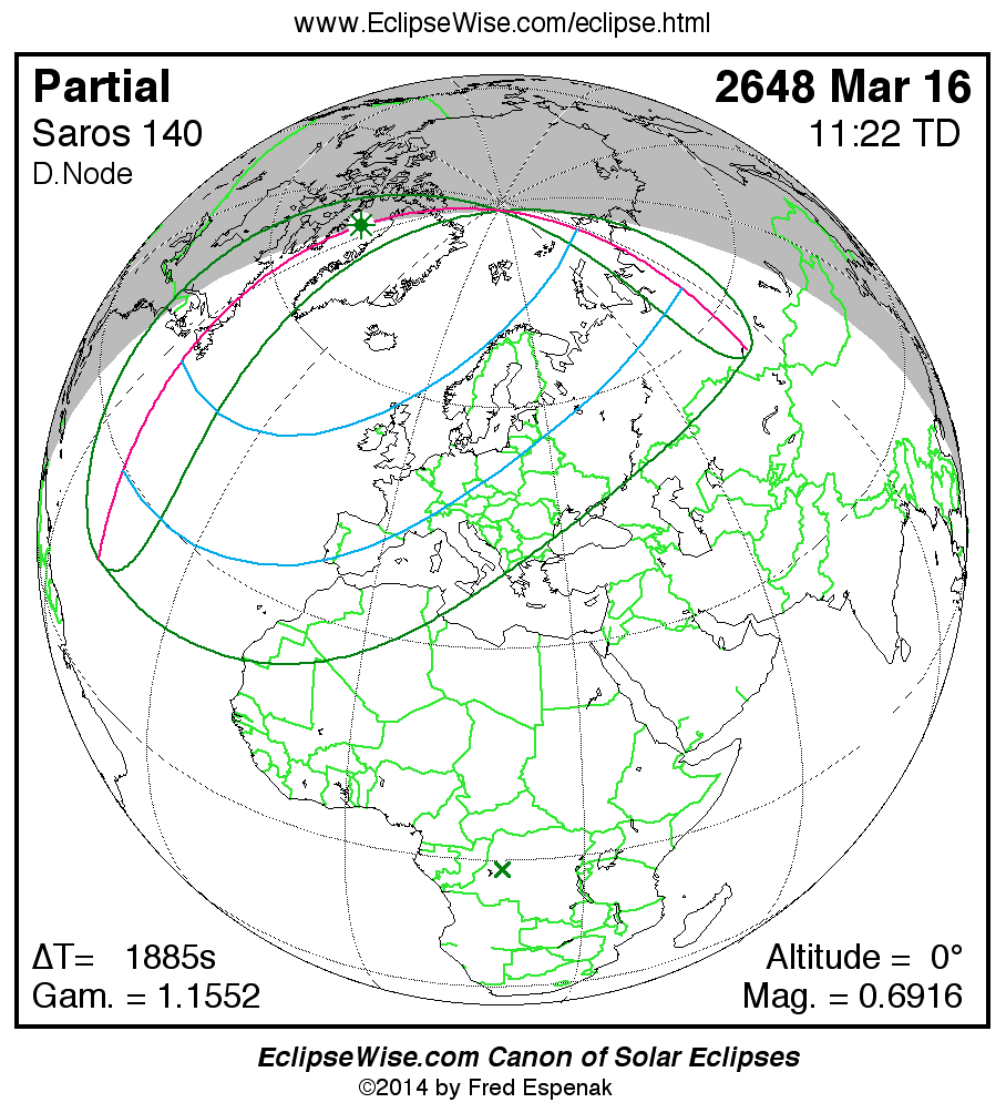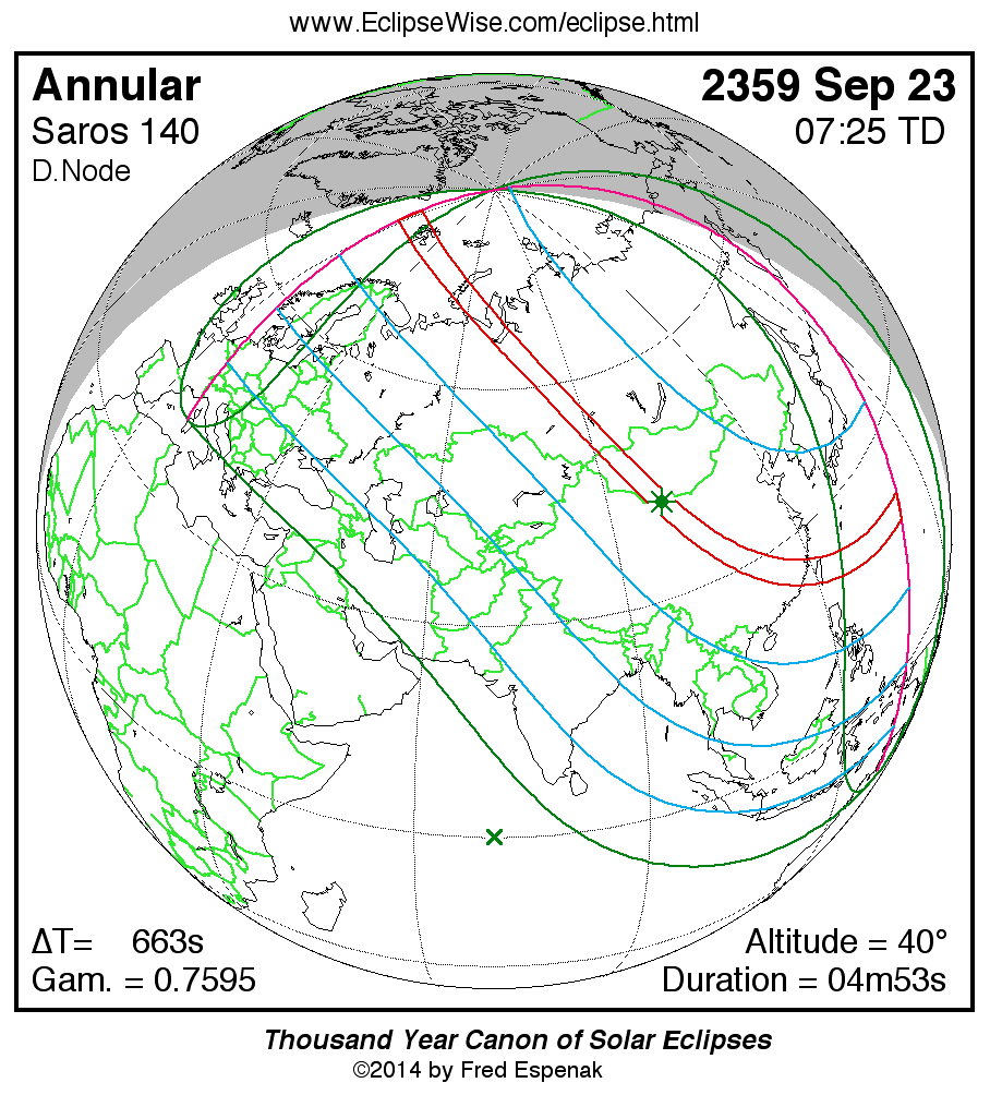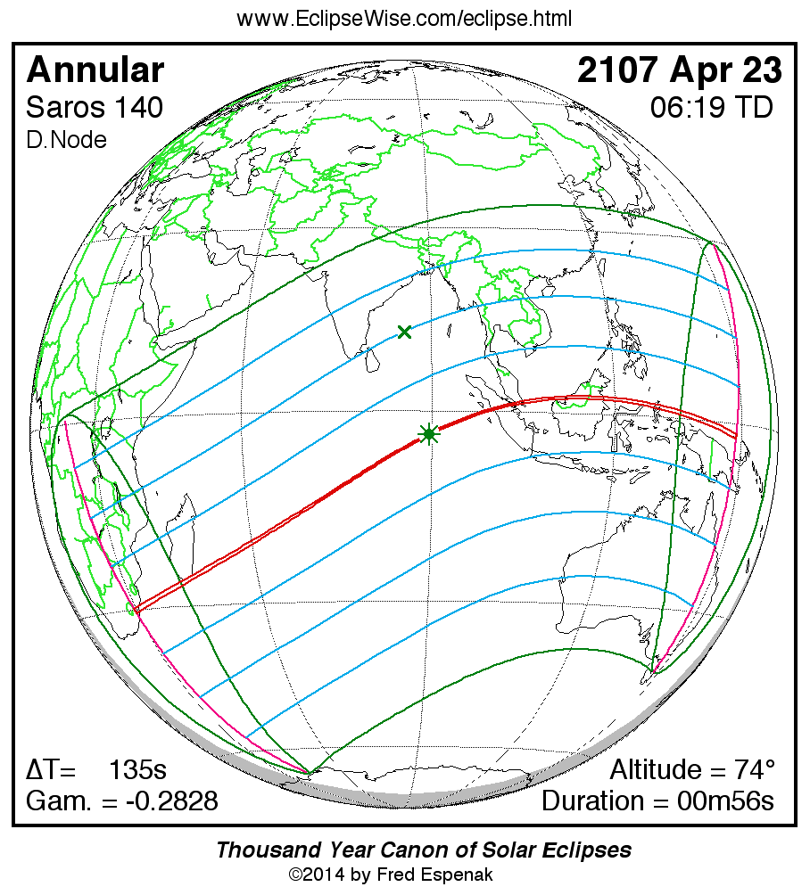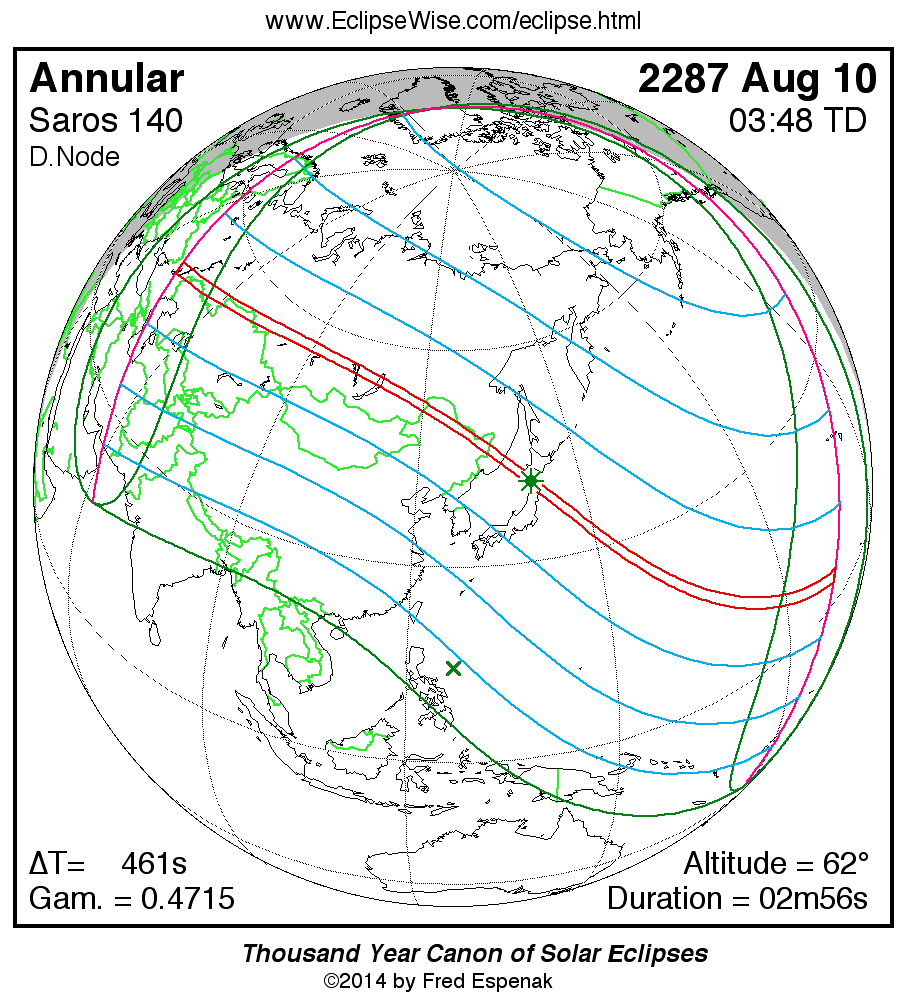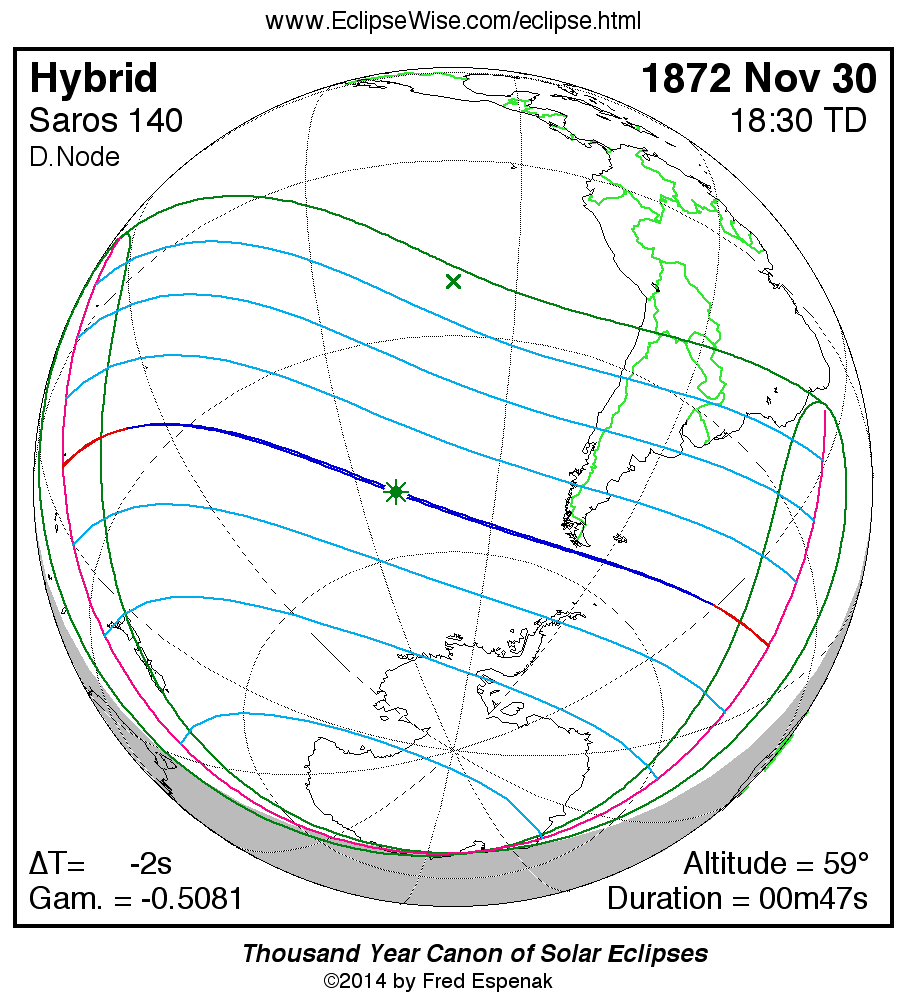 A panorama of all solar eclipses belonging to Saros 140 is presented here. Each map depicts the geographic region of visibility for a single eclipse. For central eclipses, the total or annular path is plotted in either blue (total) or red (annular). The date and time is given for the instant of Greatest Eclipse. Every map serves as a hyperlink to the EclipseWise Prime page for that eclipse where a larger map and complete details for the eclipse can be found. Visit the Key to Solar Eclipse Maps for a detailed explanation of these maps. Near the bottom of the page are a series of hyperlinks for more on solar eclipses.