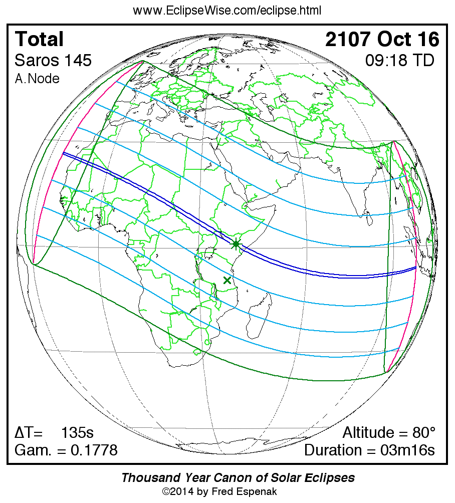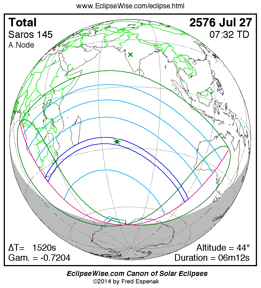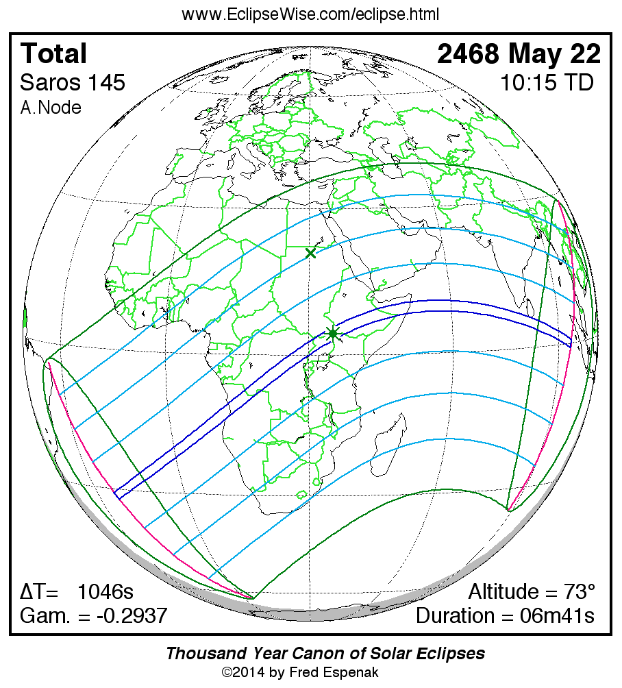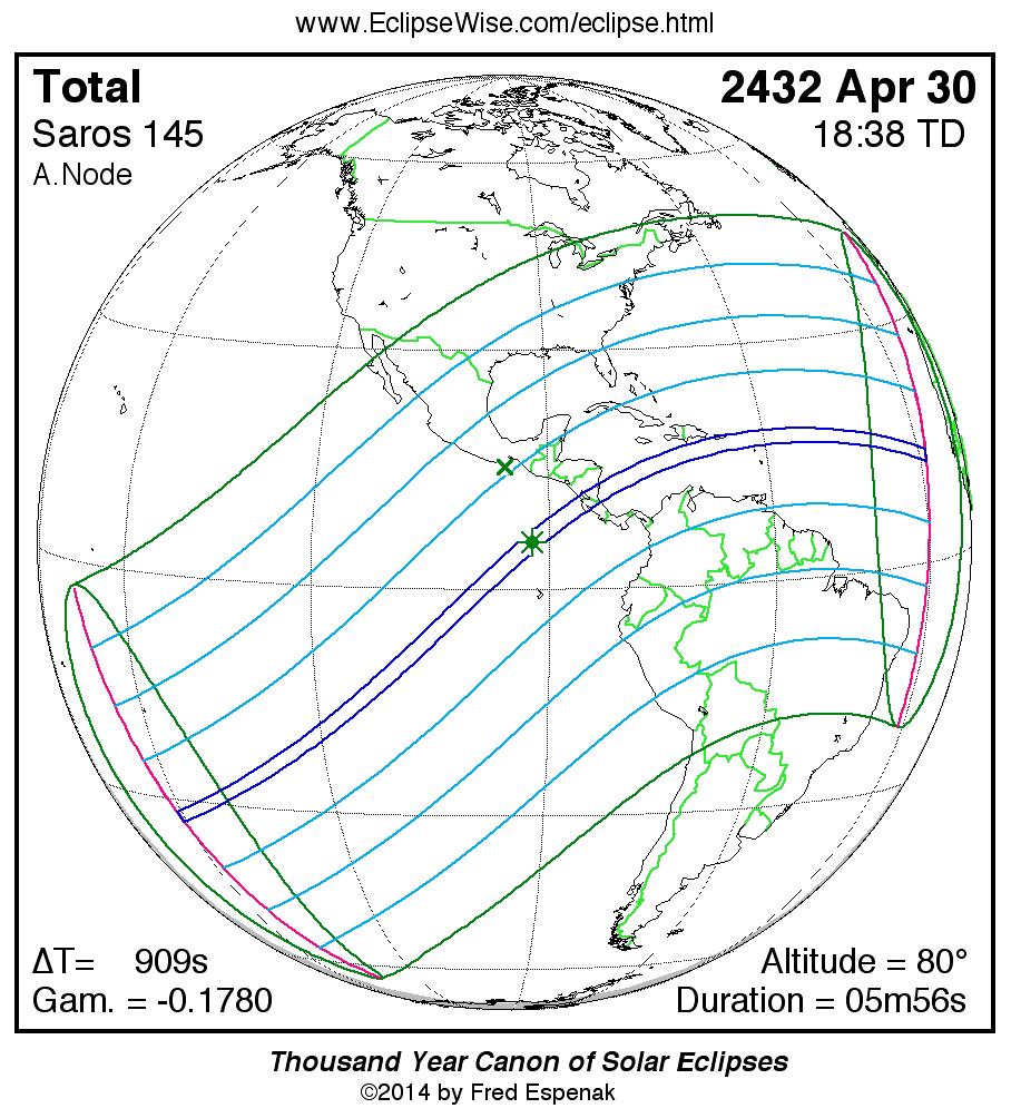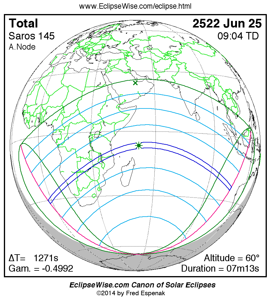 The Saros panorama below is arranged in horizontal rows of 3 eclipses. So one eclipse to the left or right is a difference of 1 Saros cycle, and one eclipse above or below is a difference of 1 exeligmos. By scanning a column of the table, it reveals how the geographic visibility of eclipses separated by an exeligmos slowly changes.