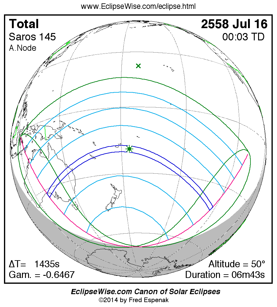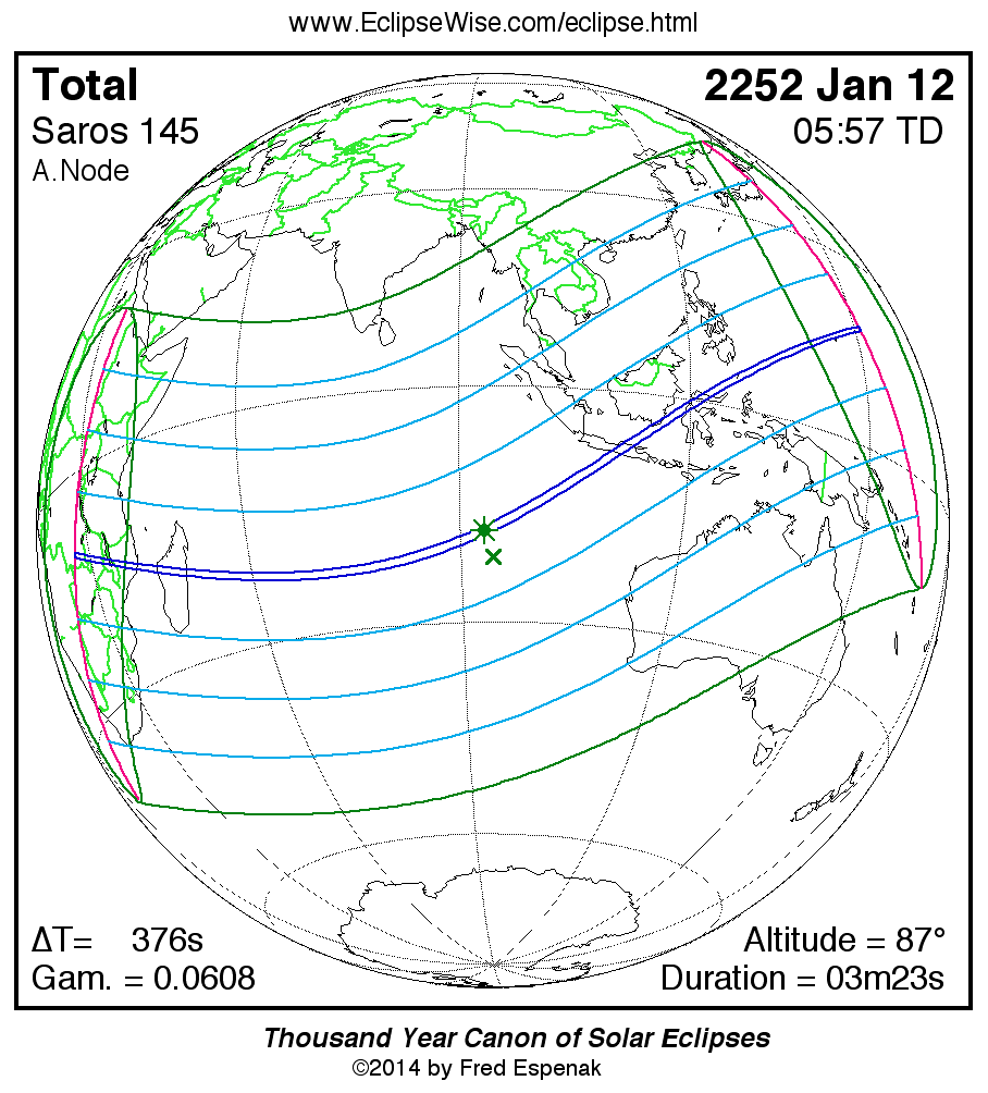 A panorama of all solar eclipses belonging to Saros 145 is presented here. Each map depicts the geographic region of visibility for a single eclipse. For central eclipses, the total or annular path is plotted in either blue (total) or red (annular). The date and time is given for the instant of Greatest Eclipse. Every map serves as a hyperlink to the EclipseWise Prime page for that eclipse where a larger map and complete details for the eclipse can be found. Visit the Key to Solar Eclipse Maps for a detailed explanation of these maps. Near the bottom of the page are a series of hyperlinks for more on solar eclipses.