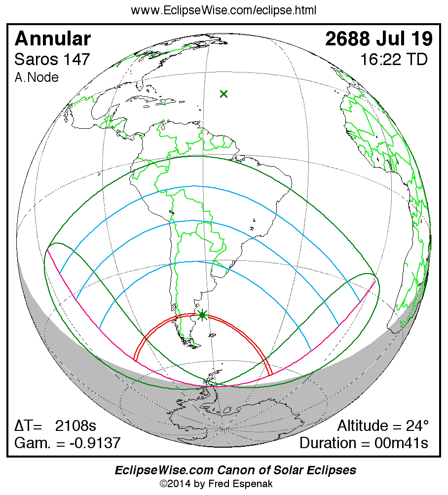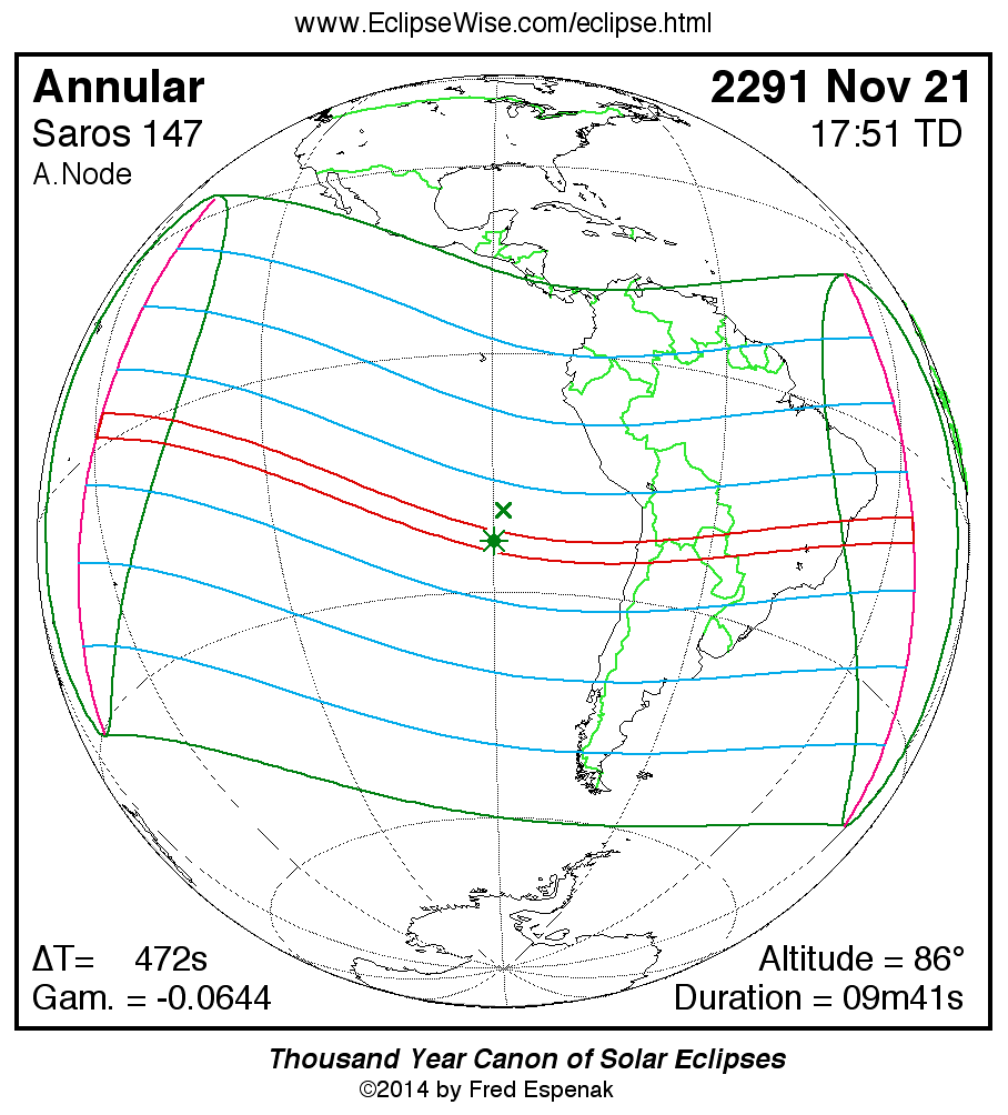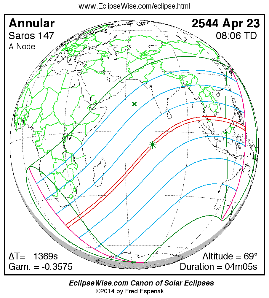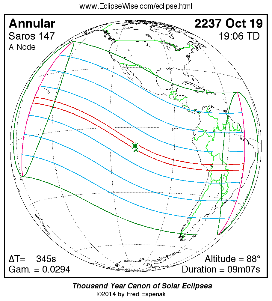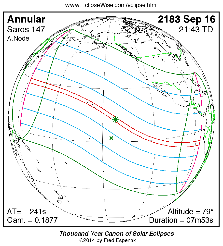A panorama of all solar eclipses belonging to Saros 147 is presented here. Each map depicts the geographic region of visibility for a single eclipse. For central eclipses, the total or annular path is plotted in either blue (total) or red (annular). The date and time is given for the instant of Greatest Eclipse. Every map serves as a hyperlink to the EclipseWise Prime page for that eclipse where a larger map and complete details for the eclipse can be found. Visit the Key to Solar Eclipse Maps for a detailed explanation of these maps. Near the bottom of the page are a series of hyperlinks for more on solar eclipses.