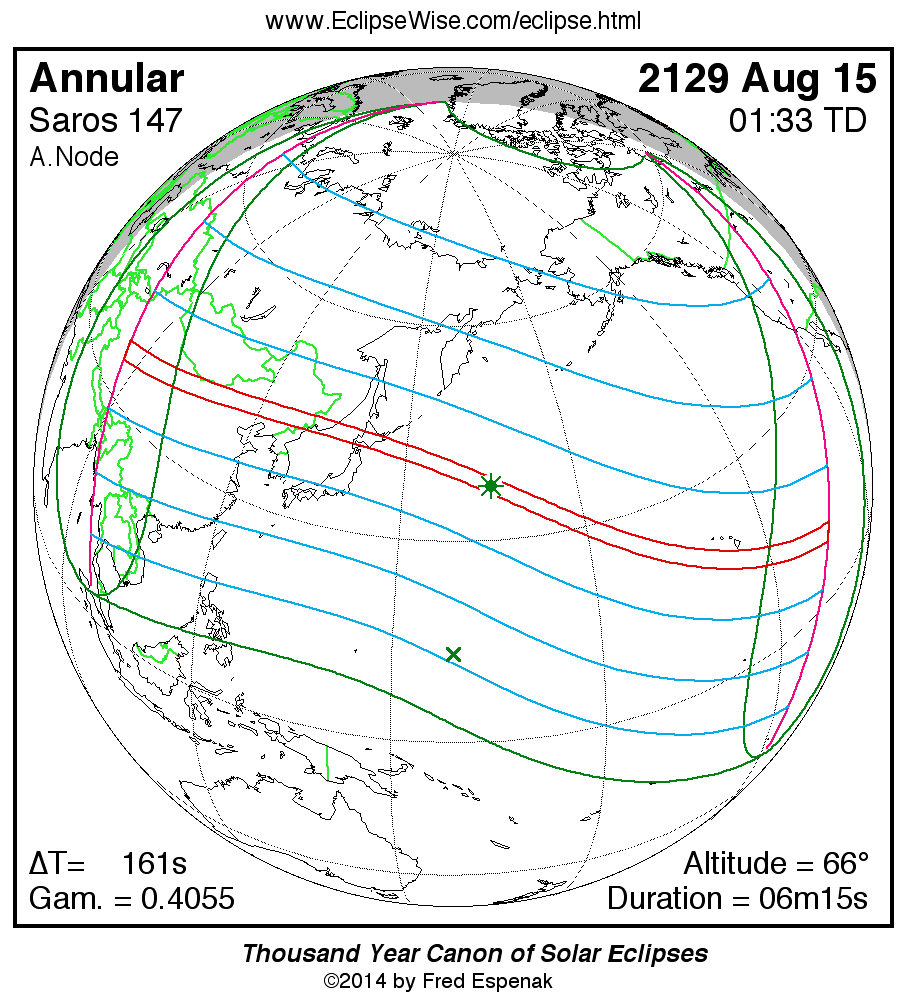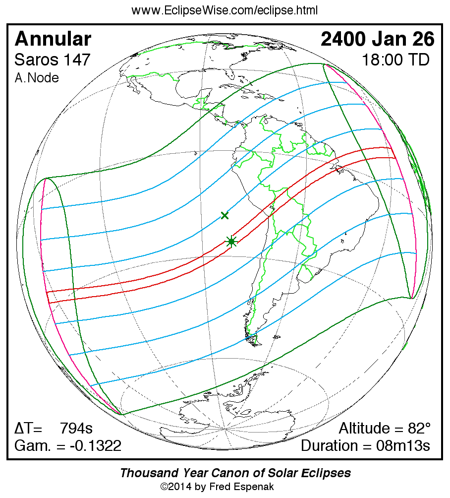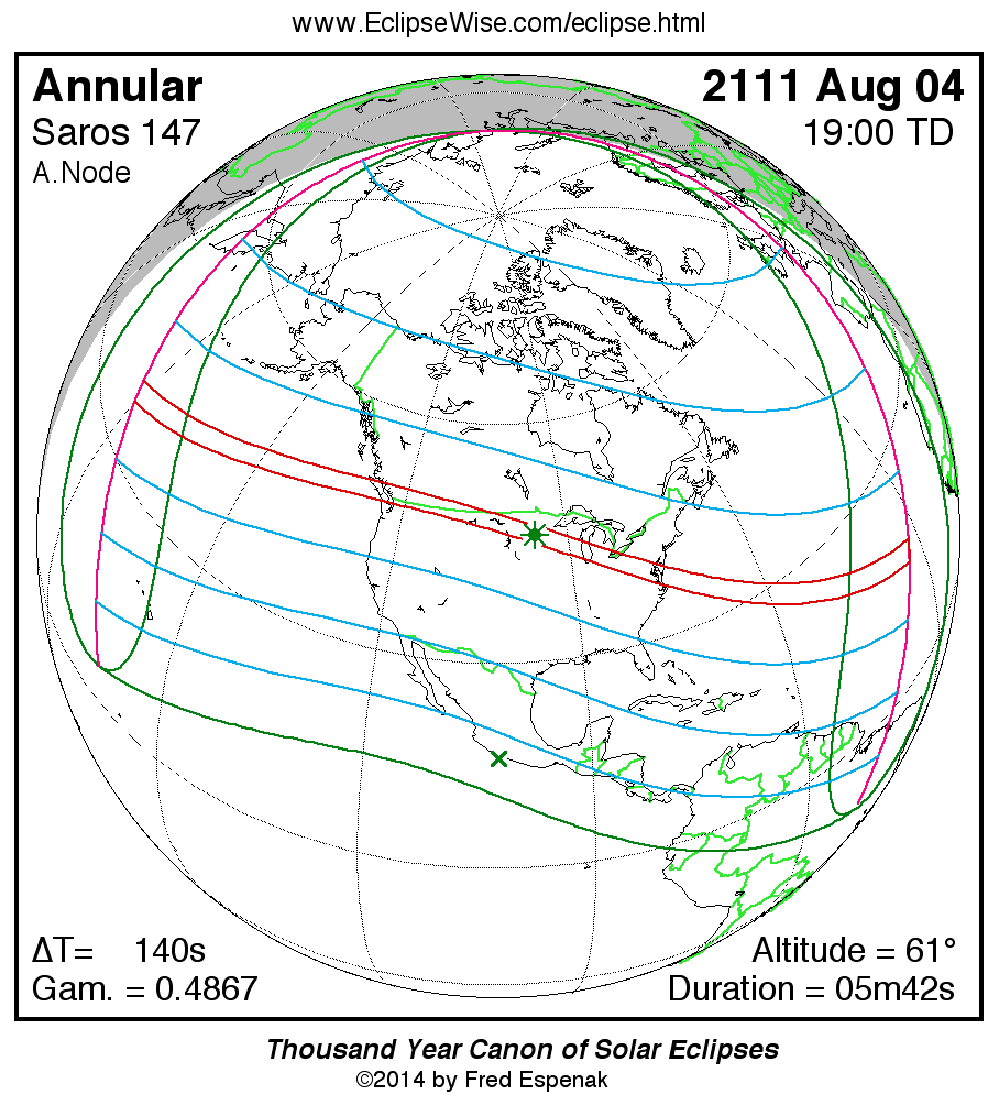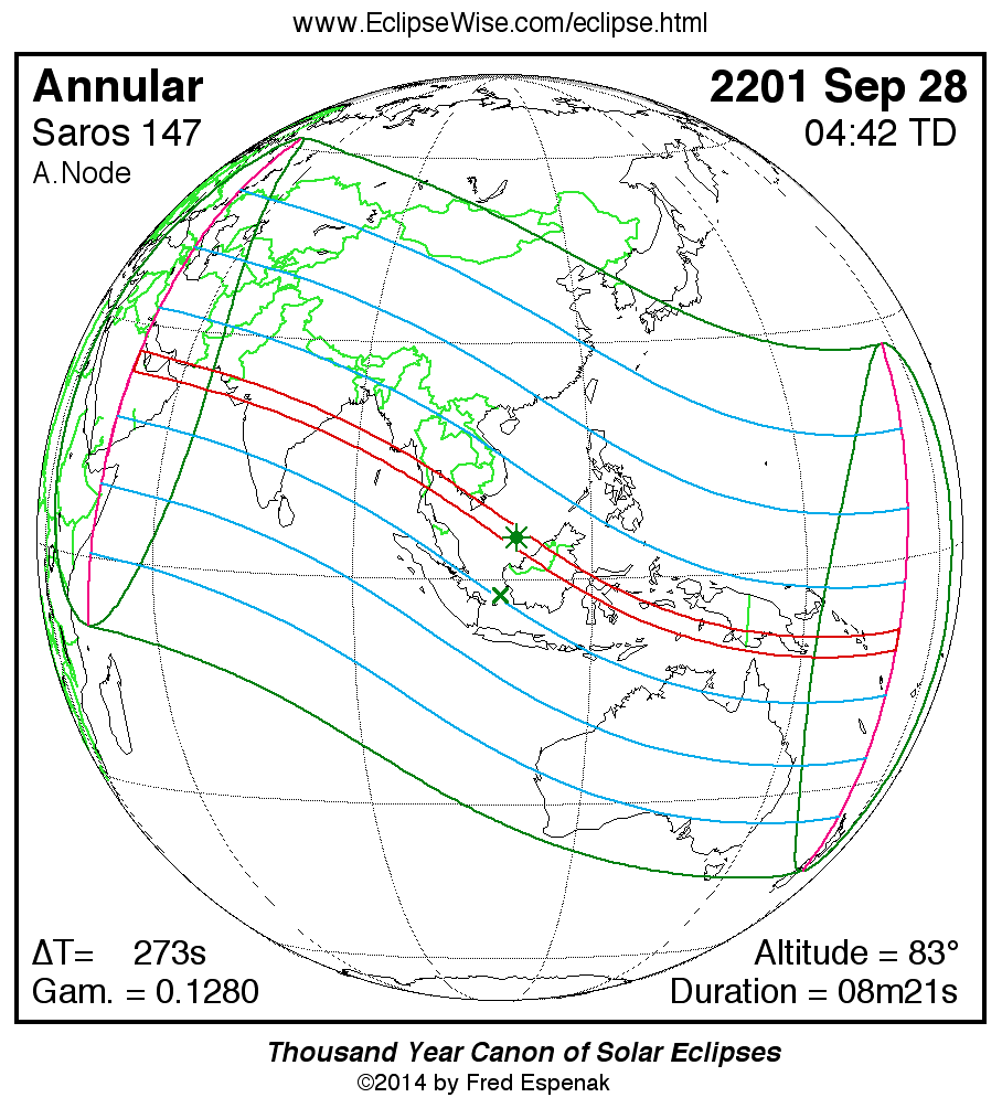 A panorama of all solar eclipses belonging to Saros 147 is presented here. Each map depicts the geographic region of visibility for a single eclipse. For central eclipses, the total or annular path is plotted in either blue (total) or red (annular). The date and time is given for the instant of Greatest Eclipse. Every map serves as a hyperlink to the EclipseWise Prime page for that eclipse where a larger map and complete details for the eclipse can be found. Visit the Key to Solar Eclipse Maps for a detailed explanation of these maps. Near the bottom of the page are a series of hyperlinks for more on solar eclipses.